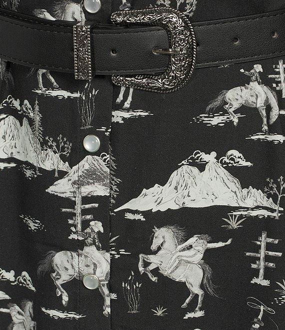 From Reba, this dress features: Shirt dress silhouette Woven twill fabrication Holiday cowboy print Point collar Long sleeves Two chest flap pockets Vegan leather belt with engraved metal buckle Straight hemline Snap front closure Approx. 52" length Cotton/rayon Hand wash cold Imported.