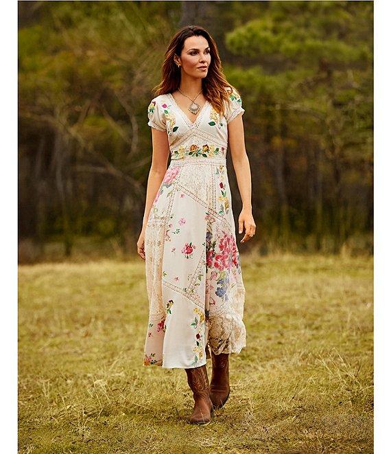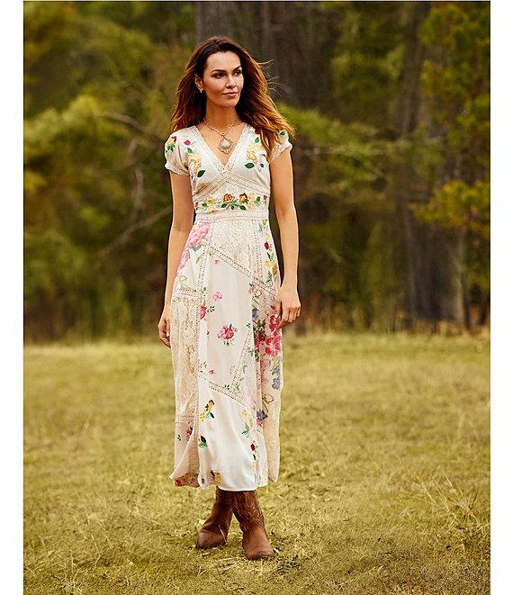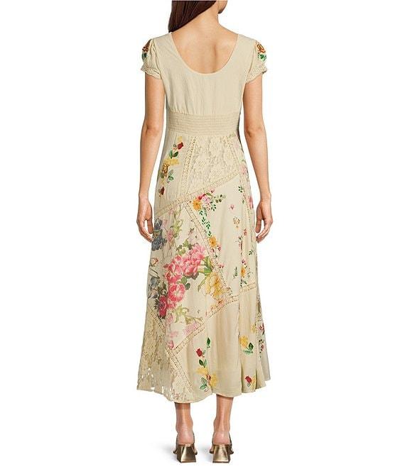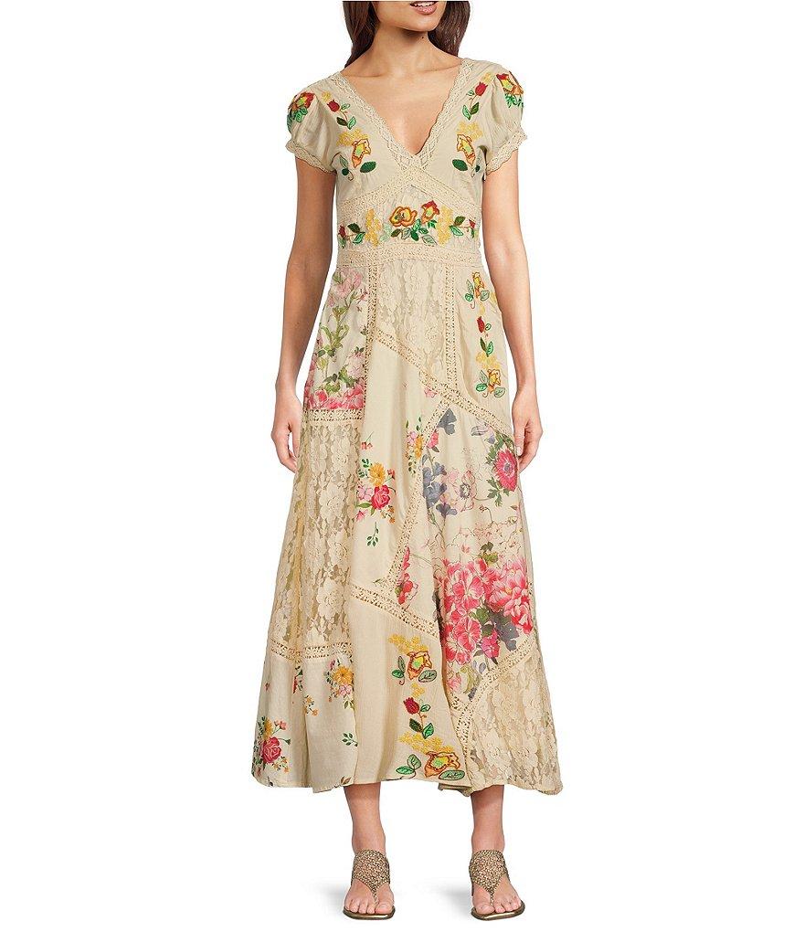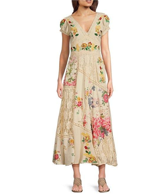 From Reba, this dress features: A-line silhouette Patchwork floral print V-neckline Cap sleeves Embroidered details Maxi length Straight hemline Side zipper closure Approx. 52" in length Cotton/nylon Hand wash Imported.