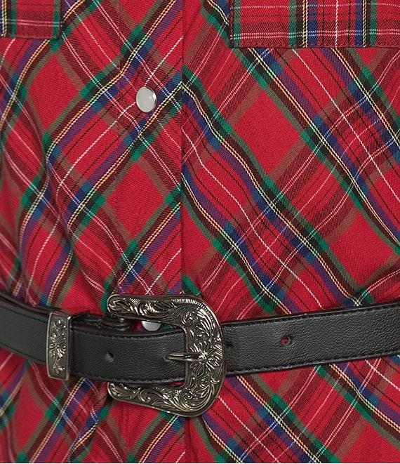 From Reba, this dress features: Shirt dress silhouette Point collar Long sleeves Plaid print Chest flap pockets Vegan leather belt with engraved metal buckle Straight hemline Snap front closure Approx. 52" length Cotton Hand wash cold Imported.
