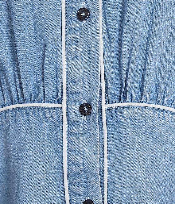From Reba, this dress features: A-line silhouette Point collar neckline Long sleeves with button cuffs Piping trim detail Straight hemline Button front closure Approx. 52" length Lyocell Hand wash Imported.