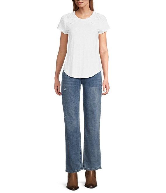 From Reba, these jeans feature: Denim fabrication Straight leg silhouette Relaxed fit Belt loops 5 pocket styling Blasting, whickering and slight distress tears for vintage look Front fly zip and button closure Approx. 30" inseam Cotton/Tencel Machine wash/tumble dry Imported.