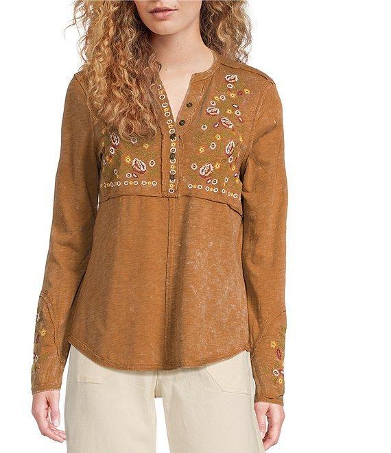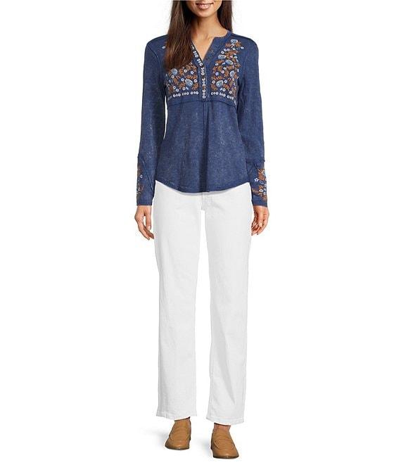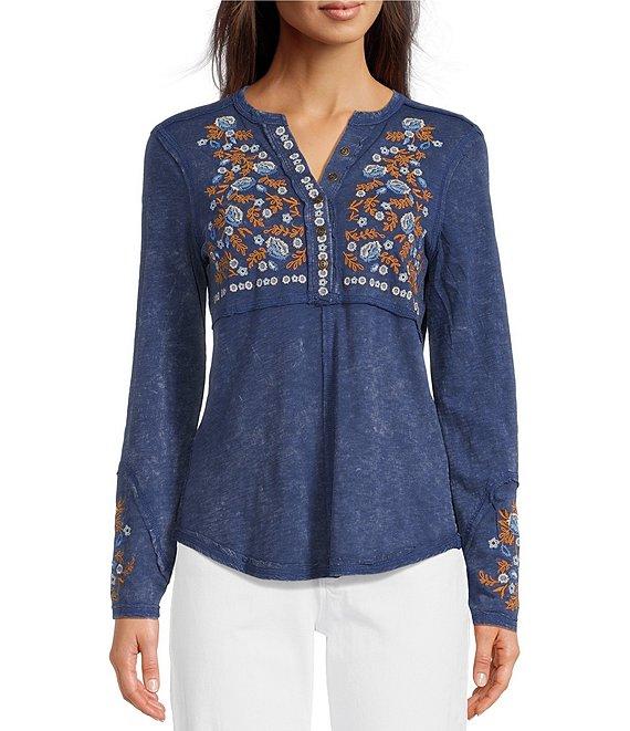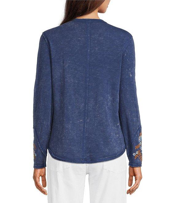 Reba Sedona Scoop Neck Long Sleeve Embroidered Henley Tee