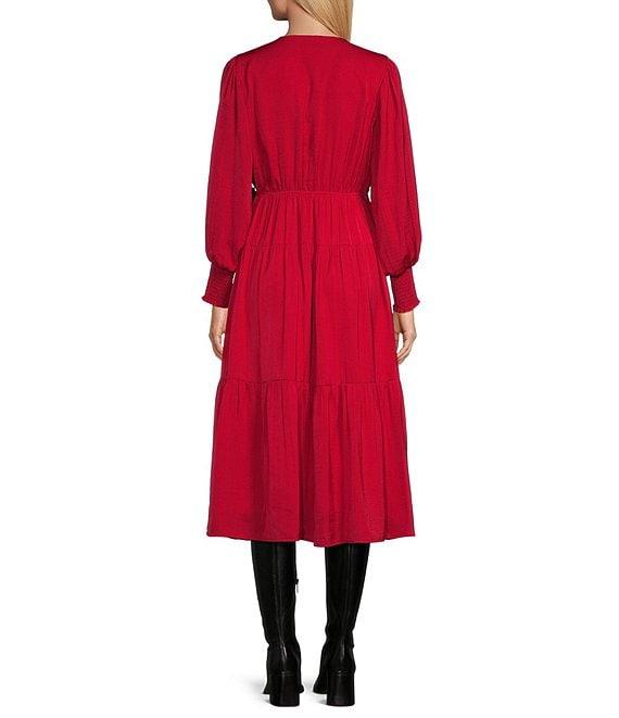 Reba V-Neck Plisse Satin V-Neck Smocked Sleeve Tiered Wrap Dress
