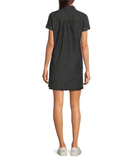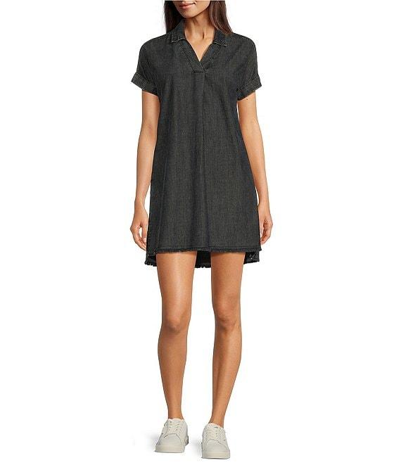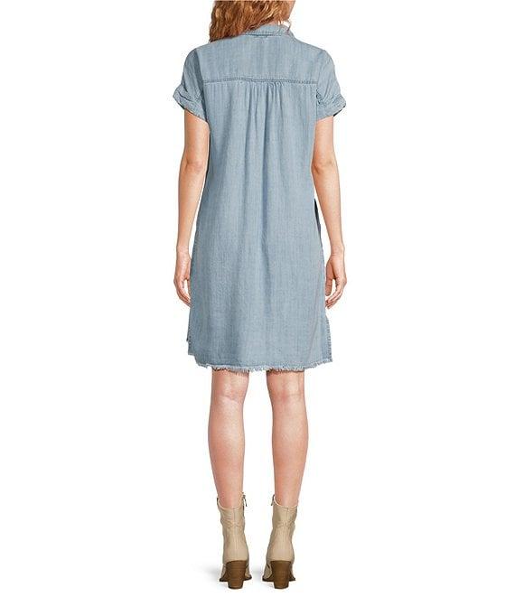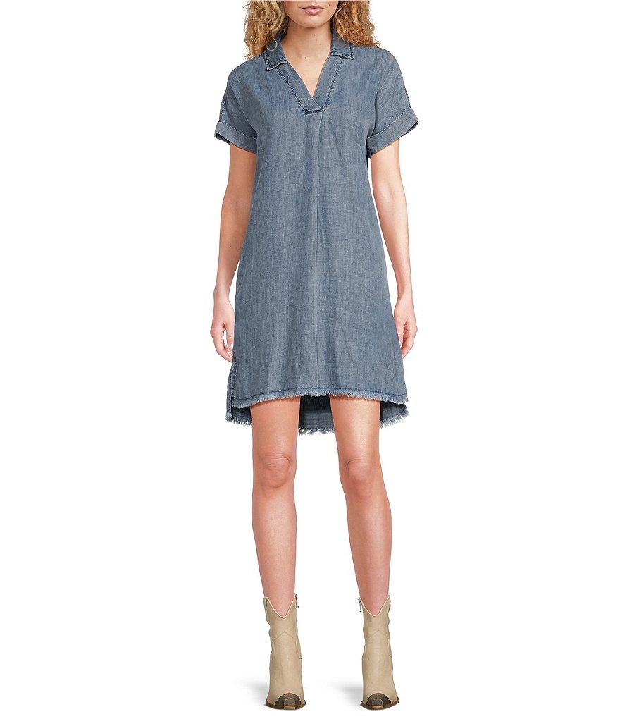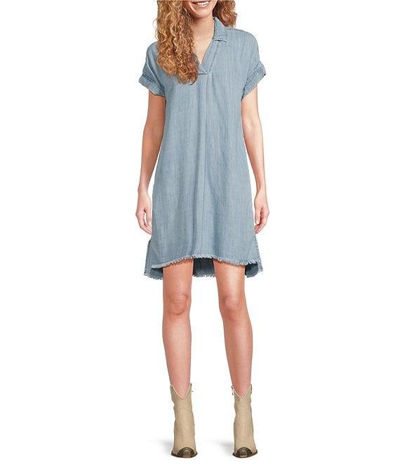 From Reba, this dress features:Chambray fabricationV-neckline with point collarShort cap sleeves with cuffsSide pocketsFrayed hemlinePullover constructionApprox. 36" lengthTencel Hand washImported.