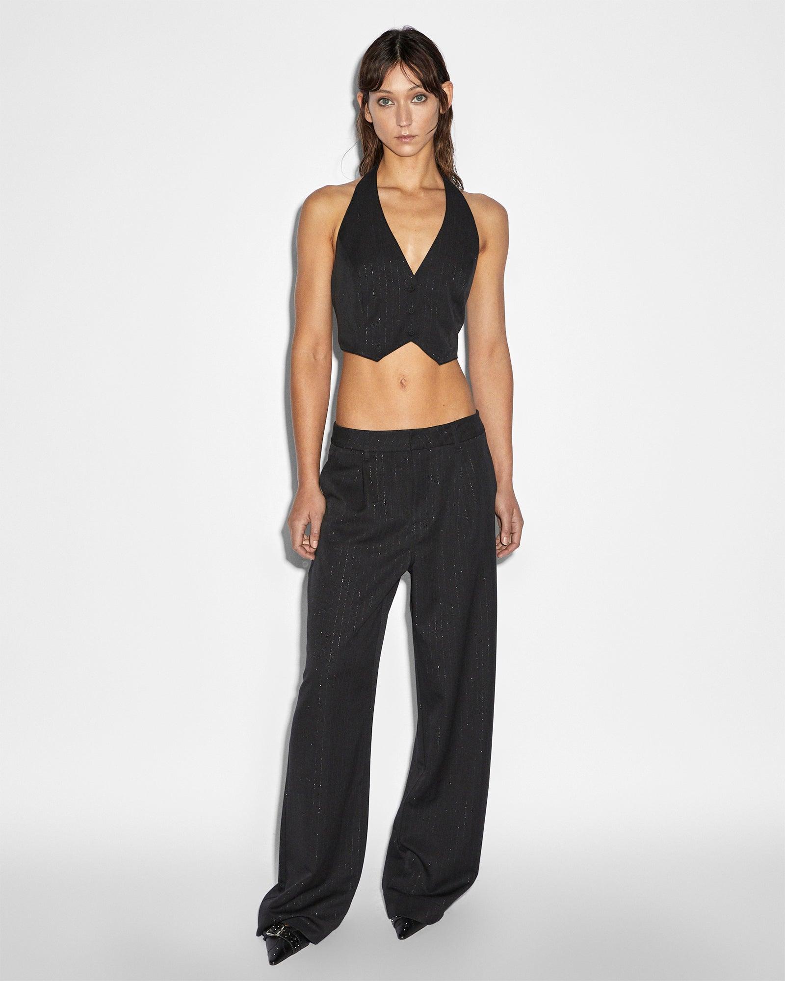The Rebel Waistcoat Pinstripe is a sleeveless fitted halter waistcoat made from a quality tailored black fabric with silver pinstripes through it. The front closure consists of 3 buttons with a peak waistcoat hem. The back features a waist adjustable buckle and branded snaps at the back neck for adjustment.
