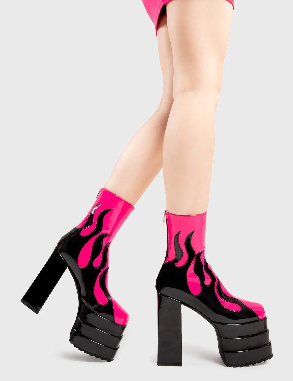 Set Things on FireReborn Platform Ankle Boots in Fuchsia faux leather. These platform boots feature a black flame design on our triple stack platform sole. Made with eco-friendly materials and 100% cruelty-free, these platform boots are as ethical as they are Fire.- Platform Height- Heel Height- Black zip- Flame design- High Heel- Triple Stack platform sole- 100% vegan SKU: LMF 2998 - FuchsiaPU/Flame