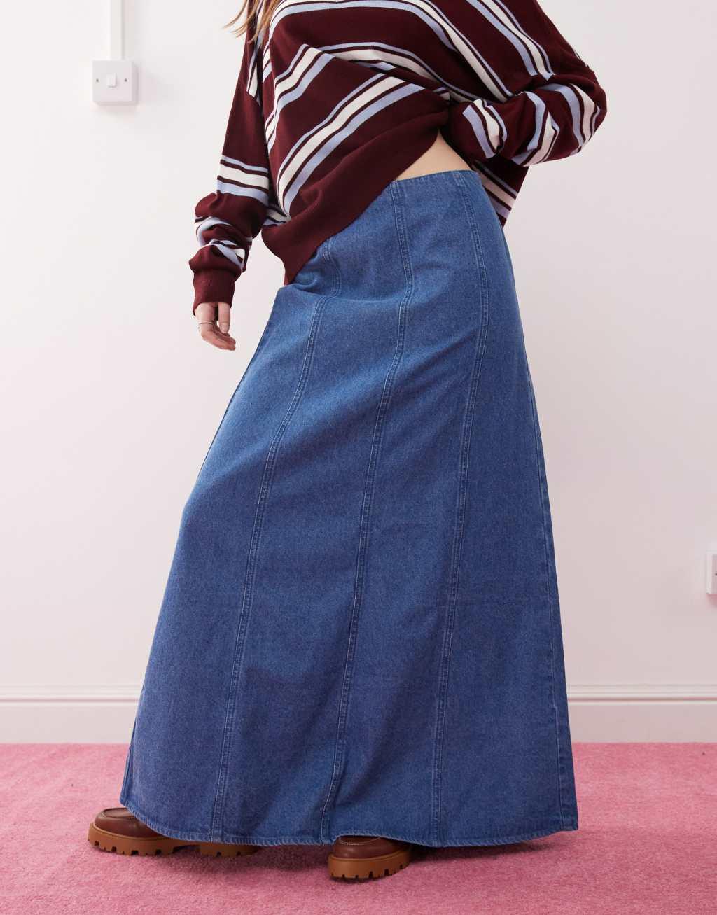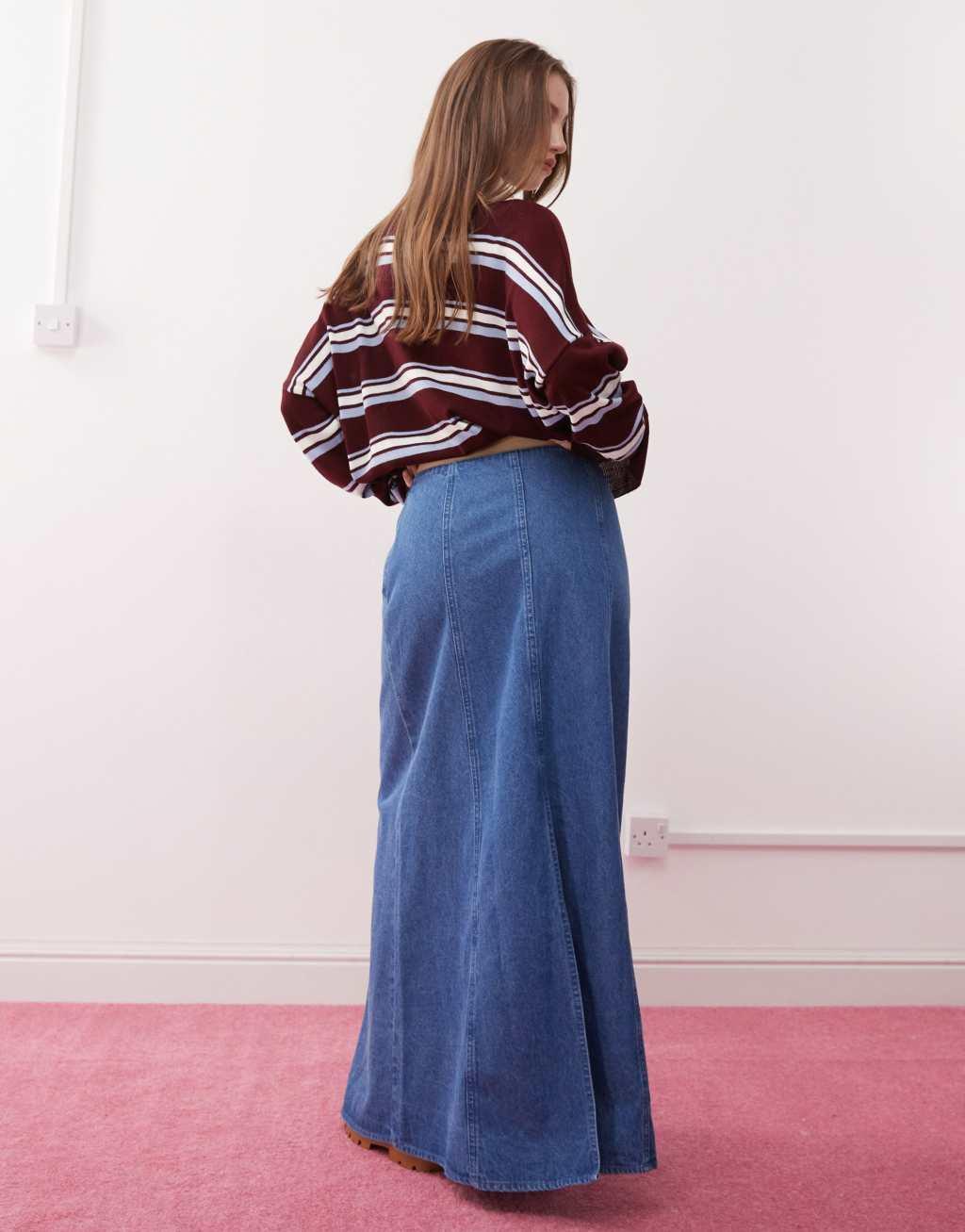 Reclaimed Vintage denim maxi skirt in mid blue