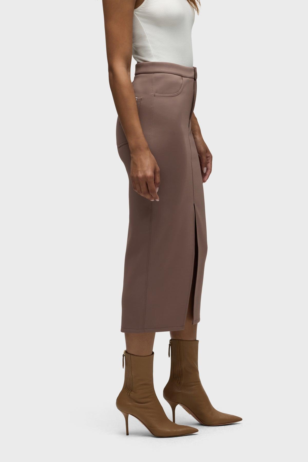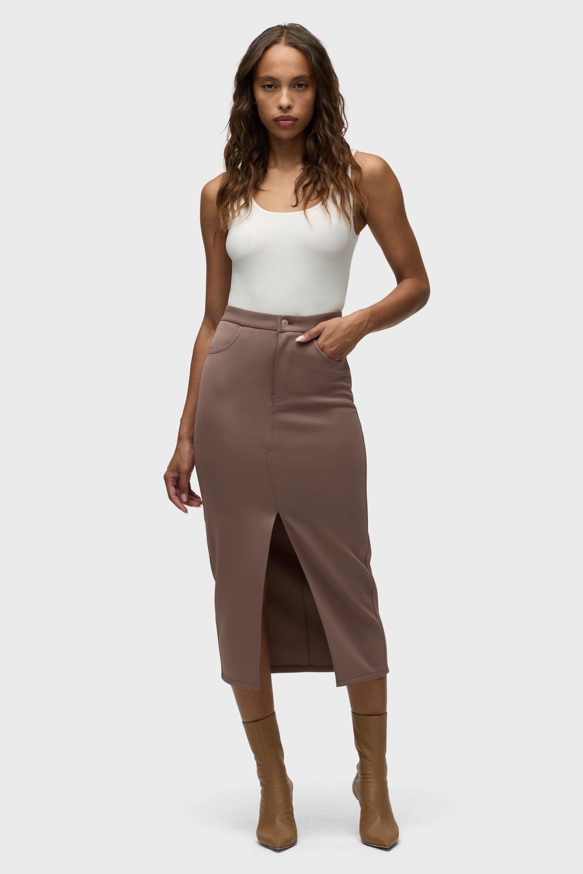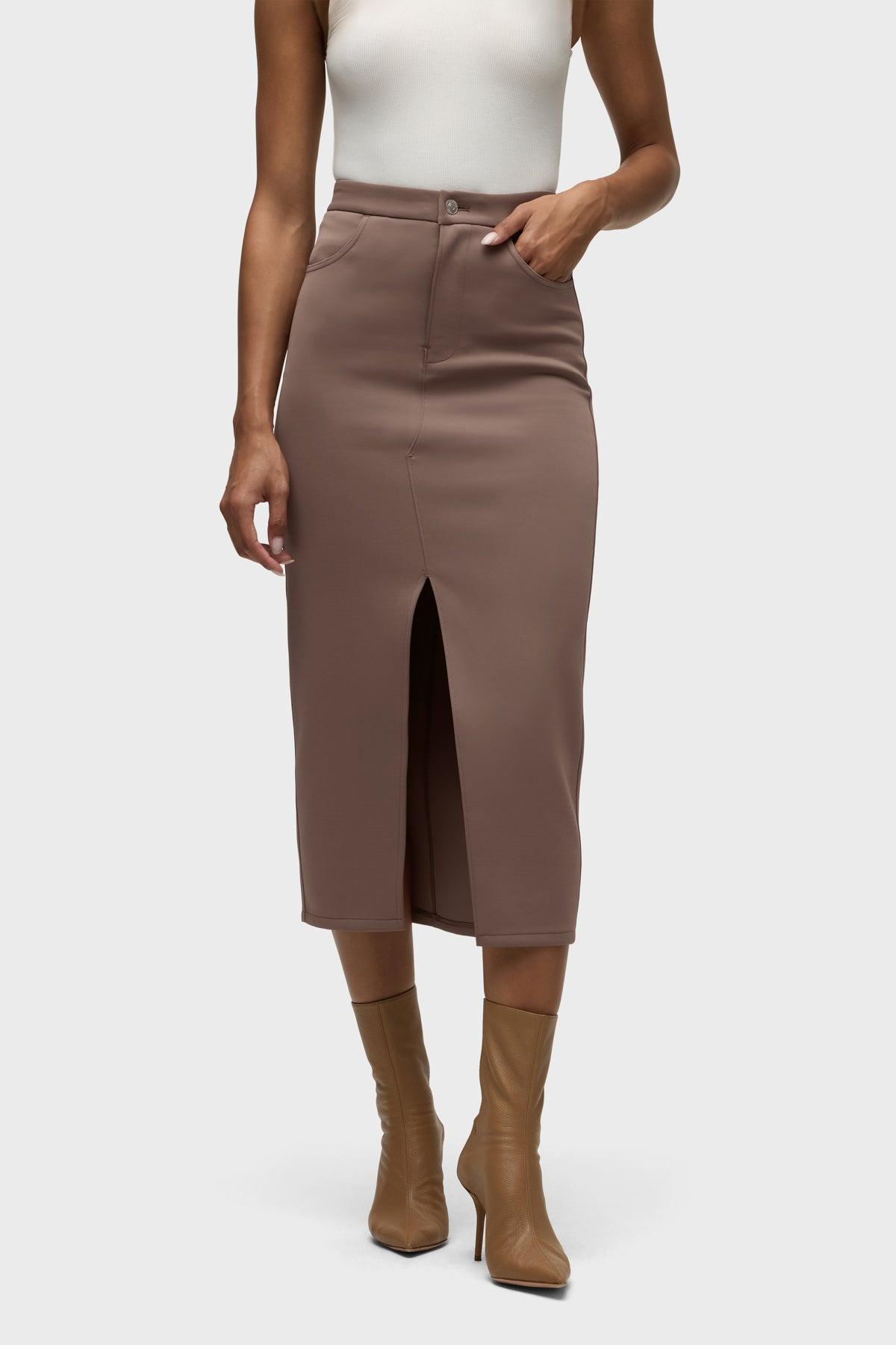 Description Our Reconstructed Skirt in Deep Taupe is cut from our new sculpting rib-scuba knit, a soft and flexible feel with every move and a hold-you-in fit. Hitting below the knee with a midi length, it features a front slit and pockets. Product Details Center Front Length: 34", Center Back Length: 34", Sweep: 33.5"Model Height 5'9"Model wearing size SMeasurements based on size S Fit & Care Content: 90% Polyester, 10% SpandexMachine wash cold with like colorsDo not bleachTumble dry low or hang to dry