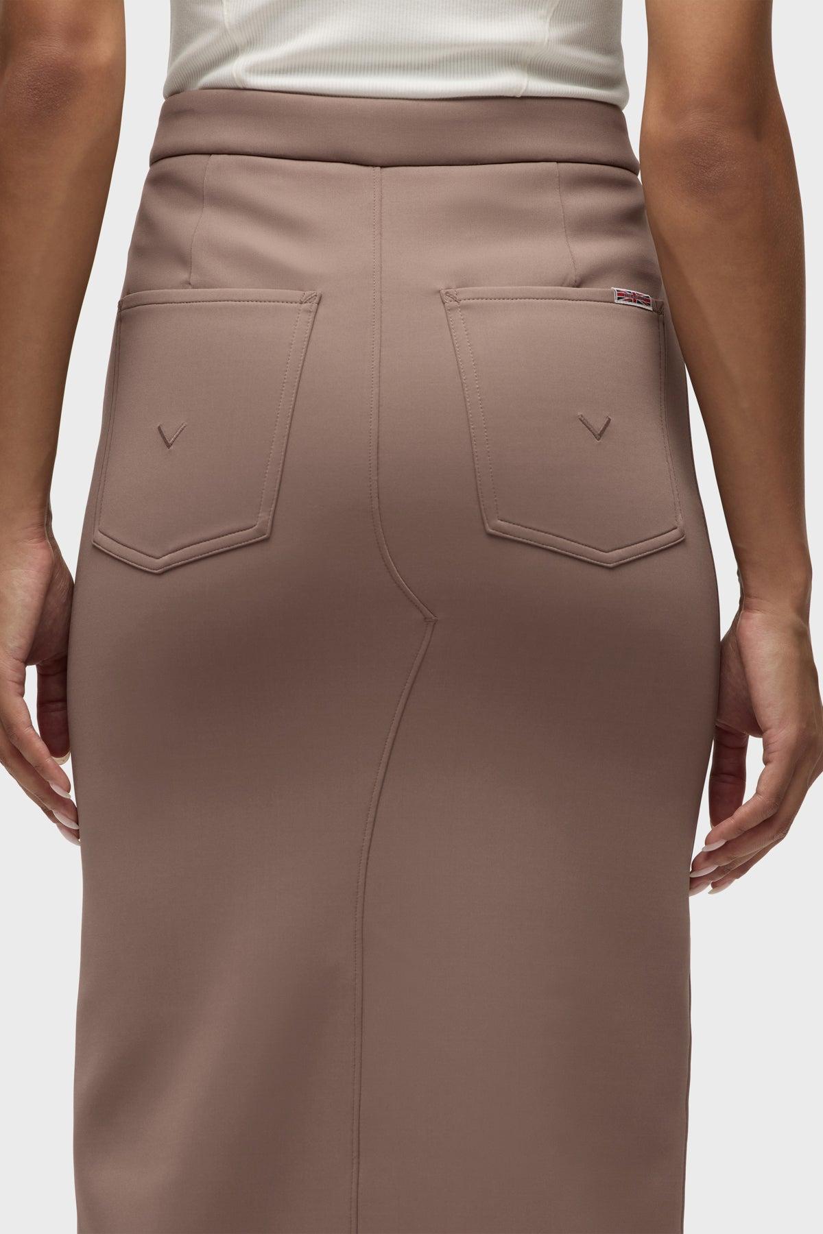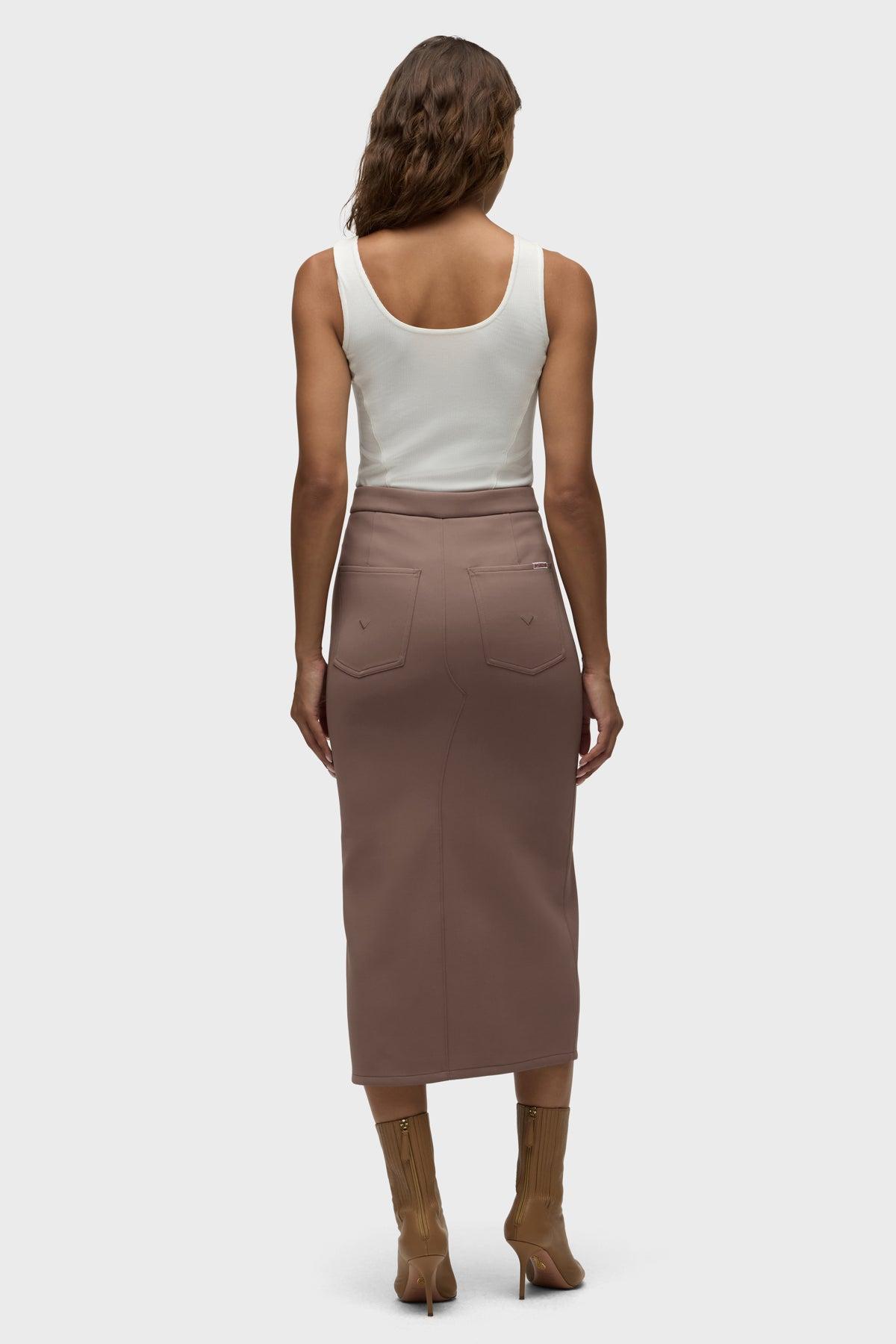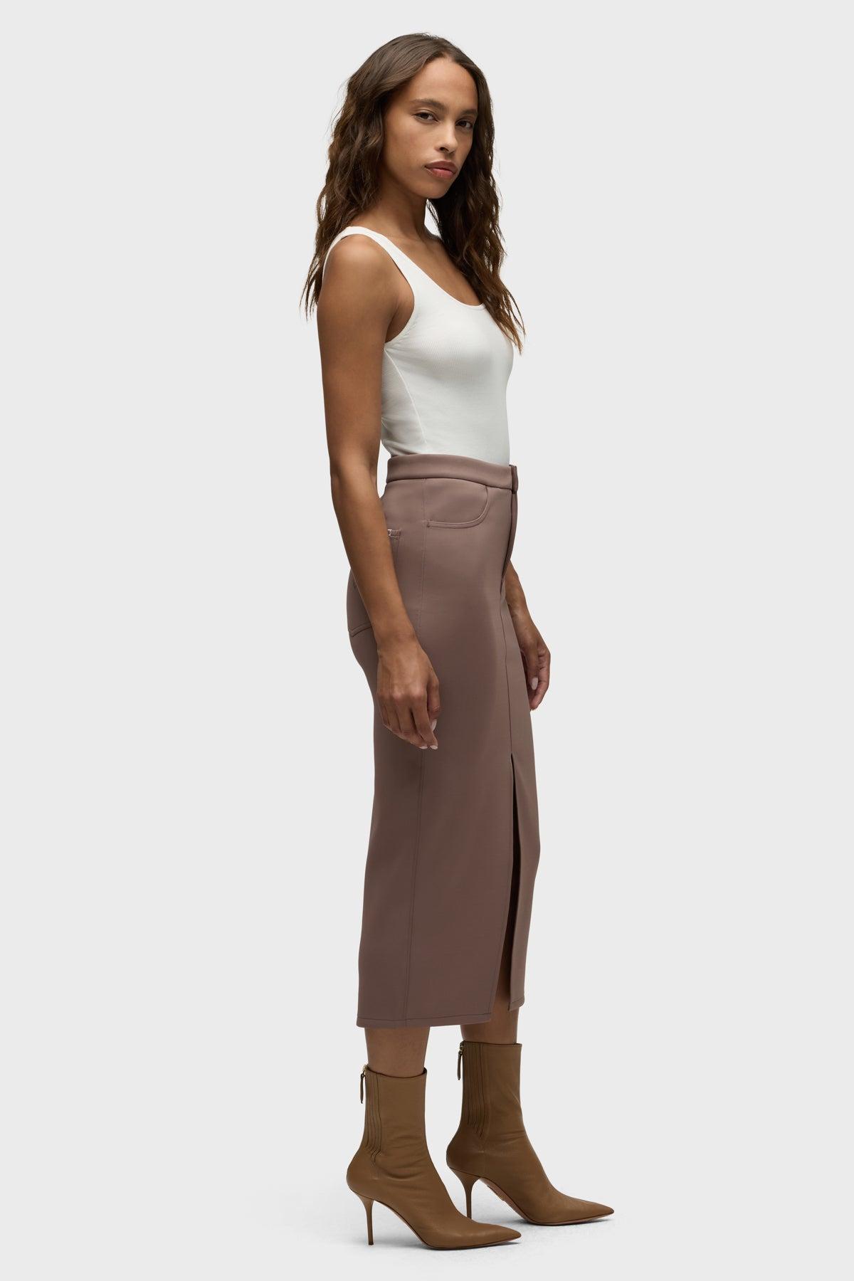 Description Our Reconstructed Skirt in Deep Taupe is cut from our new sculpting rib-scuba knit, a soft and flexible feel with every move and a hold-you-in fit. Hitting below the knee with a midi length, it features a front slit and pockets. Product Details Center Front Length: 34", Center Back Length: 34", Sweep: 33.5"Model Height 5'9"Model wearing size SMeasurements based on size S Fit & Care Content: 90% Polyester, 10% SpandexMachine wash cold with like colorsDo not bleachTumble dry low or hang to dry