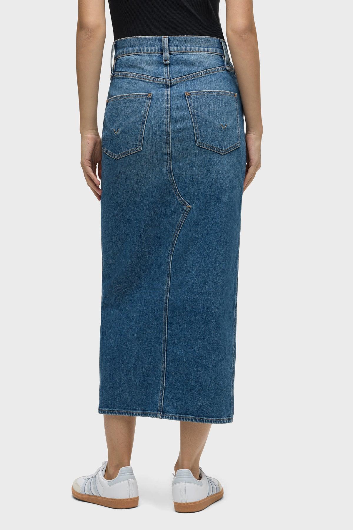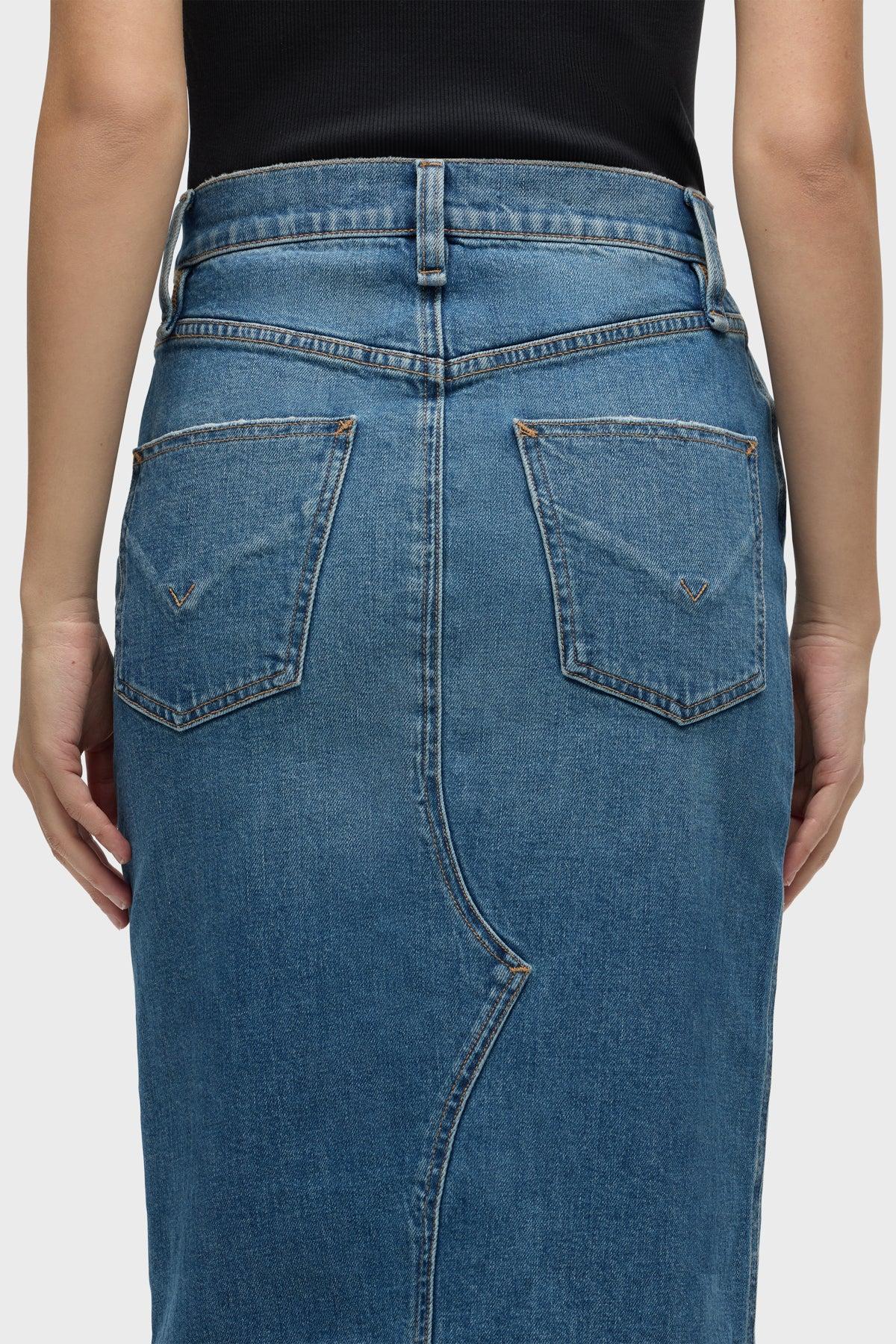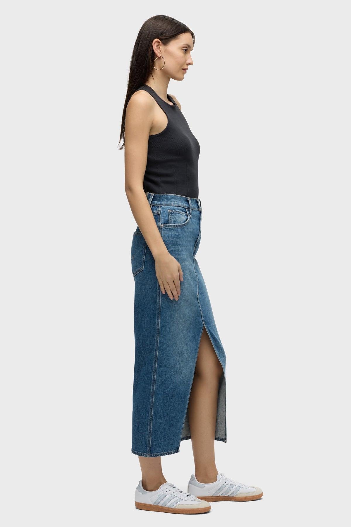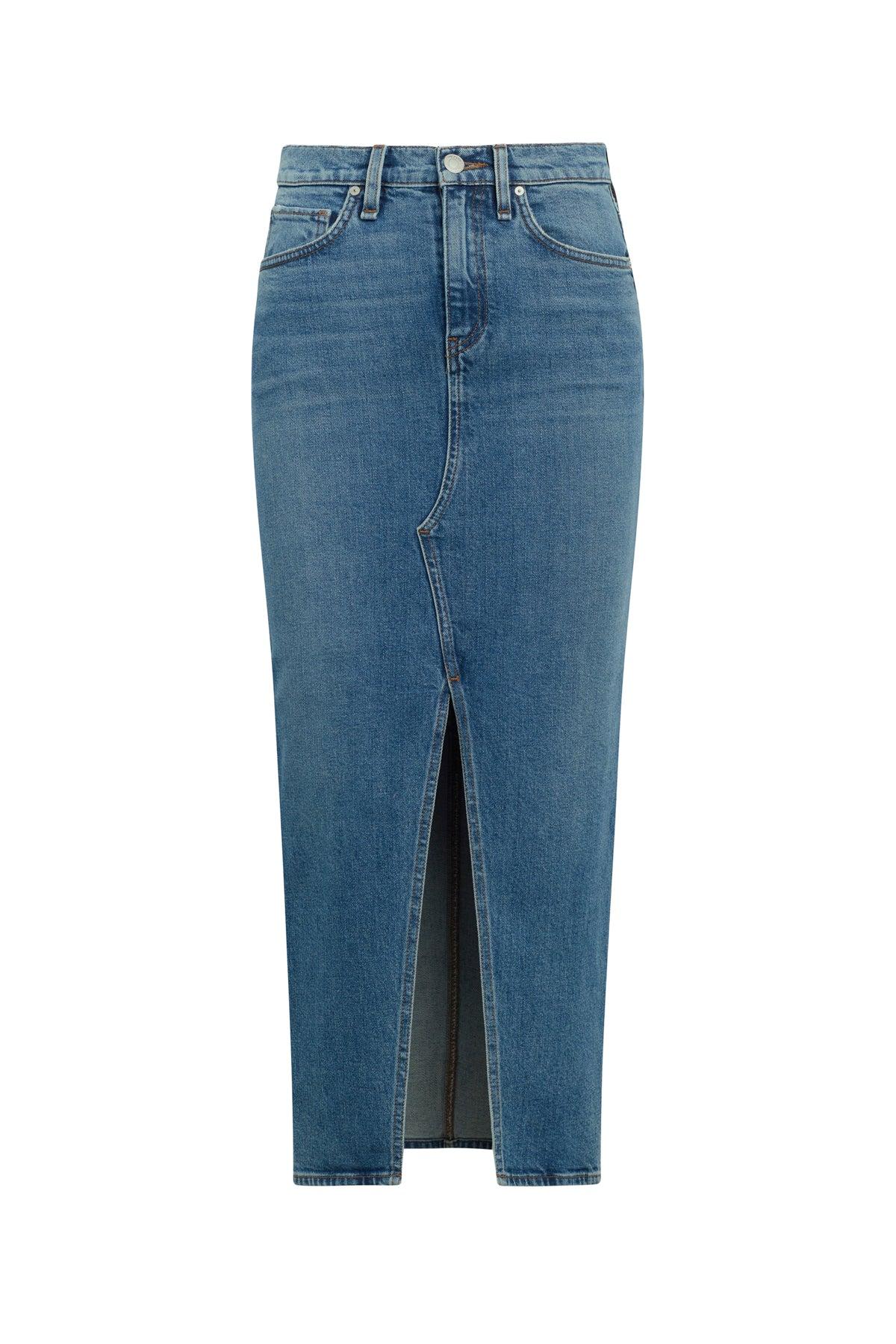 Description Our High-Rise Reconstructed Skirt in medium blue Lucent is cut from Legacy, Italian premium comfort stretch denim for a flattering, hold-you-in fit. Hitting below the knee, it features a front slit and grinding along the edges. Product Details Center Front Length: 35.5", Center Back Length: 36", Sweep: 33"Model Height 5'9"Model wearing size 25Measurements based on size 27 Fit & Care Content: 98% Cotton, 2% ElastaneMachine wash cold with like colorsDo not bleachTumble dry low or hang to dry