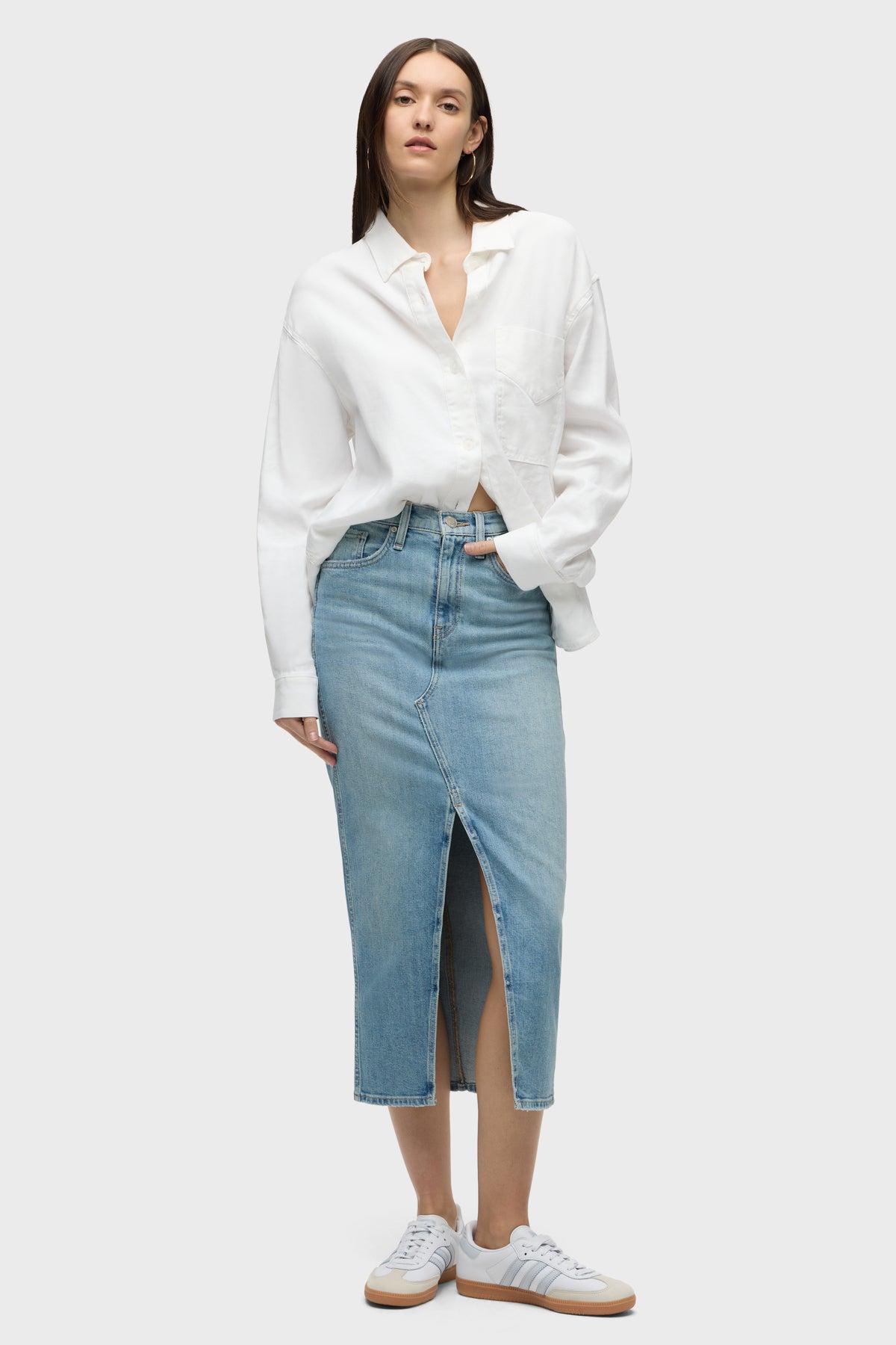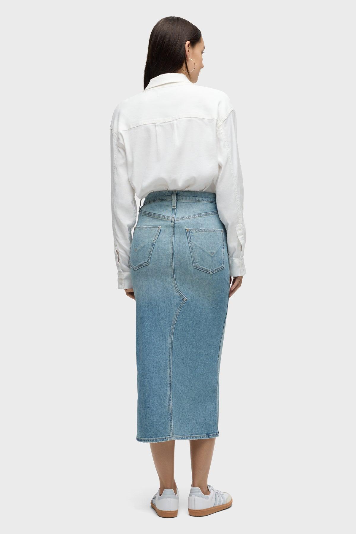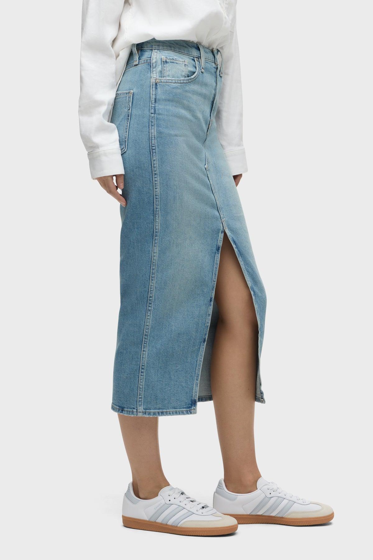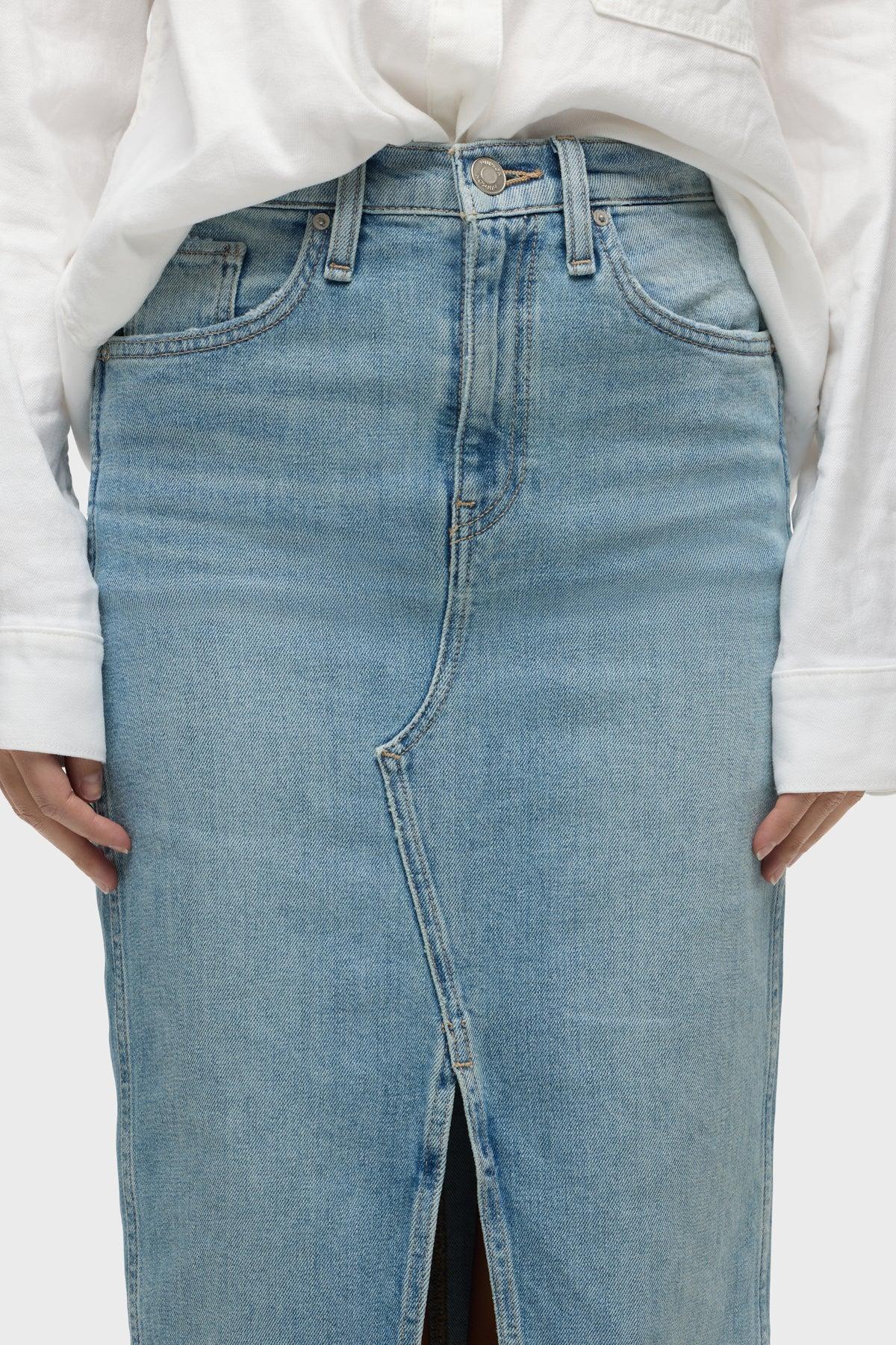 Description Long and sleek, our Reconstructed Skirt in Offshore is cut from premium comfort stretch denim with a high center slit and gentle fading for vintage appeal. Product Details Center Front Length: 34", Center Back Length: 34", Sweep: 33.5"Model Height 5’9"Model wearing size 25Measurements based on size 27 Fit & Care Content: 98% Cotton, 2% Elastane Woven Denim SkirtMachine wash cold with like colorsDo not bleachTumble dry low or hang to dry