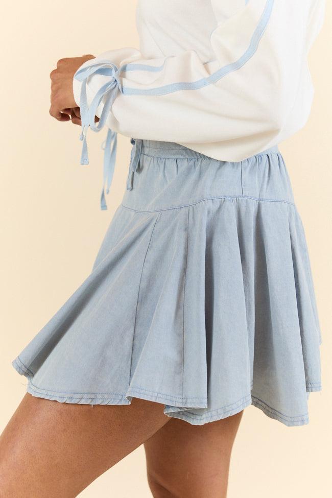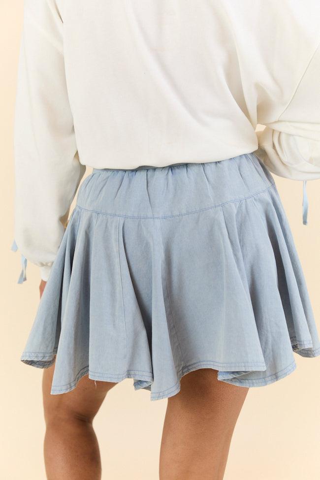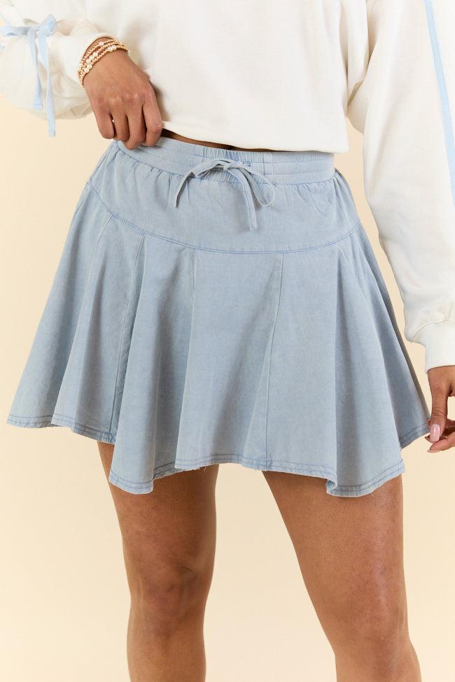 Details Washed Blue Skort Fabric has stretch Drawstring elastic waistband Lined with shorts, inseam: 1.75" Size small from waist to hem: 14" Material and Care Self: 100% cotton, Lining: 65% polyester 35% cotton Color will bleed, hand wash and line dry alone Patterns may vary Materials may have natural variations Colors may vary from different viewing devices.