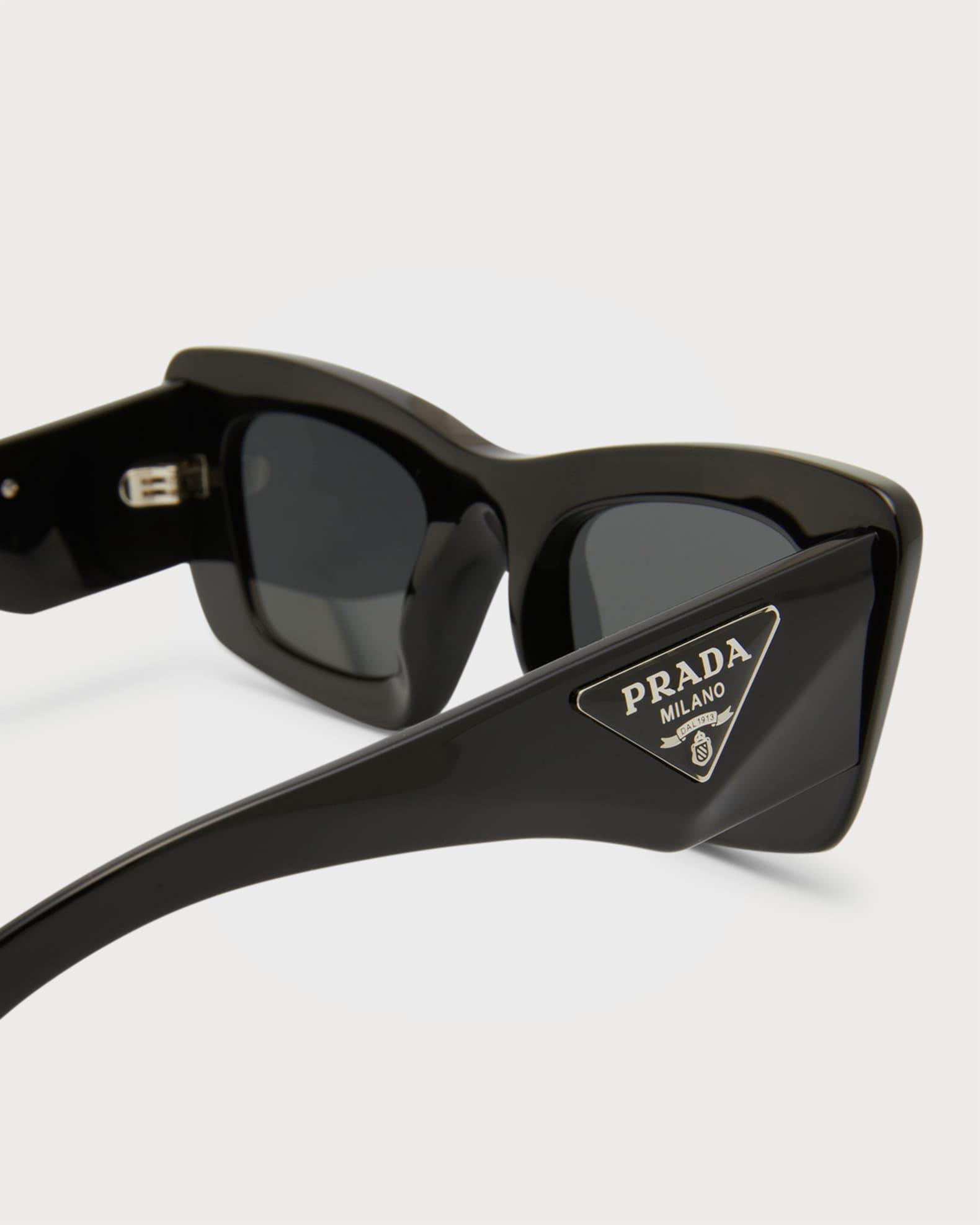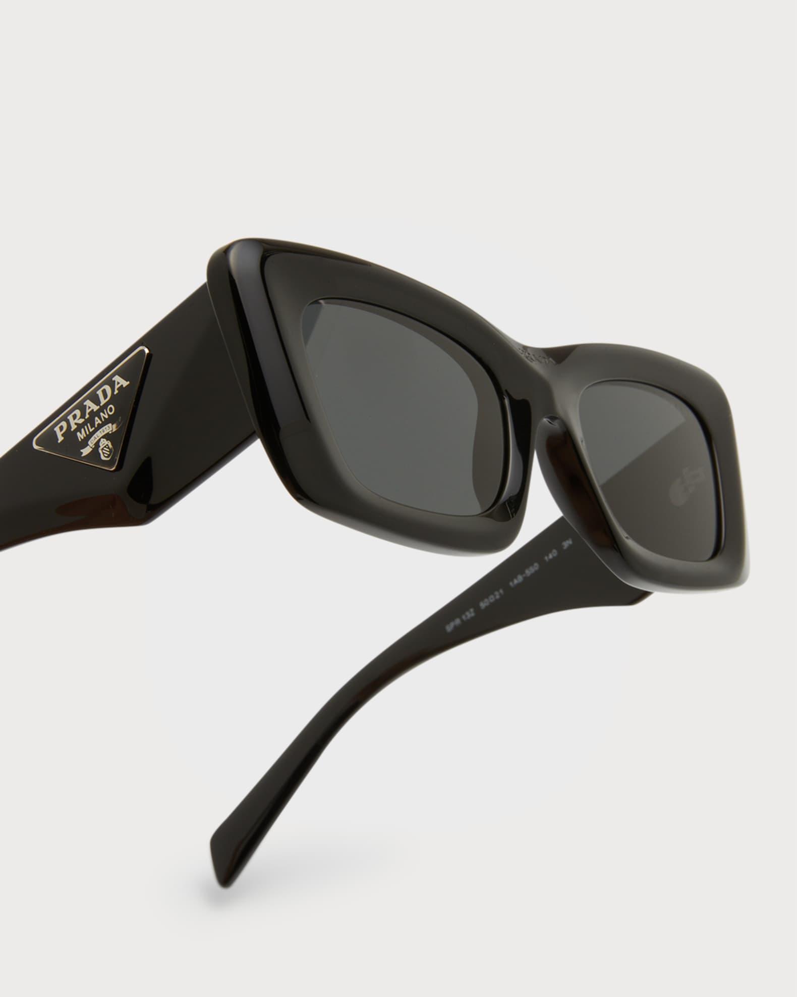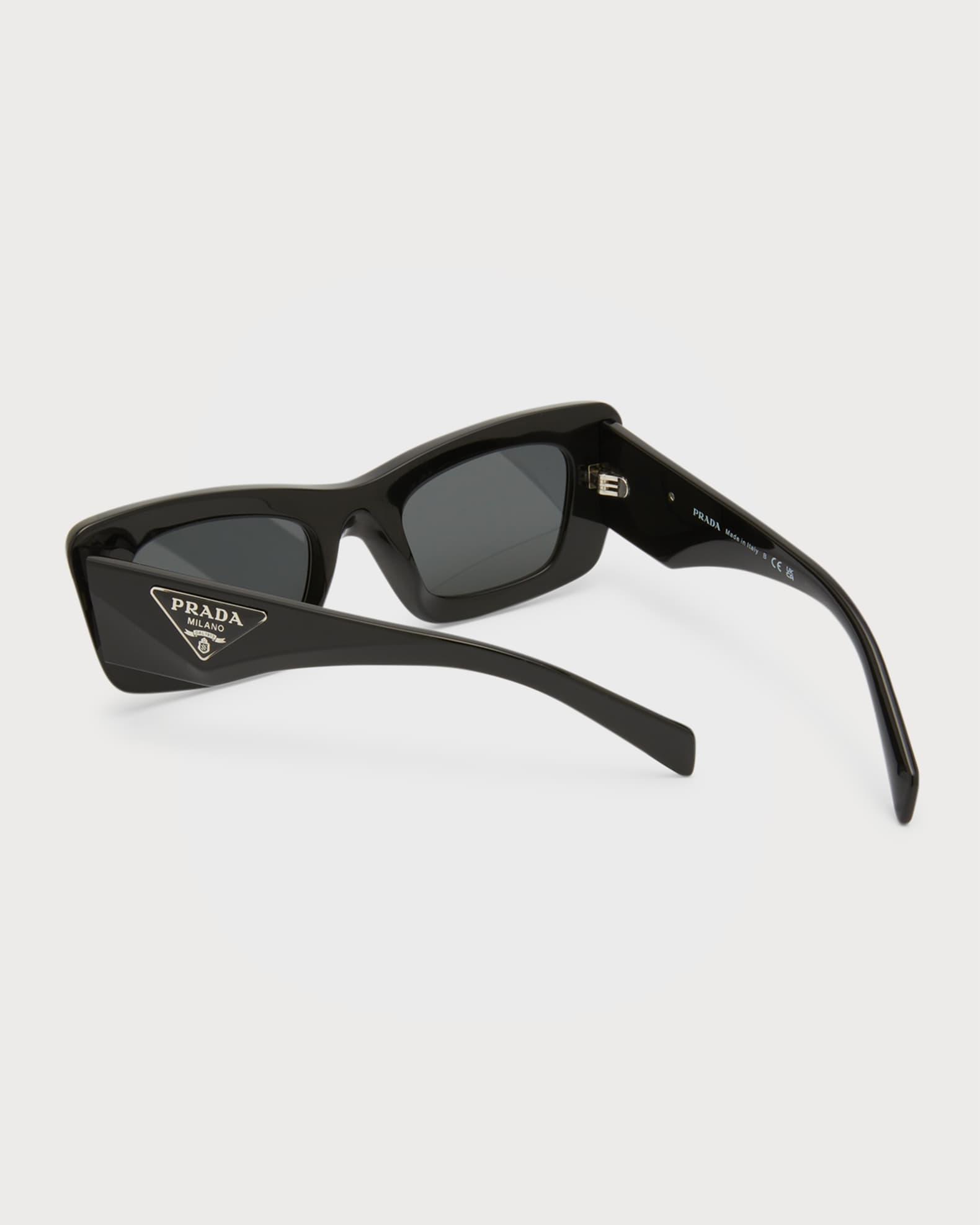 Prada rectangular cat-eye sunglasses in marbled acetate and plastic Lens/bridge/temple (in mm): 50-21-140 Solid lenses; logo on corner Saddle nose bridge Logo detail on temples Extra-wide, tapered arms Style is Rx-able 100% UVA/UVB protection Made in Italy