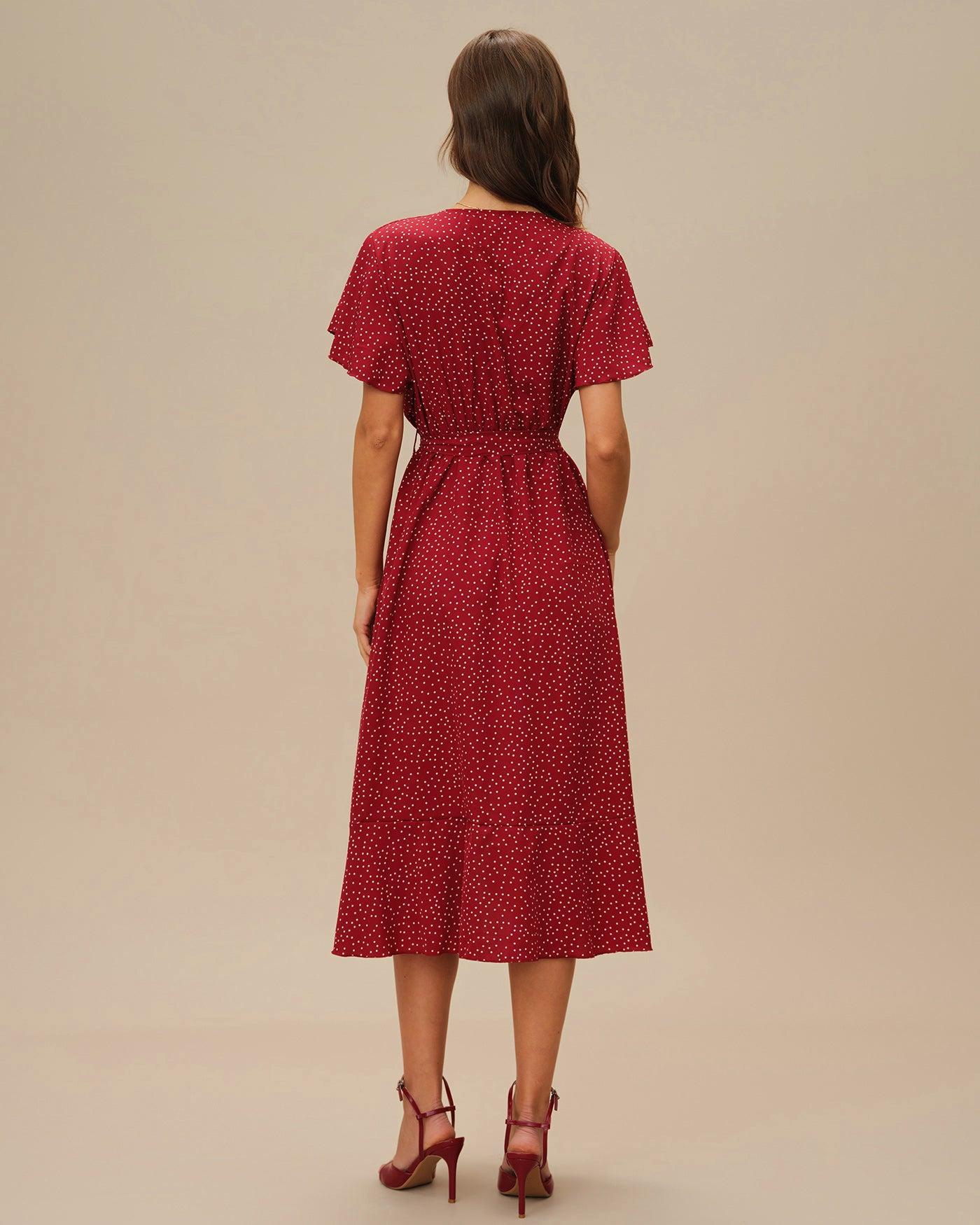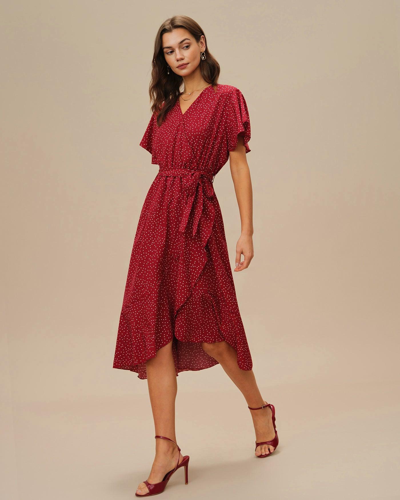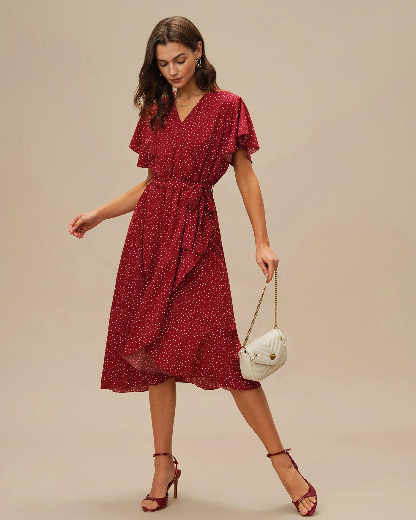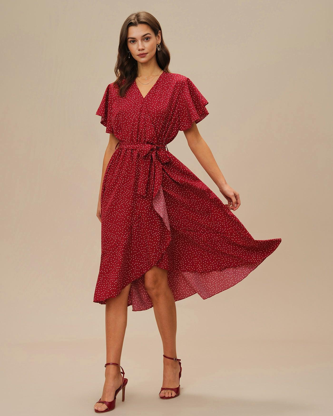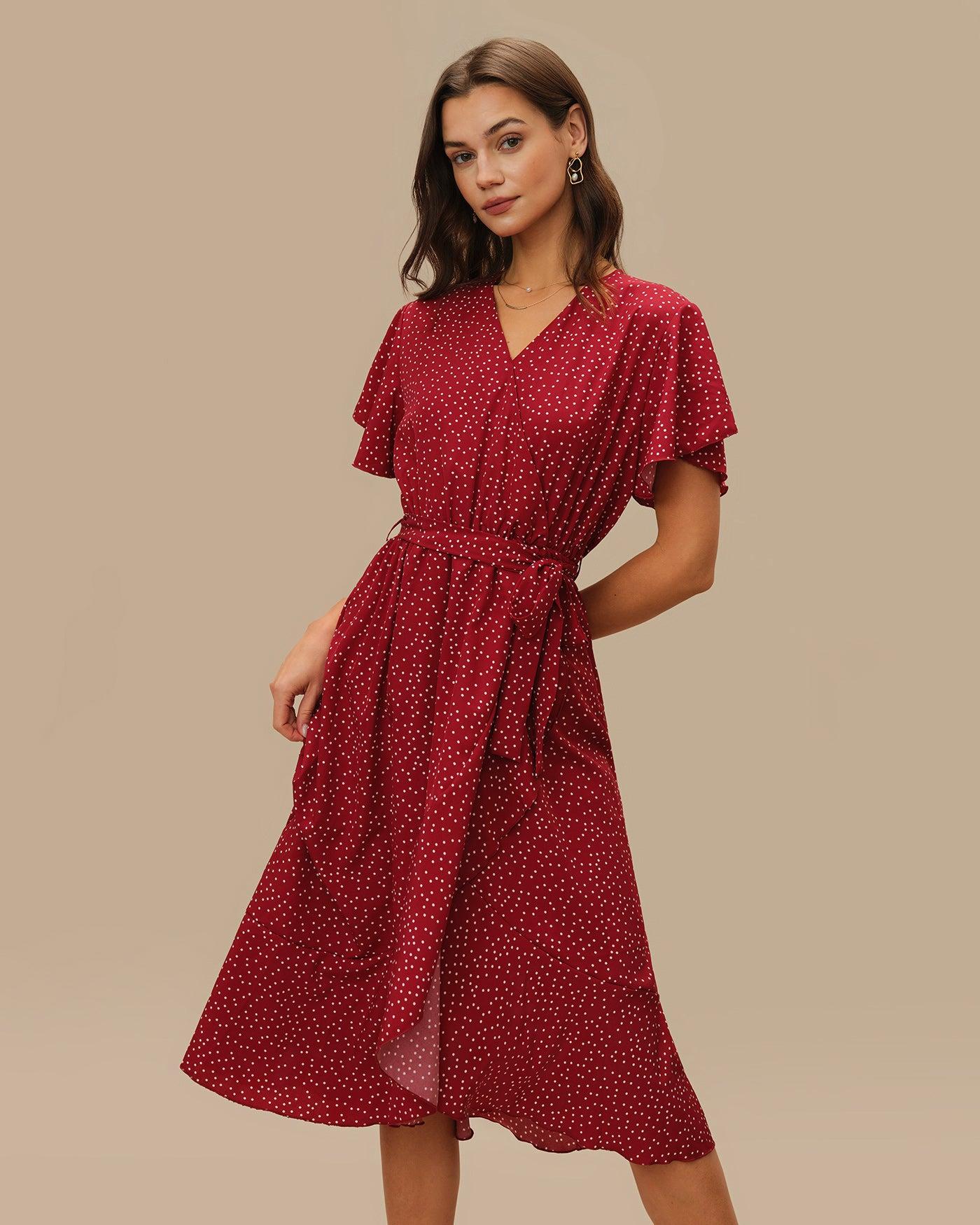 - Occasion: Daily - Style: Casual - Season: Summer, Spring - Fabric Stretch: No Stretch - Waist: Natural Waisted - Sleeve Length: Short Sleeves - Sleeve Type: Butterfly Sleeve - Pattern Type: Polka Dot - Embellishment: Belt - Neckline: V Neck - Dress Type: Tunic - Silhouette: A-Line - Fabric: Polyester 100.0% - Material: Polyester