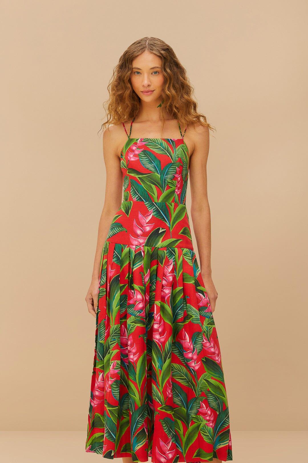 Step into a tropical oasis with our Red Dream Garden LENZING™ ECOVERO™ Euroflax™ Maxi Dress. This captivating piece features a vibrant botanical print, perfect for sunlit strolls. The airy halter neckline and flowing silhouette create an elegant, playful vibe. Crafted from responsible materials, it’s a harmonious blend of nature and style, inviting you to embrace your adventurous spirit with every wear. LENZING™ ECOVERO™: the eco-responsible fibers generate up to 50% lower emissions and water impact compared to generic viscose. Composition 55% LINEN 45% VISCOSECare Instructions HAND WASH MAX TEMP 40°, DO NOT BLEACH, DO NOT TUMBLE DRY, COOL IRON (ON REVERSE), DO NOT DRY CLEANSize and Fit Inches XXS XS S M L XL Bust N/A N/A N/A N/A N/A N/A Waist 24 2/4 26 2/4 28 1/4 30 1/4 33 2/4 36 2/4 Length 45 45 3/4 46 2/4 47 1/4 47 3/4 48 2/4 Hip 32 1/4 34 1/4 36 1/4 38 1/4 44 2/4 44 2/4