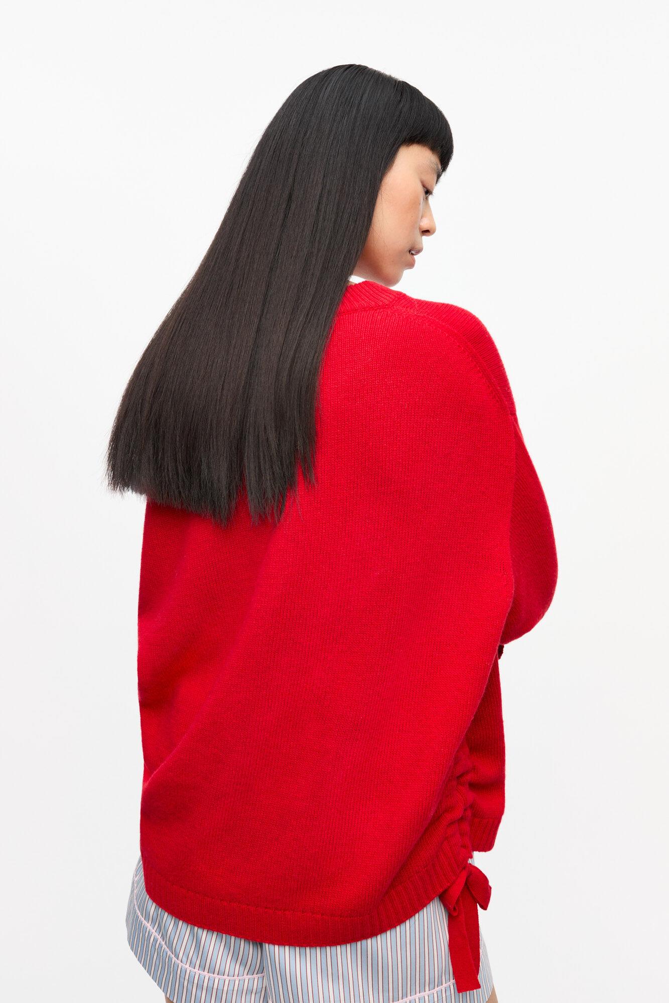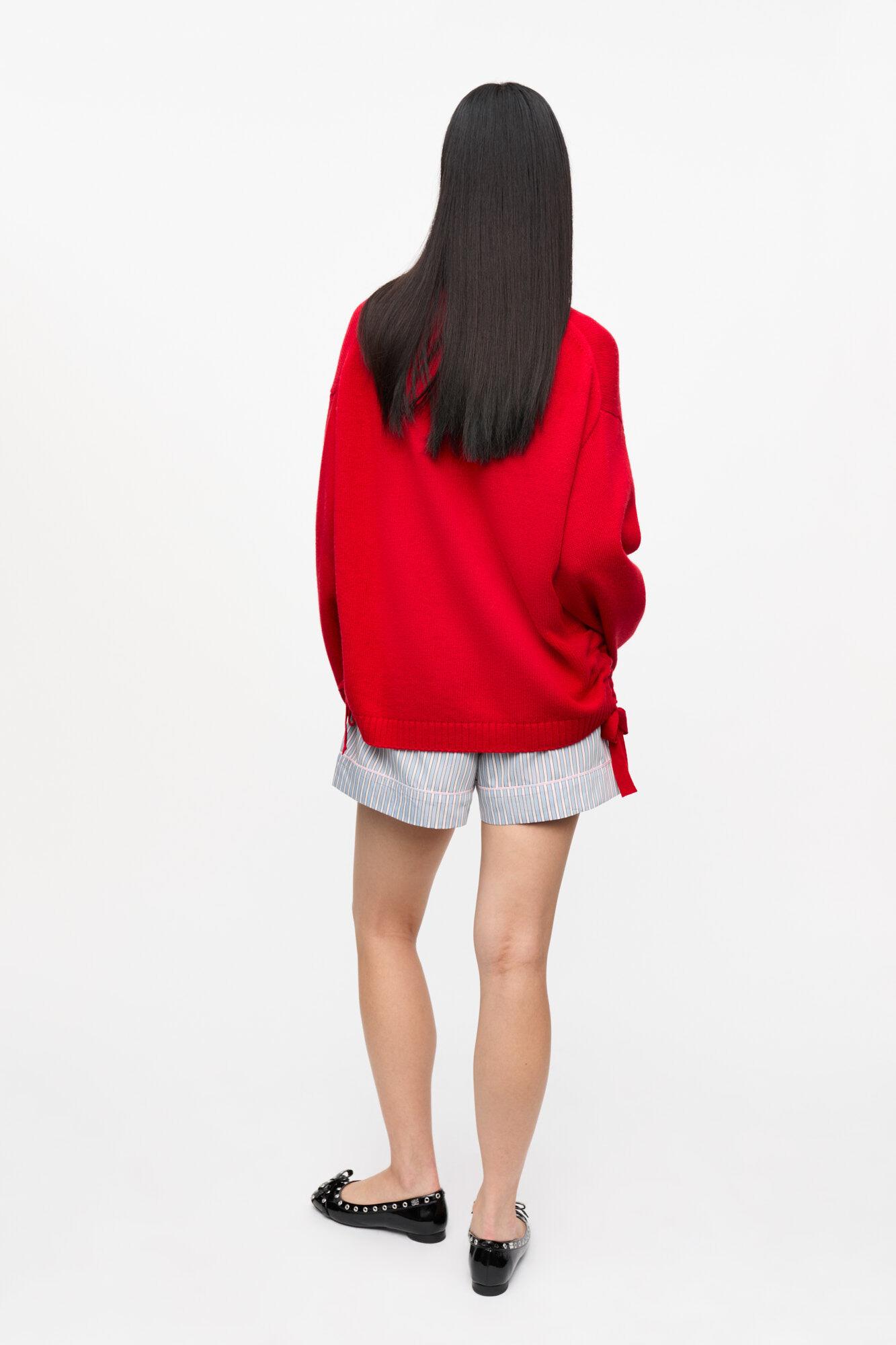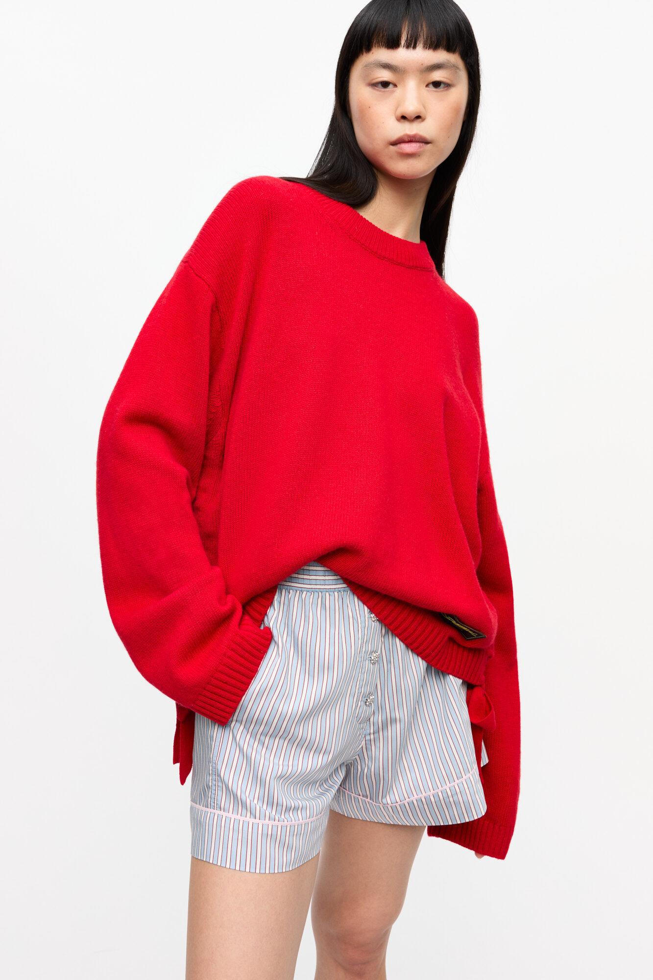 This Red Future Wool Mix Oversized Sweater features a round neckline, long loose sleeves, ribbed edges, ruched detailing on the sides with tie details and a sewn-on GANNI logo patch. The knit contains Viscose made with CIRCULOSE®, a next-gen material that is part of our Fabrics of the Future initiative. Learn more in our Material Index.