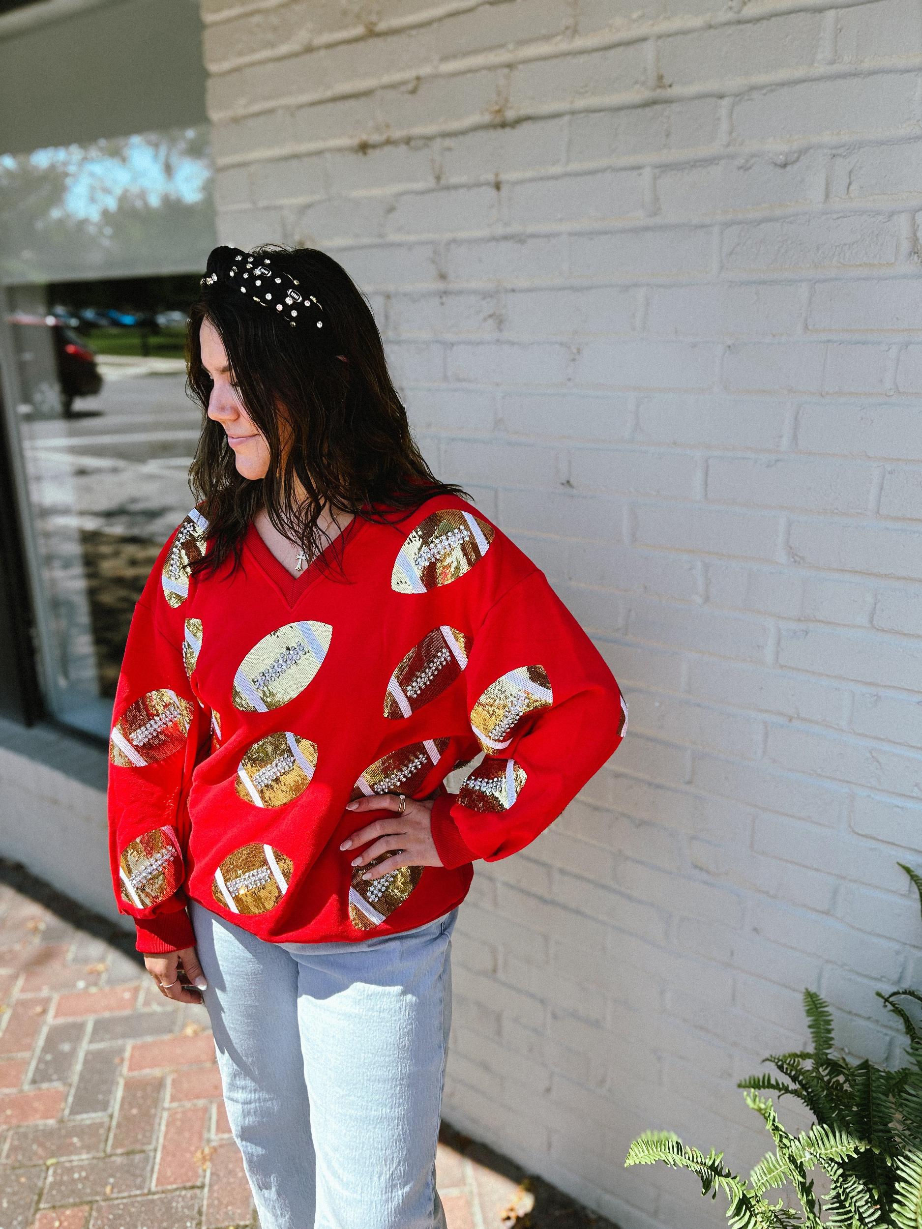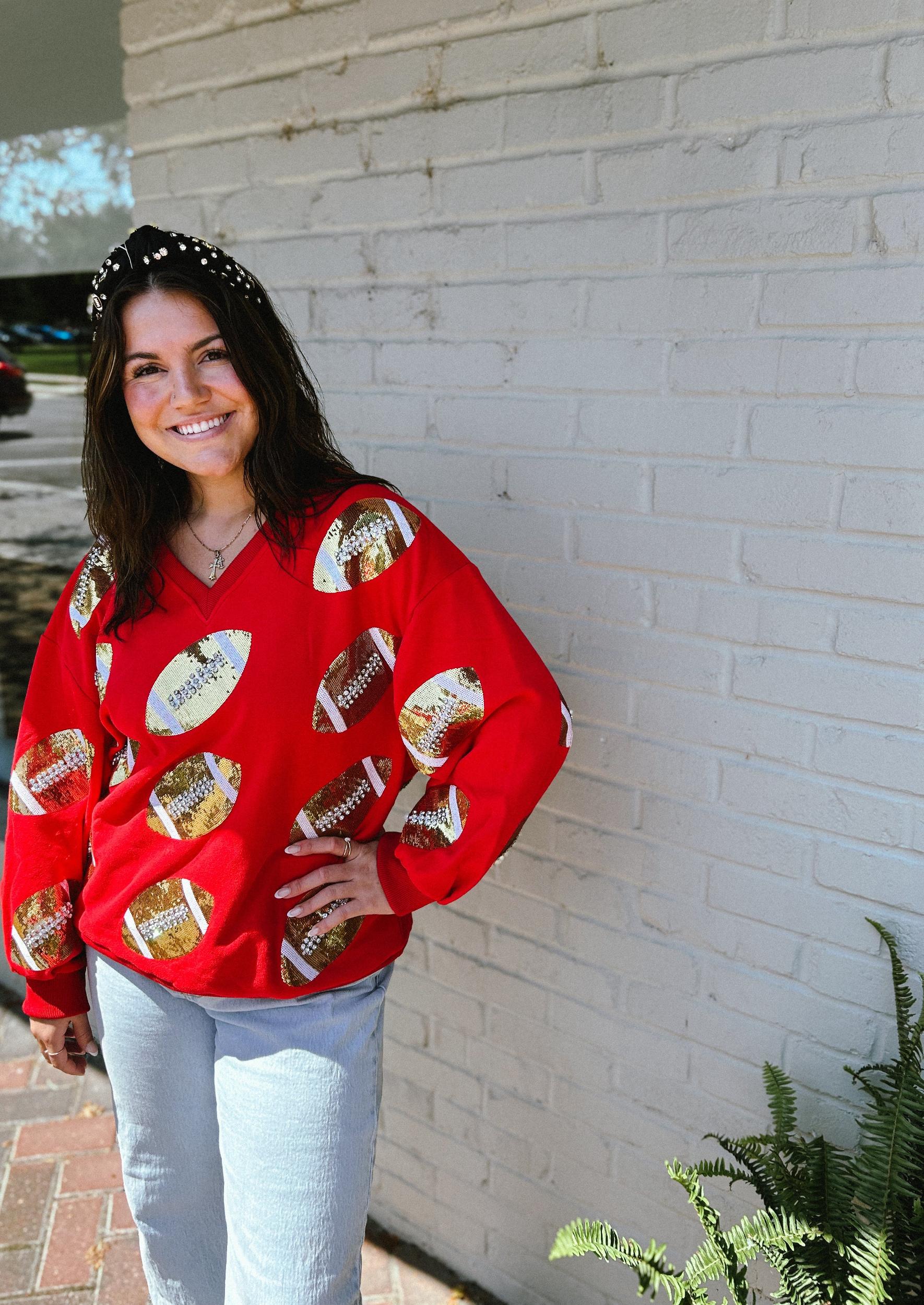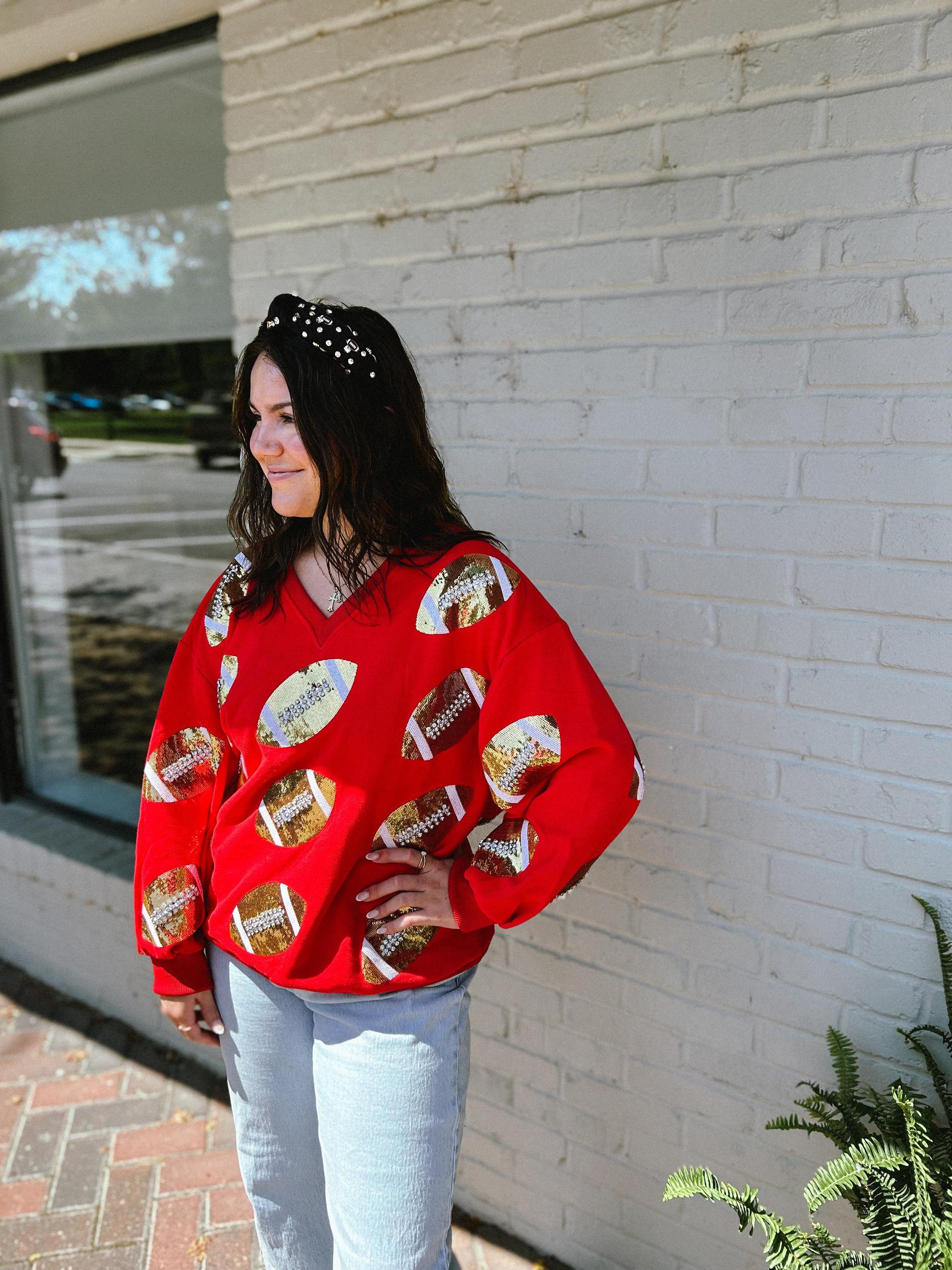 Rule the football field in style with our Red & Gold Rhinestone Lace Football Sweatshirt! The v-neck design adds a touch of femininity to this sporty red sweatshirt adorned with gold rhinestone footballs. Show off your sparkle and love for the game with this Queen of Sparkles sweatshirt.