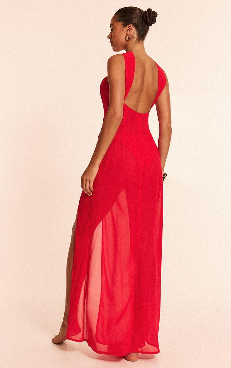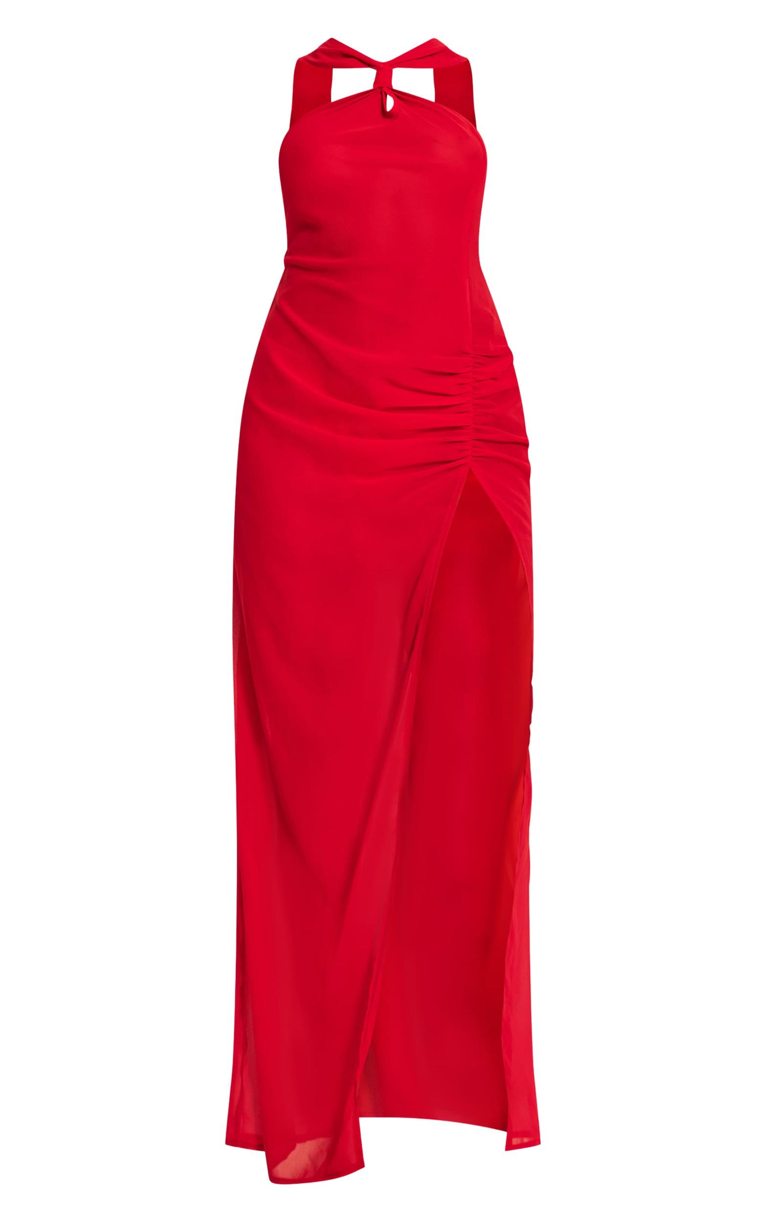 A knowing cut designed for confident moments under the sun. The red halter neck chiffon maxi beach dress features a striking halter neckline that secures with an artful knot fastening, framing the shoulders. Fabric is shaped with subtle ruching through the waist before descending to a confident maxi length, finished by a bold split at the side. Pair this piece effortlessly with your favorite bikini and simple flat sandals for refined poolside presence.Length approx 155cm/61inch (Based on sample size S)Model wears size SModel Height - 5ft 8inchp]:!mb-4inch>Brand: PrettyLittleThingCategory: SwimwearProduct type: Beach DressColor: RedMaterial: Chiffon
