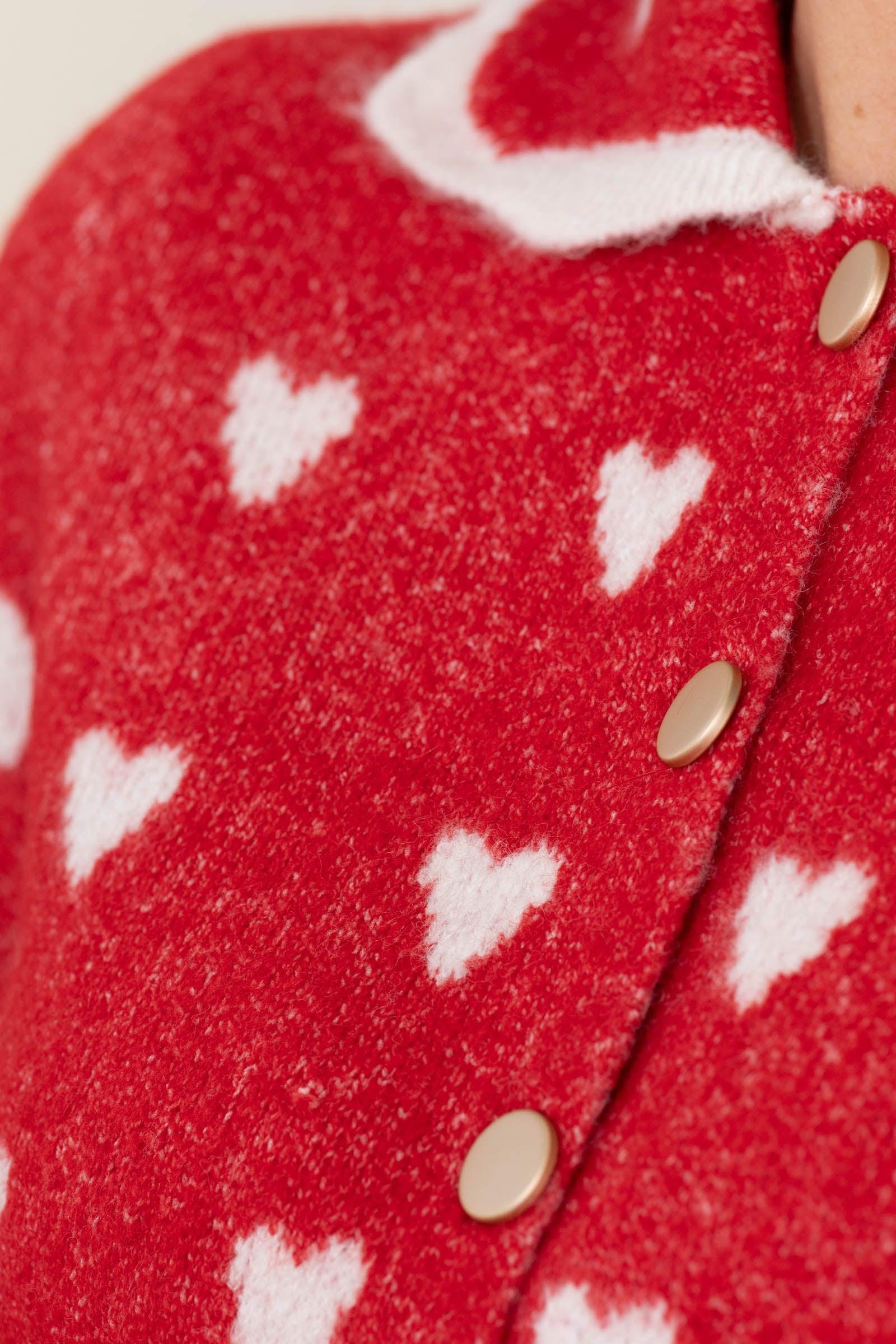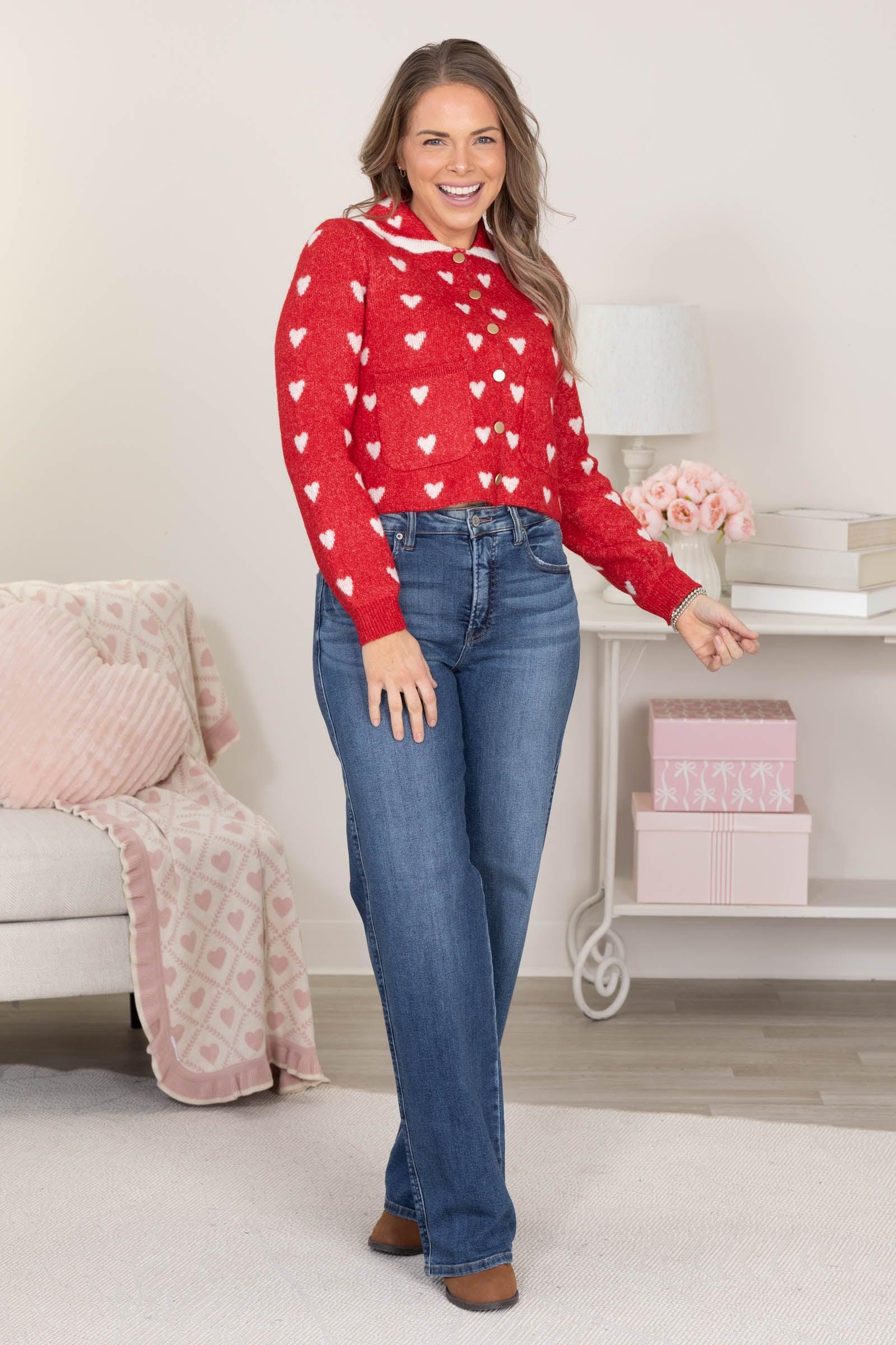 Product Details Colors: Red, White Print: Hearts Neckline: Button Down Sleeve: Long Sleeve Hemline: Straight Brand: Blu Pepper Material and Care 50% Recycled Polyester 15% Polyester 13% Acrylic 13% Nylon 6% Wool 3% Spandex Hand Wash Cold Hang/Line Dry Size and Fit Small: Bust 36" Waist 36" Length 18" Medium: Bust 38" Waist 38" Length 18.5" Large: Bust 40" Waist 40" Length 19" Erica is 5’7” and wearing her true size small