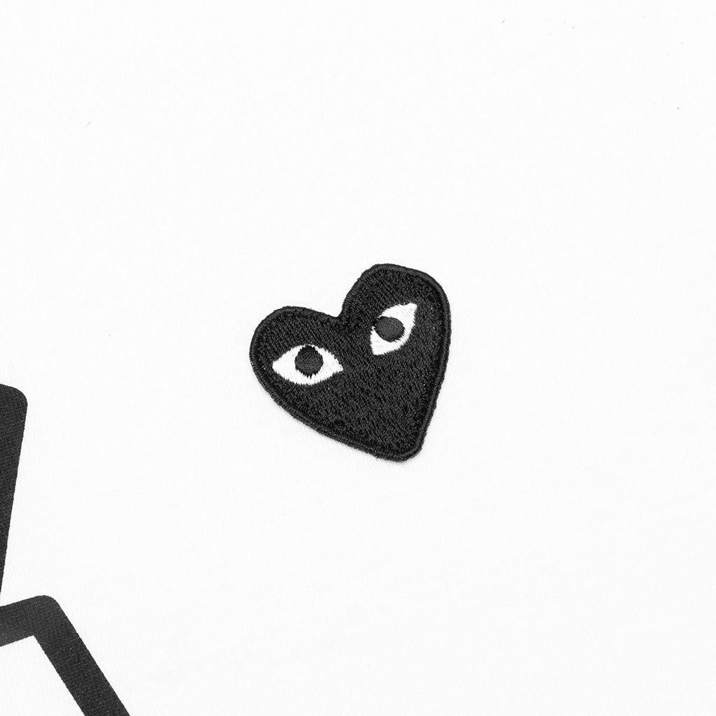 The concept of the Comme des Garcons PLAY line is design by not designing. Characterized by the iconic red heart logo designed by artist Filip Pagowski, the line is a collection of unisex basics, fragrances, and footwear for those who enjoy simplicity. Pictured is the Comme des Garcons PLAY Women's Red Multi Logo S/S T-Shirt in White. COMME DES GARCONS PLAY APPAREL HAS A SMALLER FIT, WE RECOMMEND SIZING UP. 100% Cotton Ribbed crewneck Embroidered branding Printed graphics Made in Japan Style no: AZ-T279-051-1 condition: new
