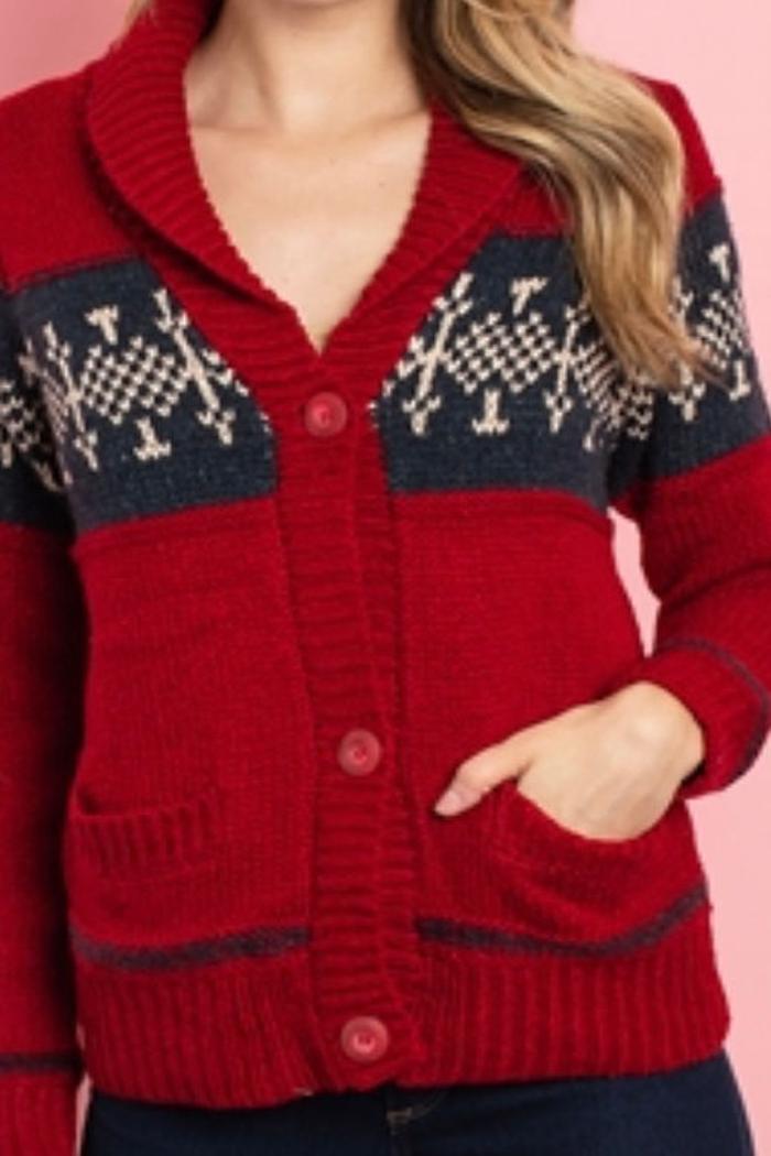 Stay stylish and comfortable with this red/navy pockets button down sweater. Crafted with a mix of perfectly weighted wool yarns, this sweater is designed to keep you warm and cozy while adding an eye-catching touch to your wardrobe. Style it with your favorite jeans and boots for a chic and timeless look.