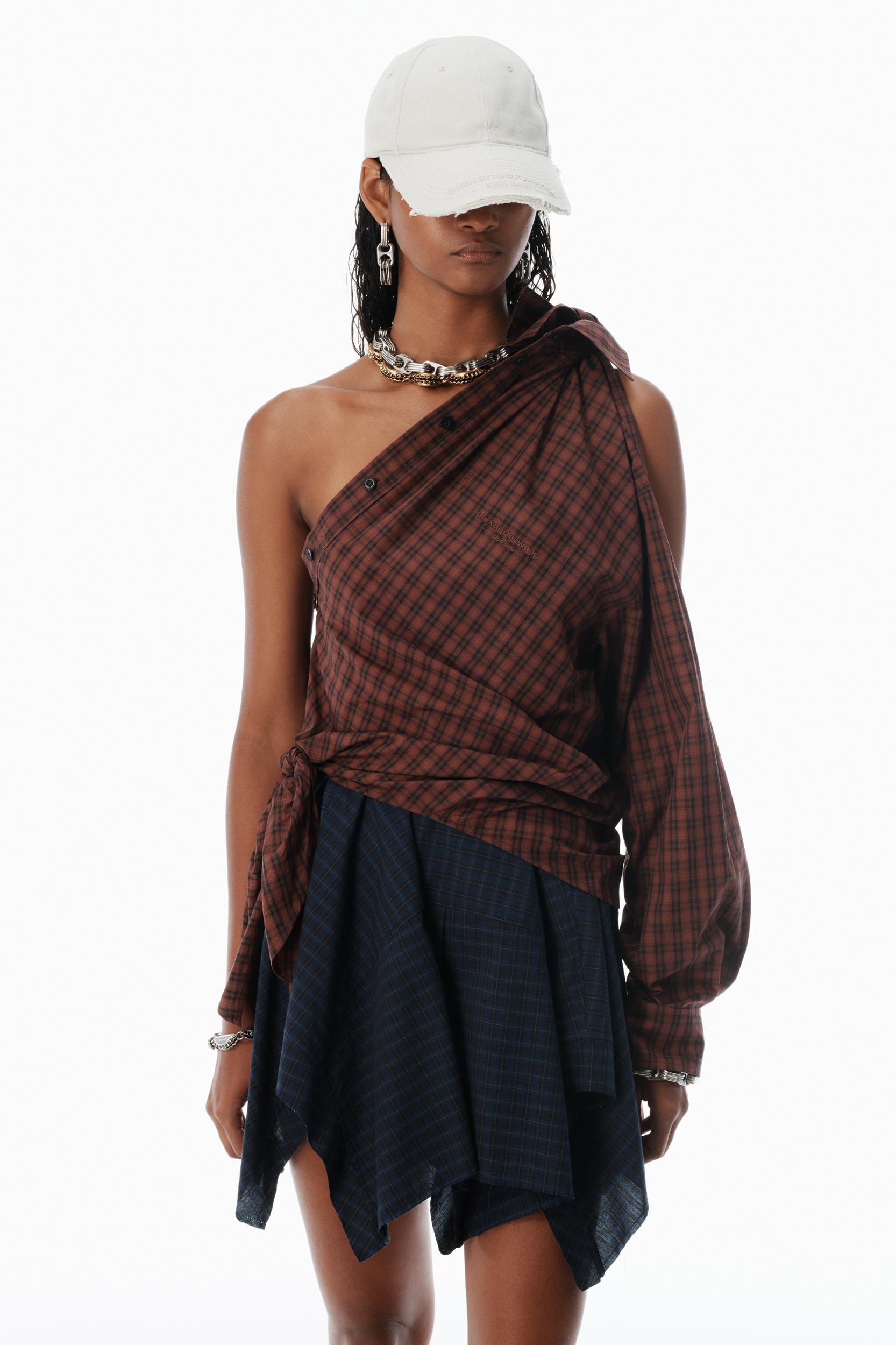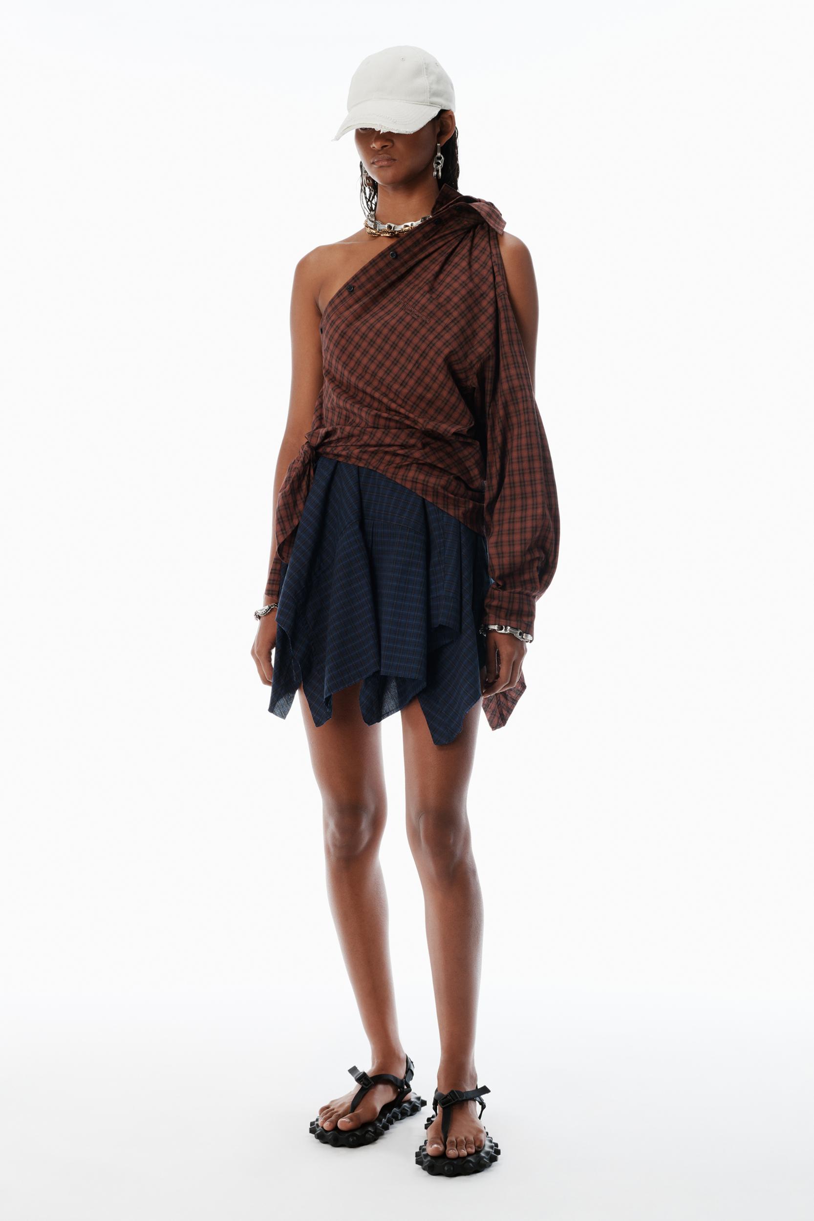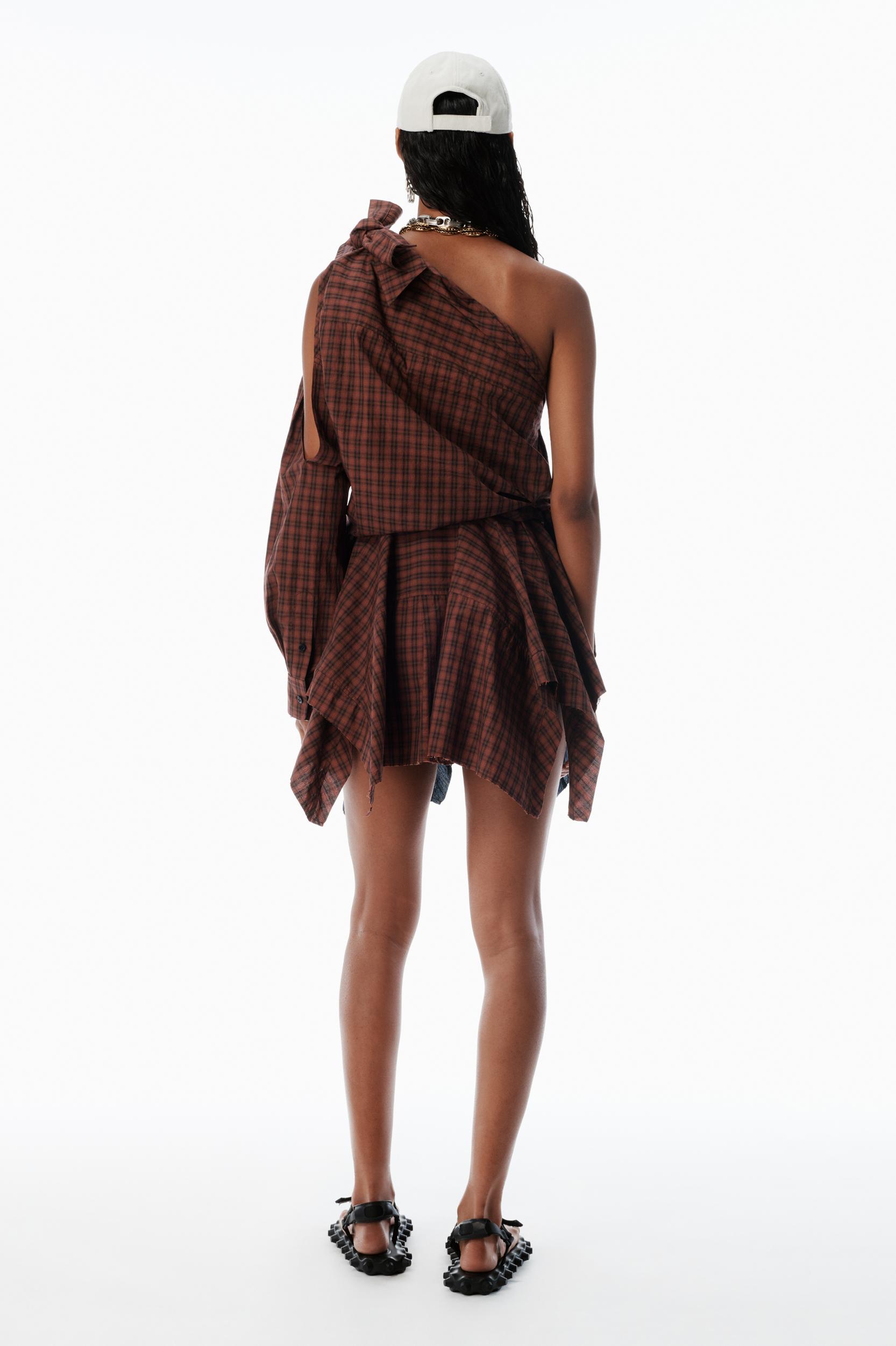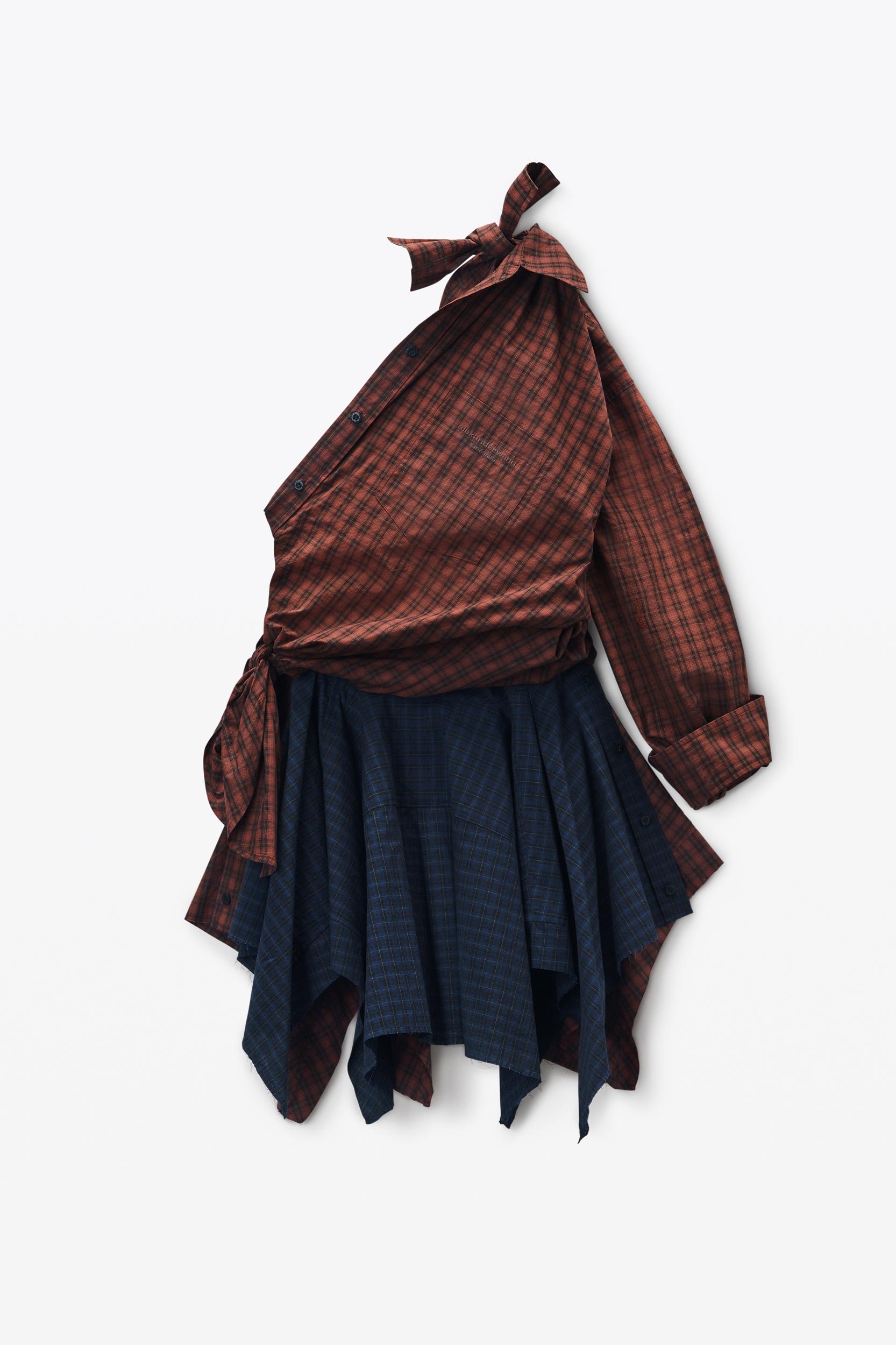 With a high-low hem, this deconstructed plaid minidress is accented by a tied collar detail, turned-up cuffs, and a logo-embroidered patch pocket.
