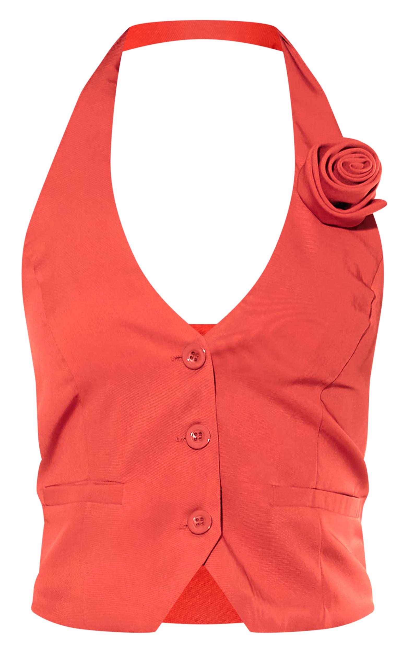Suit up in style in this red tailored rosette detail halterneck vest. Brought to you in a red hue material with a halterneck design and rosette detailing for that extra touch of glam, how can you go wrong? Style this red vest with the matching pants, heels and statement gold accessories for a look that is sure to steal all the stares. Length approx 38cm/15inch (Based on a sample size UK 8) Model wears size UK 8/ EU 36/ AUS 8/ US 4Model Height - 5ft 10inchp]:!mb-4inch>Brand: PrettyLittleThingCategory: Co-ordsProduct type: WaistcoatColor: RedMaterial: Tailored WovenNeckline: HalterneckSleeves: SleevelessOccasion: Evening