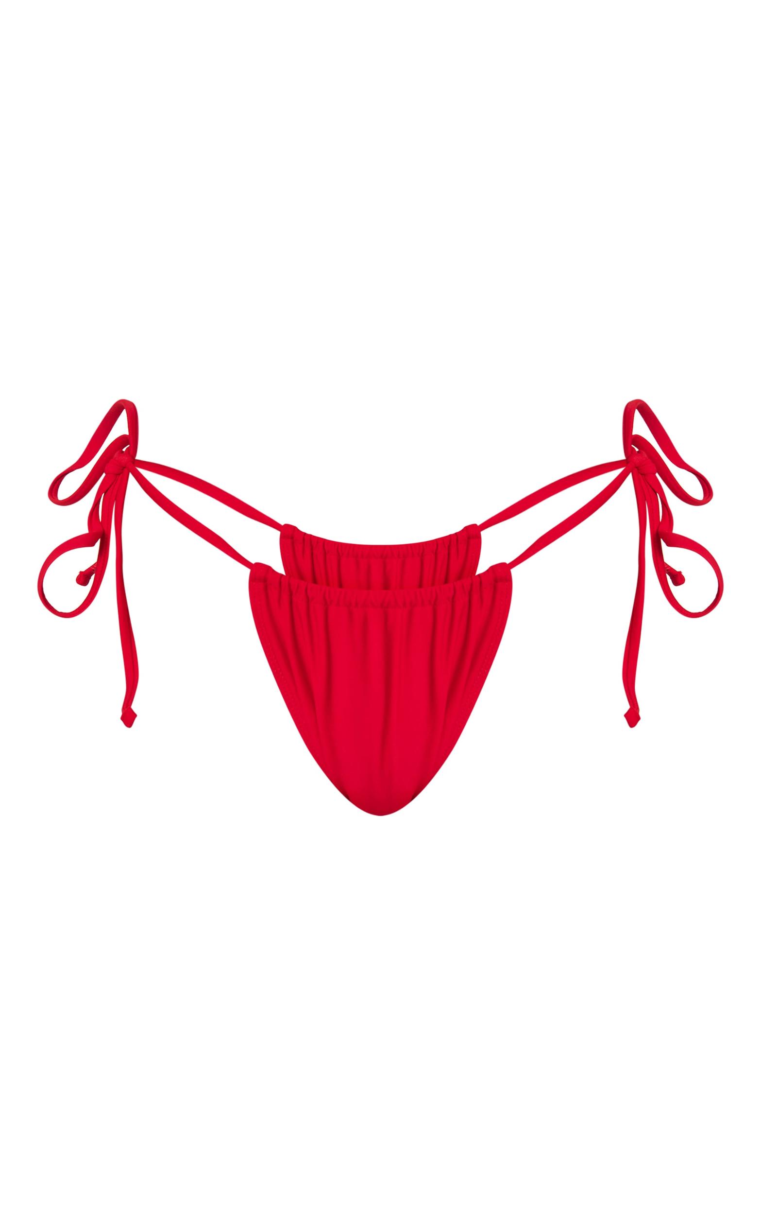 The red ruched side tie bikini bottoms are the perfect addition to your vacation wardrobe, combining elevated design with easy styling potential. The tie side detailing give you the perfect fit. Style with the matching bikini top, sandals and simple accessories for a chic look we are loving.Length approx 29cm/11.5inch (Based on sample size US 4)Model wears size UK 8/ EU 36/ AUS 8/ US 4Model Height - 5ft 8inchp]:!mb-4inch>Brand: PrettyLittleThingCategory: SwimwearProduct type: Tanga Bikini BottomColor: RedMaterial: SwimOccasion: Day