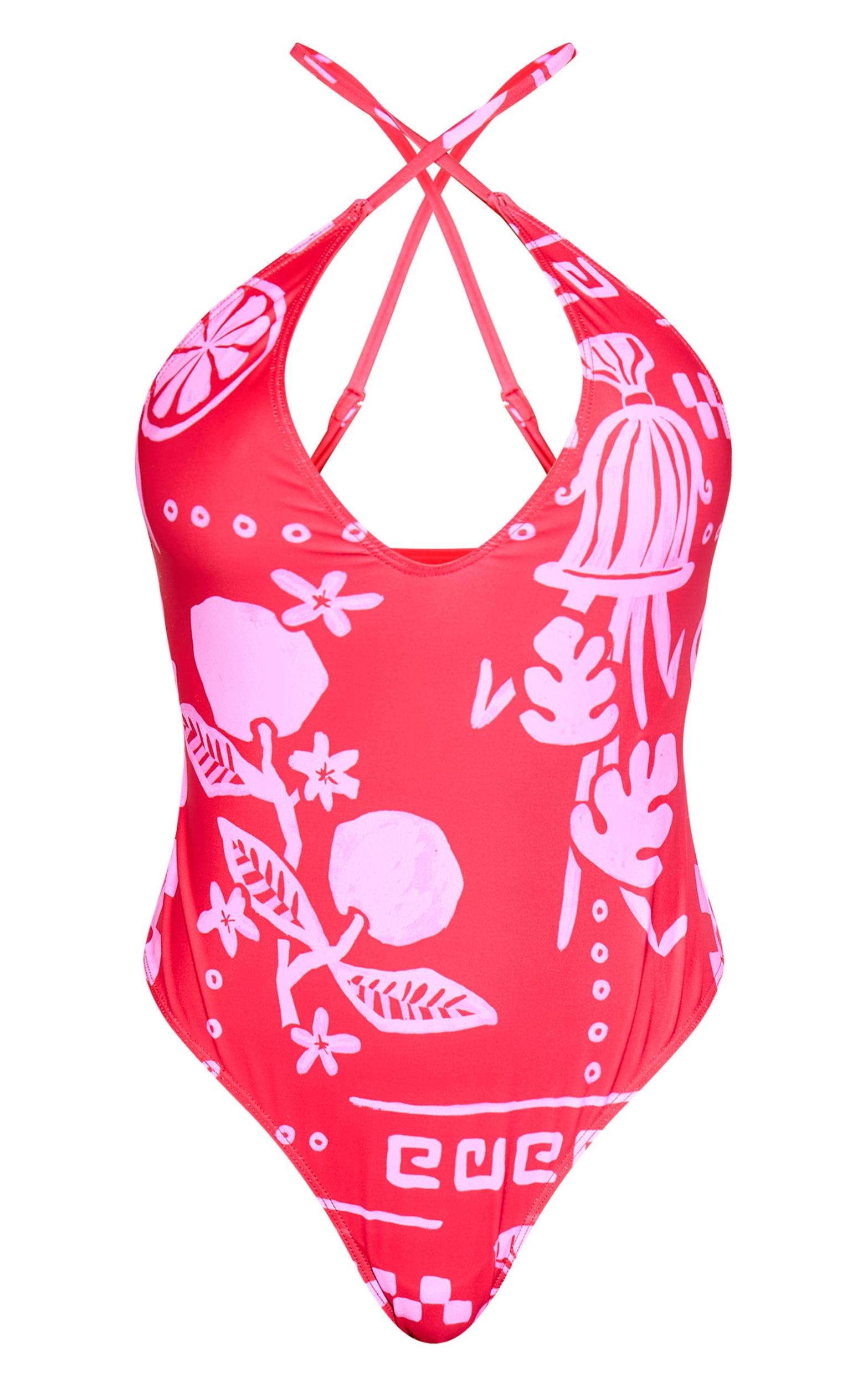 Have all eyes on you with this red tile print plunge swimsuit. This swimsuit is brought to you in a red tile print material with a plunge neckline and a figure-hugging fit, what's not to love? This swimsuit will have heads turning for all the right reasons. Style this with sandals and accessories for a vibe like no other. Length approx 66cm/26inch (Based on a sample size UK 8) Model wears size UK 8/ EU 36/ AUS 8/ US 4Model Height - 5ft 5inchp]:!mb-0inch>Category: SwimwearProduct type: SwimsuitColor: RedMaterial: SwimDesign: PrintSleeves: SleevelessOccasion: Day