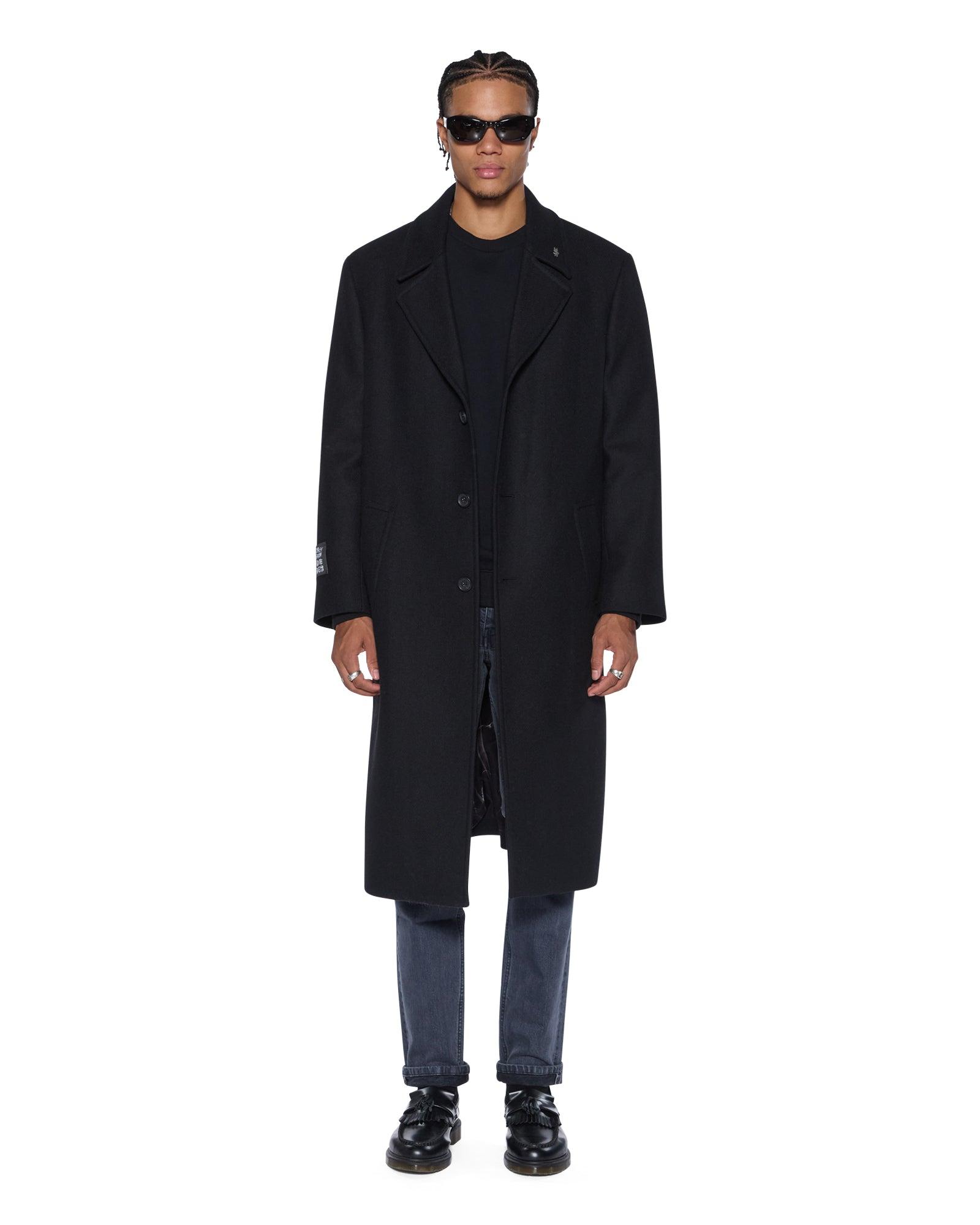 The Redemption Wool Coat is a relaxed fit, longline coat that brings sophisticated style to your everyday look. Featuring a single-breasted button closure, fully lined interior, and structured tailored sleeves, it offers a refined fit with added comfort. Front pockets and Ksubi branded hardware complete the sleek design, while the signature T-box and back 4x4 cross embroidery elevate the look. Finished with a woven sleeve tag. Made from a premium wool-blend fabric for warmth and durability.