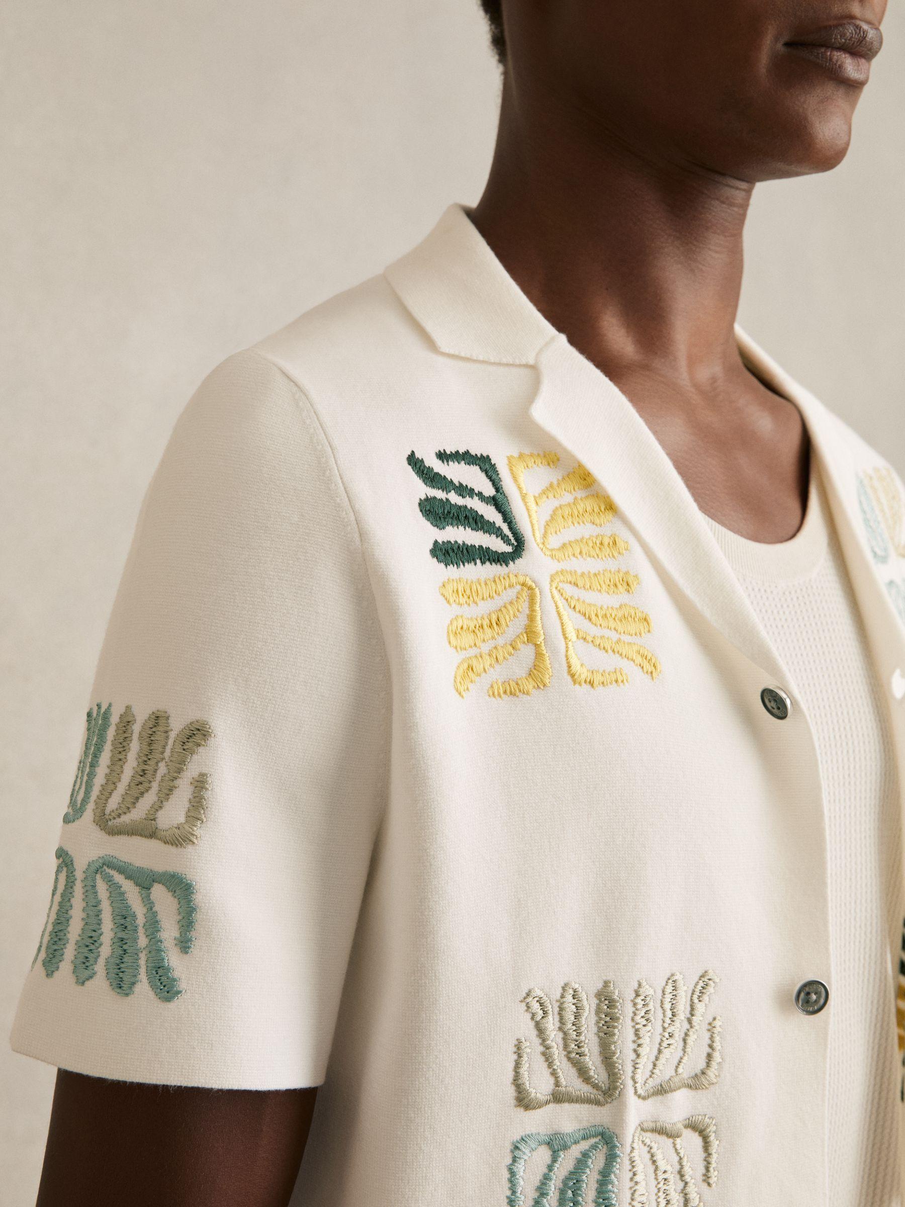 Multicoloured coral reef embroidery brings a summer-ready charm to the Pablo shirt. Crafted from a lightweight, compact knit, it’s finished with a relaxed Cuban collar and branded buttons for a signature touch. Coral reef embroidery. Cuban collar. Short sleeves. French button placket.