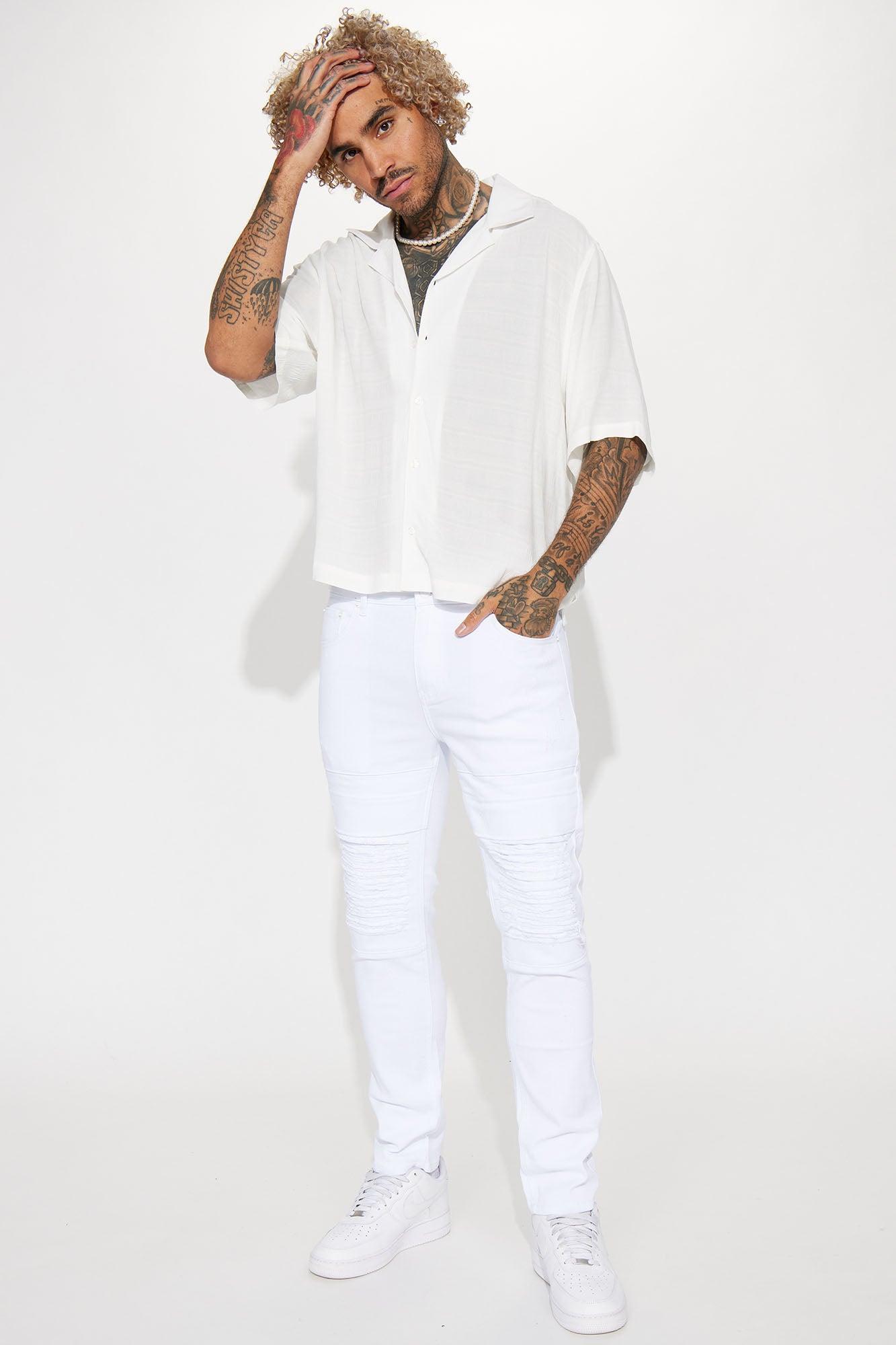 Available InWhite Button Closure Zip Fly 5 Pocket Body Knee Distressing With Backing 31' Inseam Disclaimer: Due To The Distressing Process, Each Garment Is Unique. 98% Cotton 2% Spandex Imported California Proposition 65WARNING: Cancer and Reproductive Harm - www.P65Warnings.ca.gov.