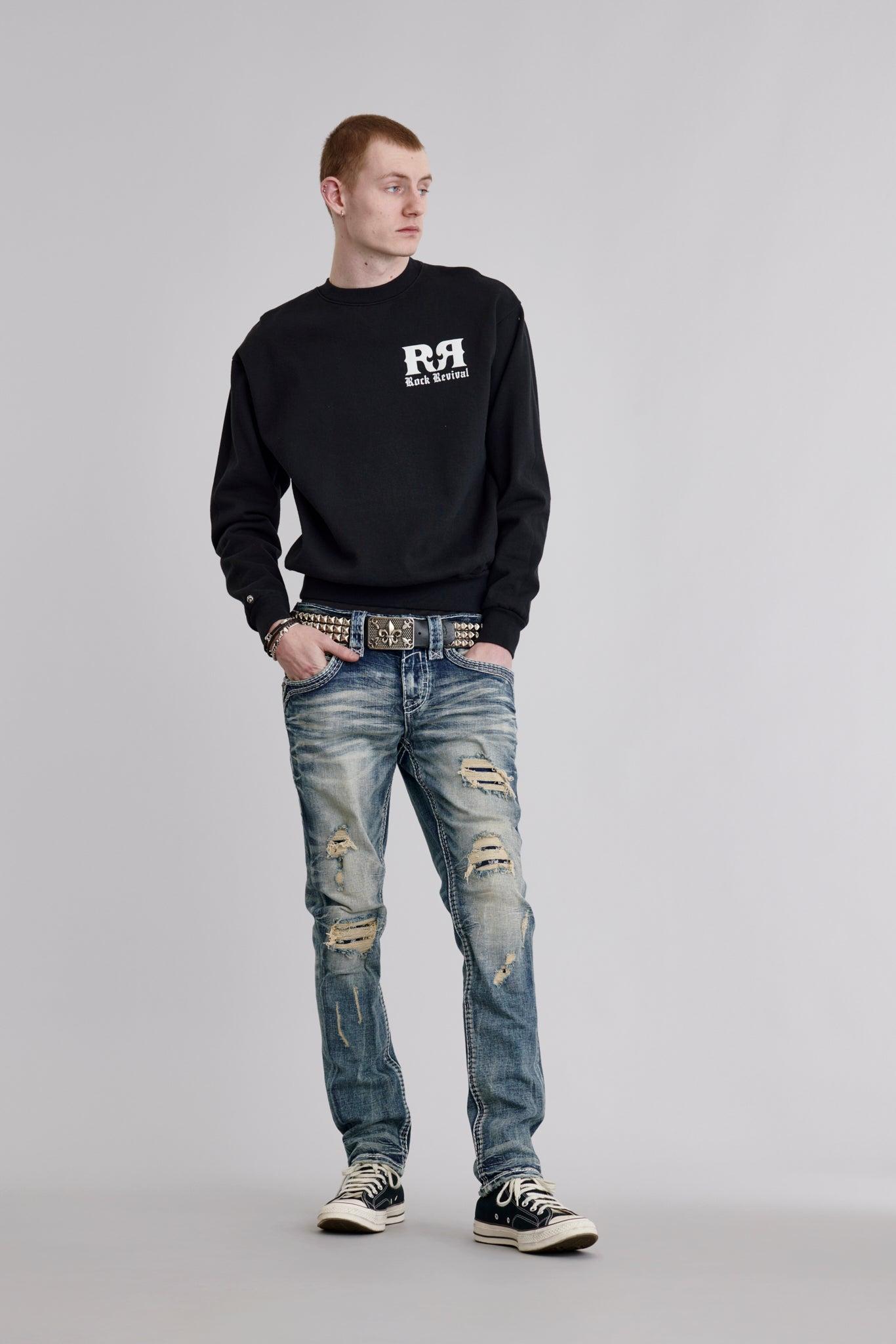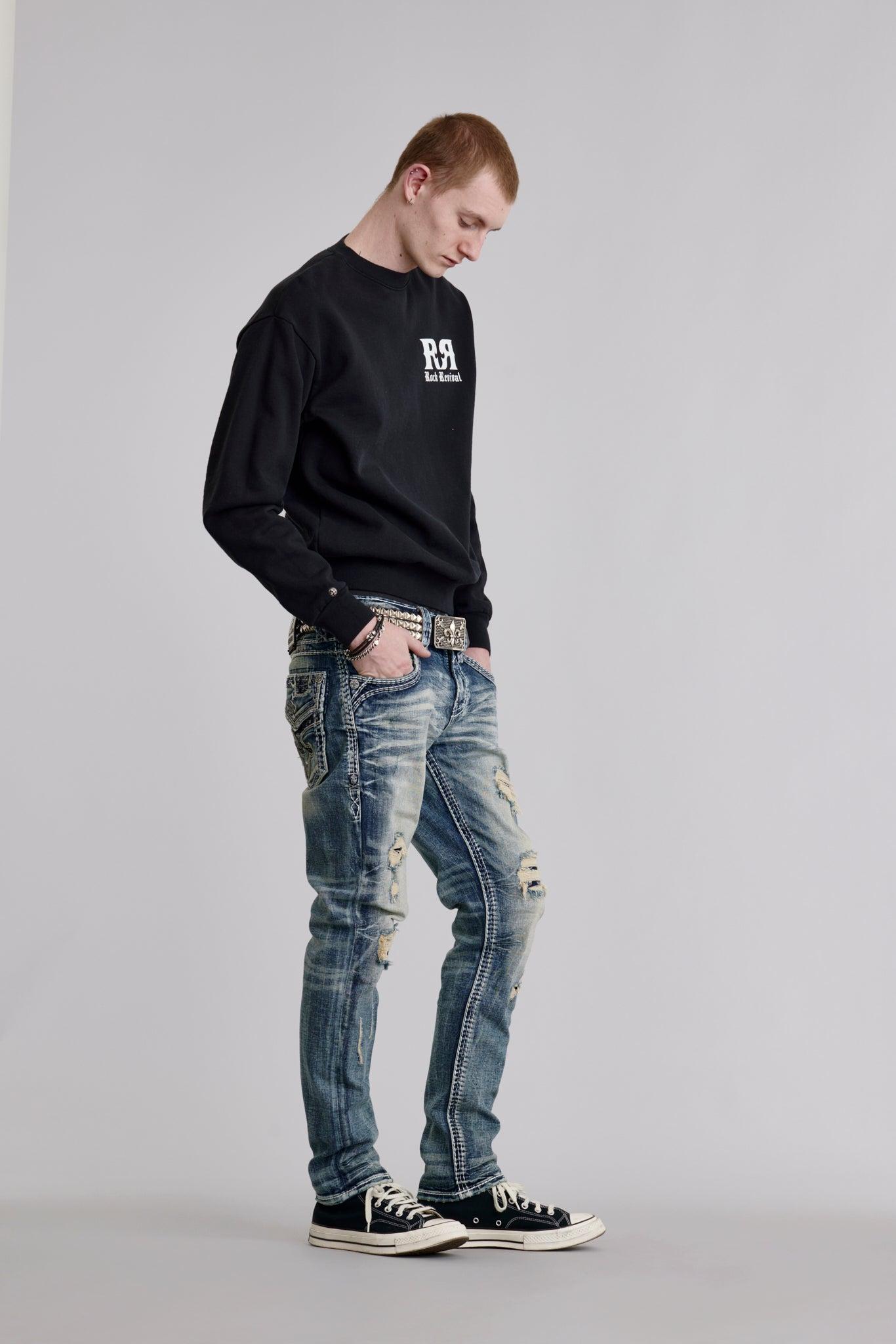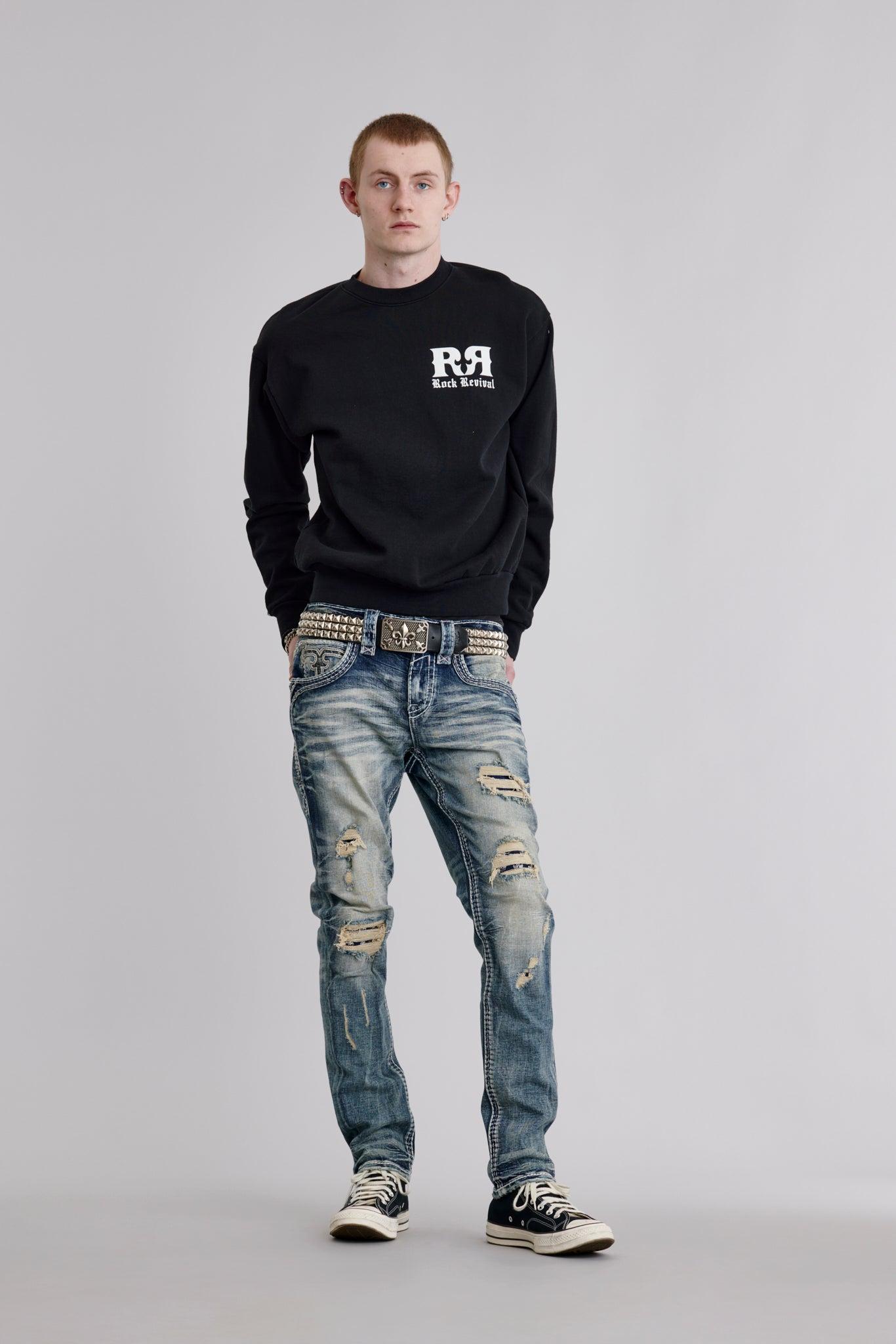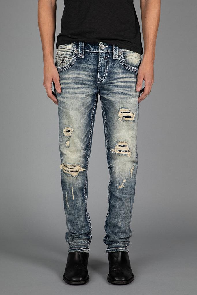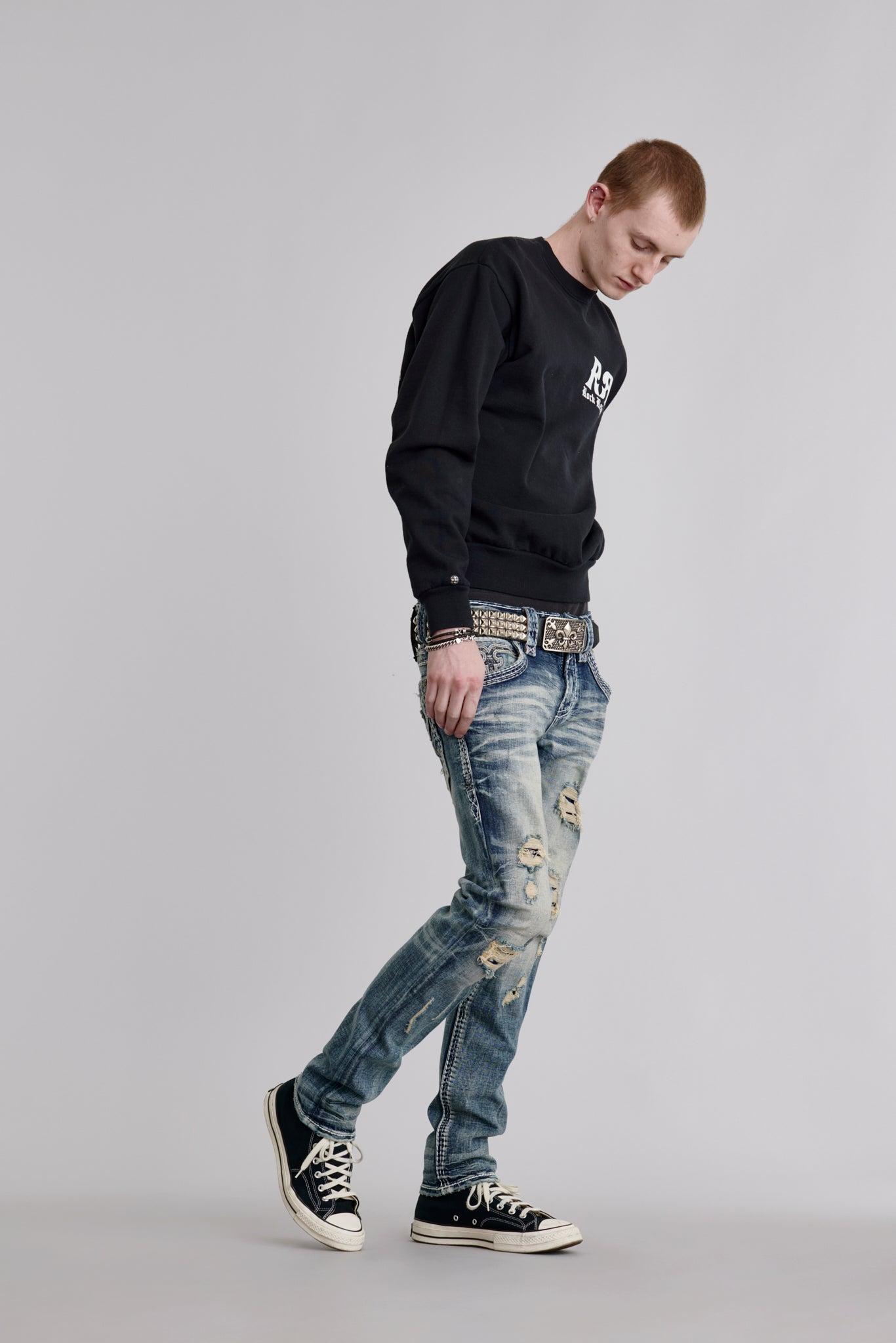 Silver hardware with skull face patches embroidered on pockets, featuring fraying details. Heavy distressing with patches on the front. Hand whiskers throughout for added texture. Designed with care and creativity in Los Angeles, California.