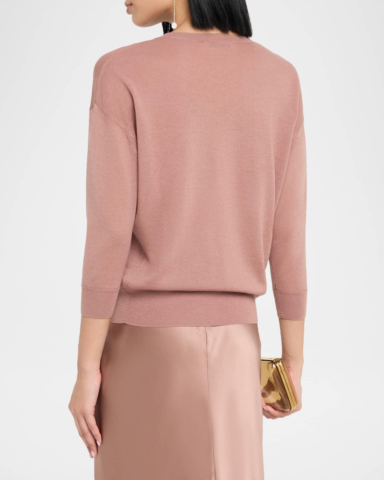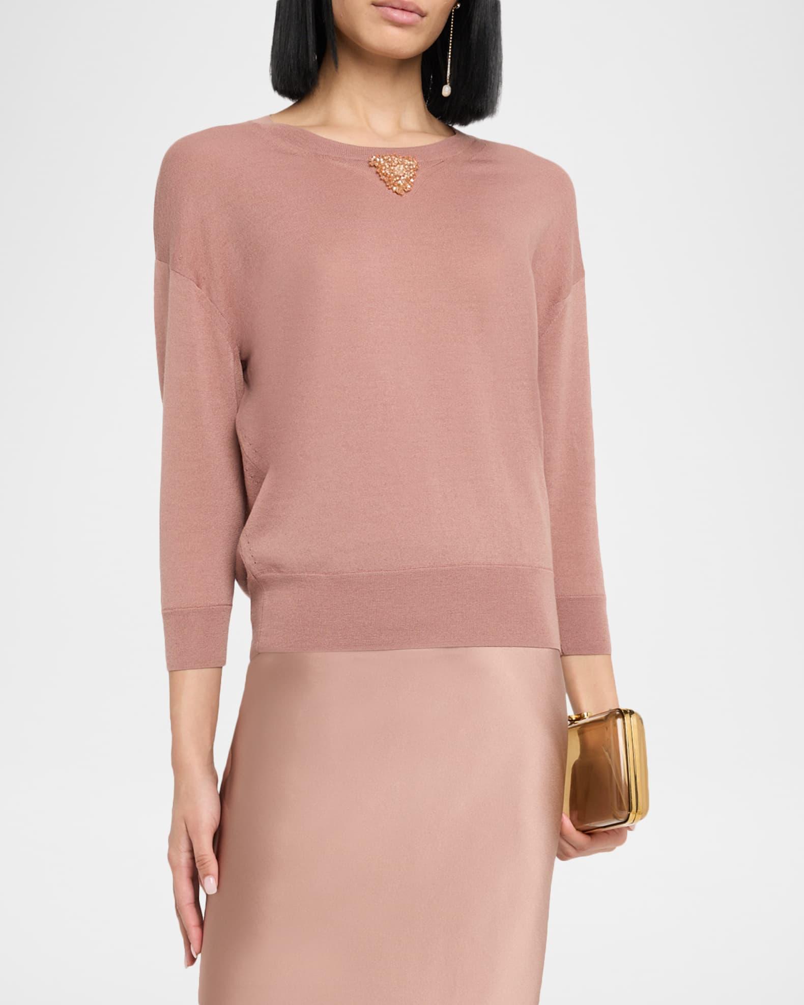 DOROTHEE SCHUMACHER "Refined Essentials I" fine knit pullover adorned with a standout beaded appliqué Approx. 22.5"L from shoulders to hem Crew neckline Drop shoulders 3/4 sleeves; approx. 15"L Relaxed fit Pullover style Merino wool/cotton Unlined Machine wash cold Trim: Rhinestone, beaded Imported