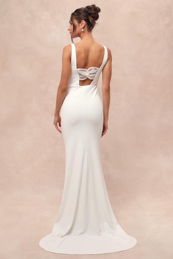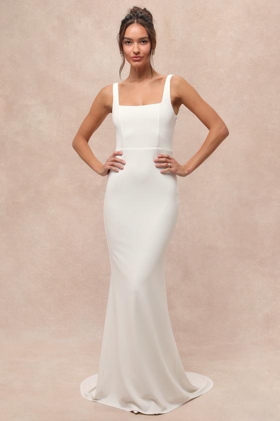 You'll be all set for the walk down the aisle with an all-around lovely look like the Lulus Regal Classic White Sleeveless Twist-Back Maxi Dress! All the chic minimalist brides out there will love this simple crepe knit gown that features a sleeveless, seamed bodice with a square neckline and organza straps that create a twisted-like design atop the otherwise open back, all supported by slender shoulder straps. The high, fitted waist tops a mermaid-inspired maxi skirt with a dramatic train that'll effortlessly trail behind you! Hidden side zipper/clasp.