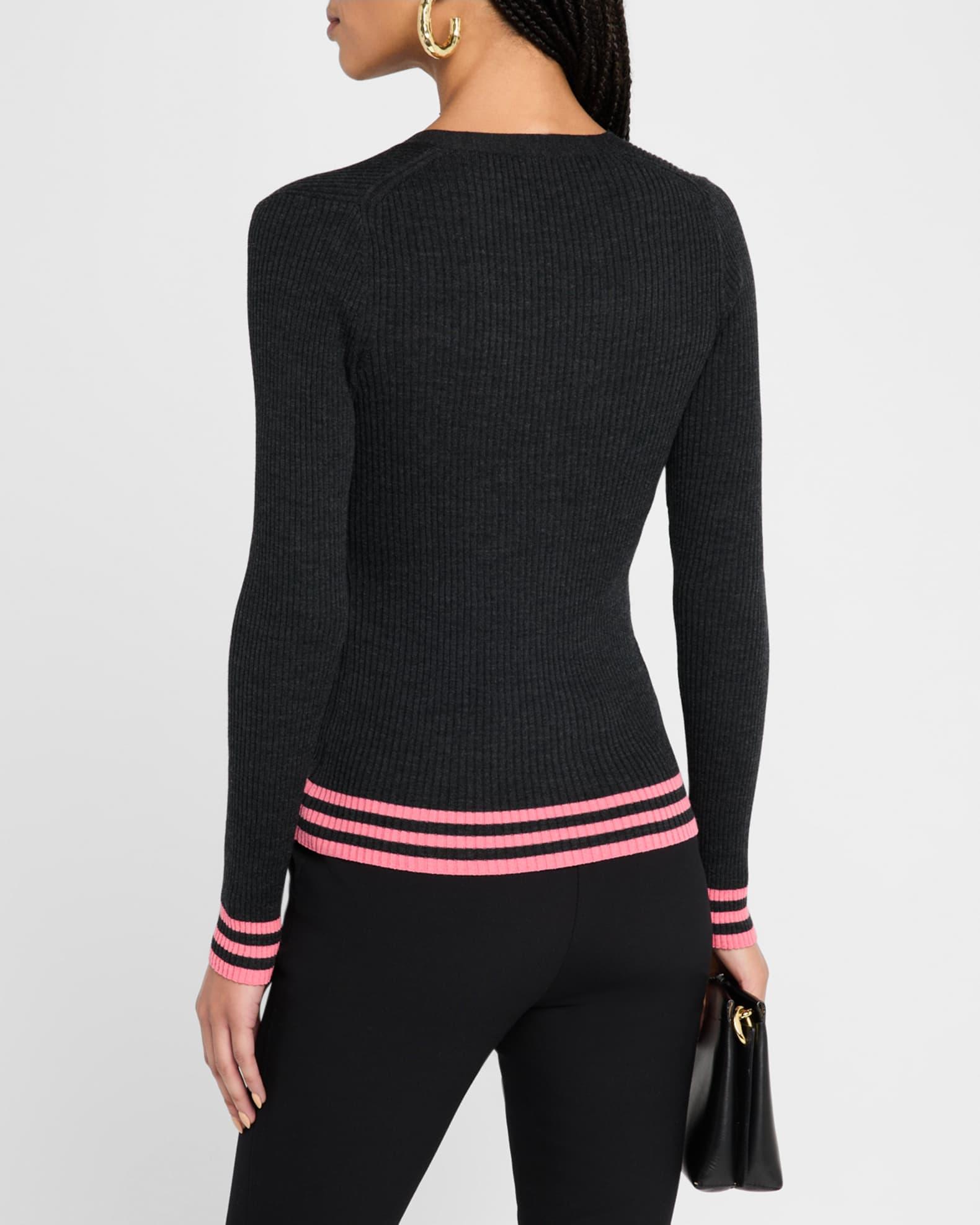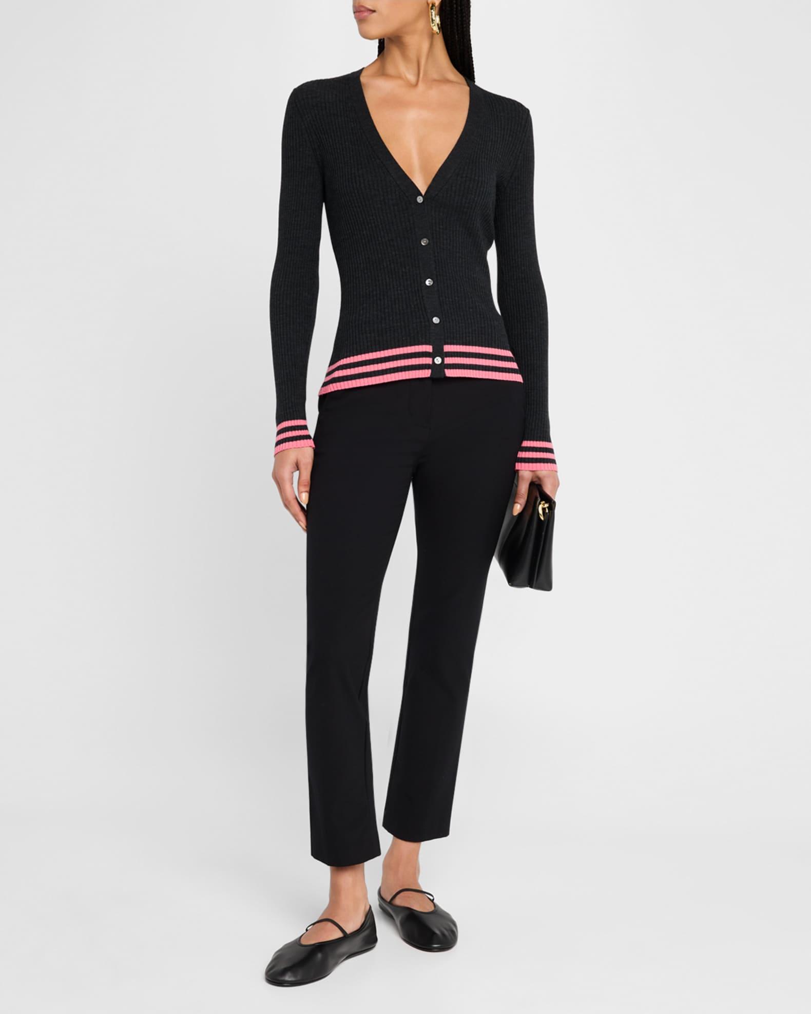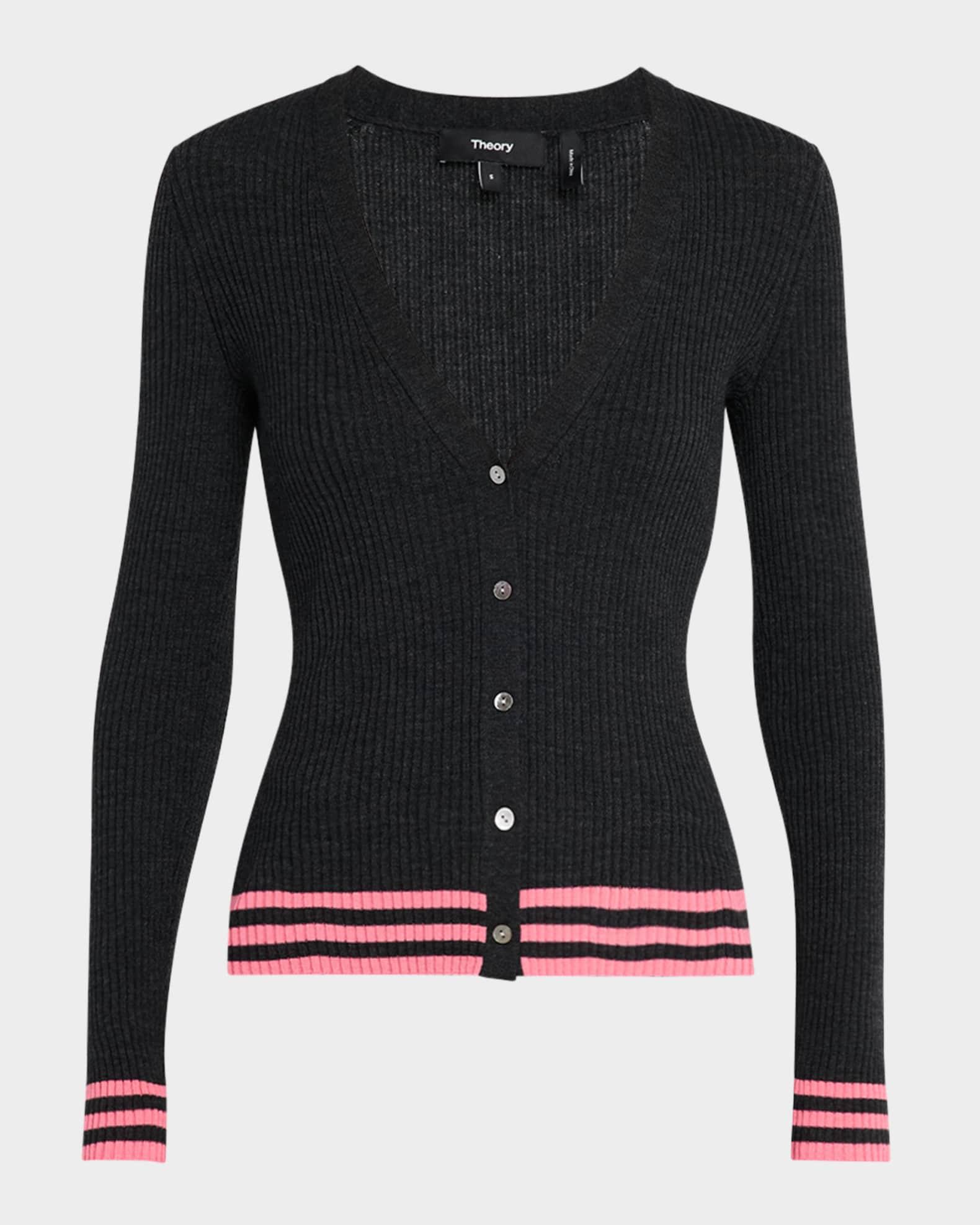 A slim V-neck cardigan in rib with contrast stripe detail at the bottom hem and cuffs. It can be worn as a set with a rib scoop-neck shell. Theory ribbed regal merino wool cardigan with contrast trim V neckline Long sleeves Slim fit Hem sits at the hip Button-front Wool Dry clean Imported