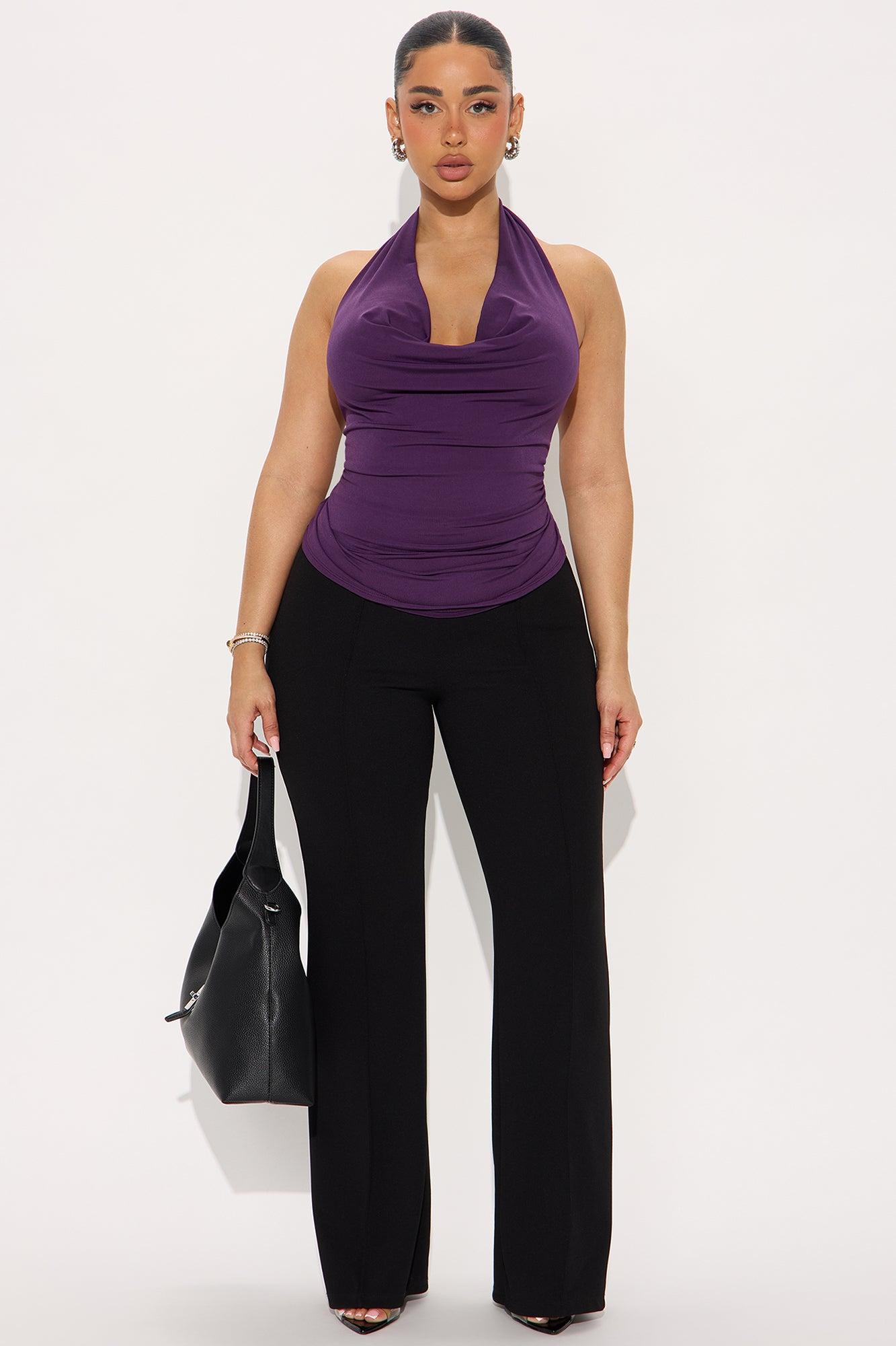Available In Plum. Halter Top Stretch Cowl Neck Self: 95% Polyester 5% Spandex Imported