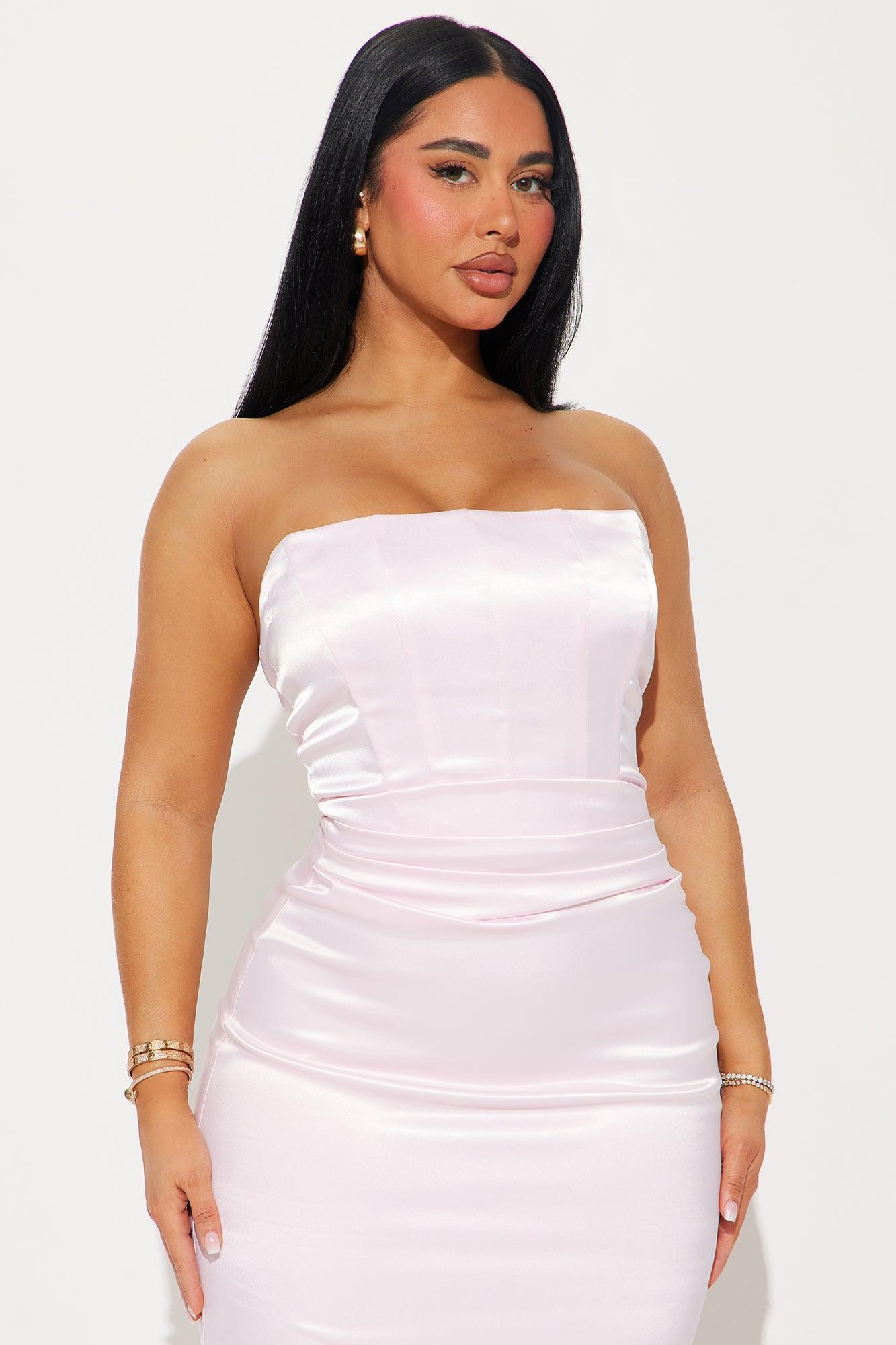 Available In Pink. Satin Maxi Dress Strapless Straight Neckline Corset Waist w/ Boning Hidden Back Zipper Stretch Shell: 95% Polyester 5% Spandex Lining: 97% Polyester 3% Spandex Imported