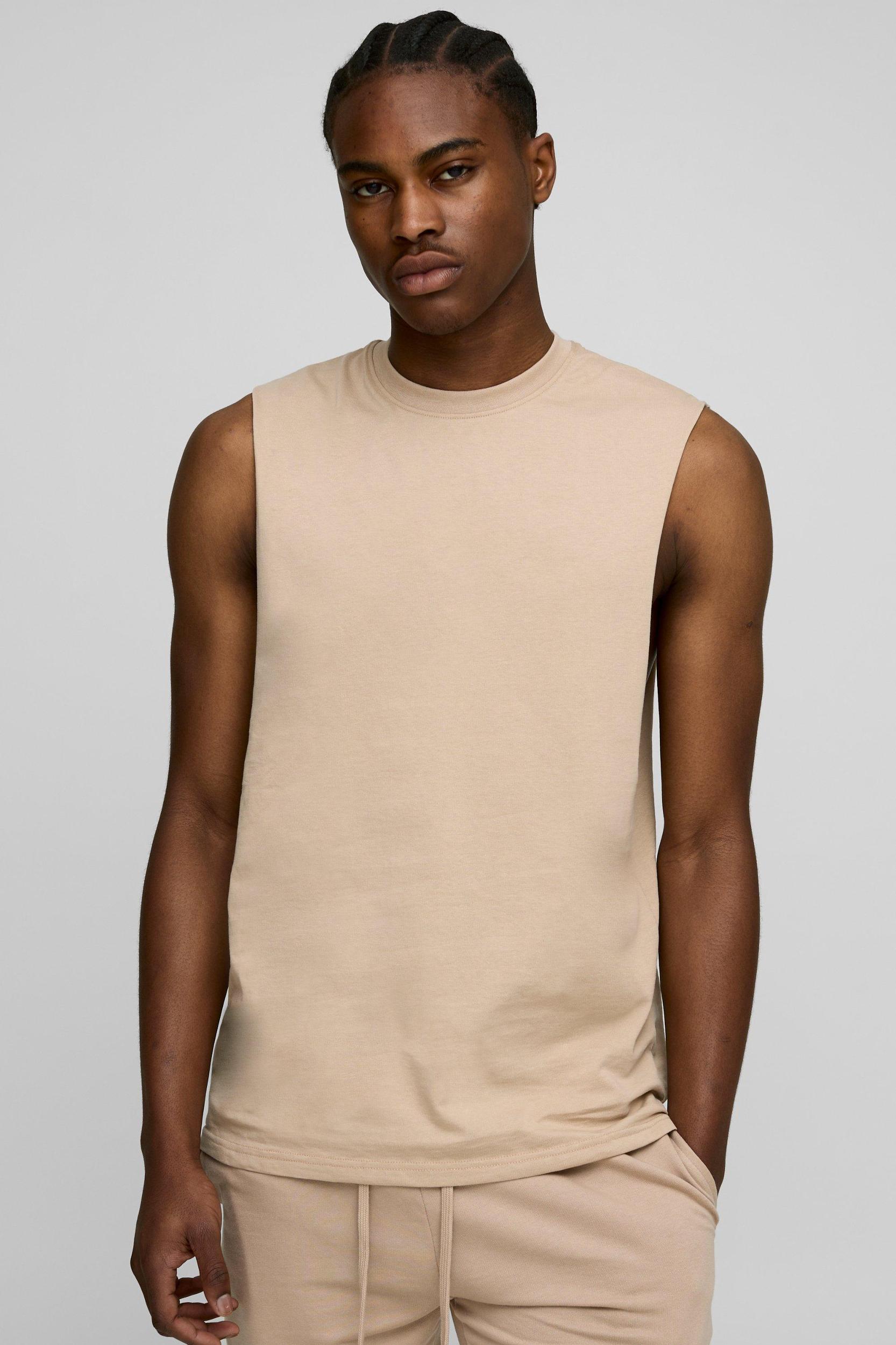 Mens Beige Regular Fit Basic Drop Armhole Tank - We all know about t-shirts and vests, light layers which have stood the test of time. T-shirts are a seasonless staple which gives your wardrobe a solid foundation to build off. Whether youre about a plain tee, printed, striped or long-sleeve or youre flexing something oversized for a comfortably casual look, make sure your outfits have the foundations they need with our range of tees and vests. Combine a plain white tee with denim and trainers for a versatile everyday outfit or pair with cropped trousers to secure minimalistic vibes.