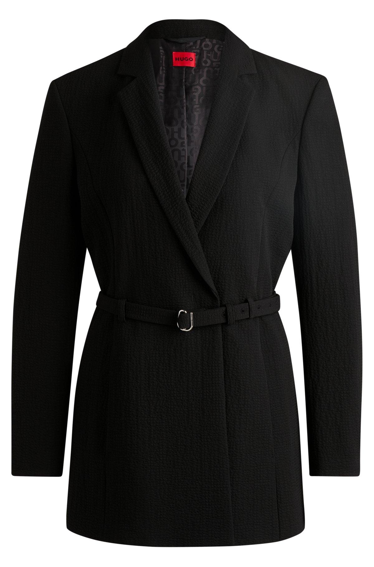 With a concealed closure and modern buckled belt, this HUGO Womenswear blazer is a contemporary tailored option. In breathable seersucker with a soft shoulder construction.