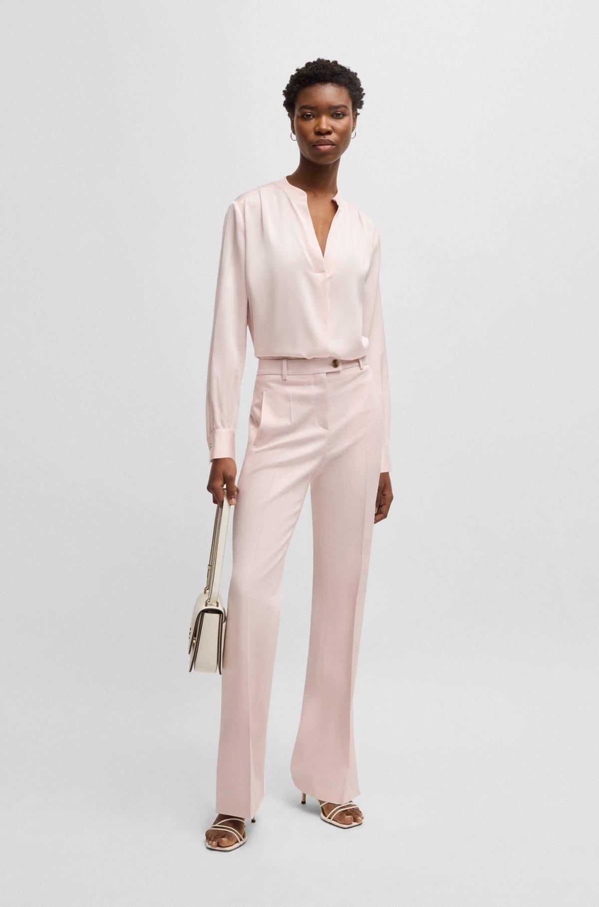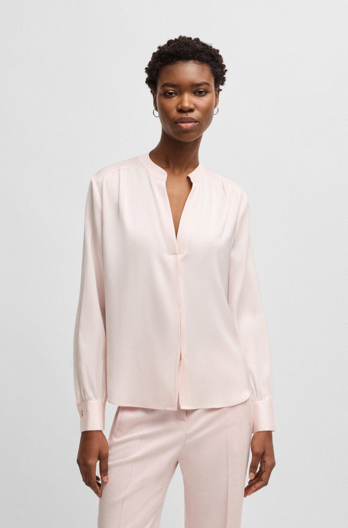 In fluid silk with stretch for comfort, this BOSS Womenswear blouse has collarless styling and a notch neckline. Easy regular fit.