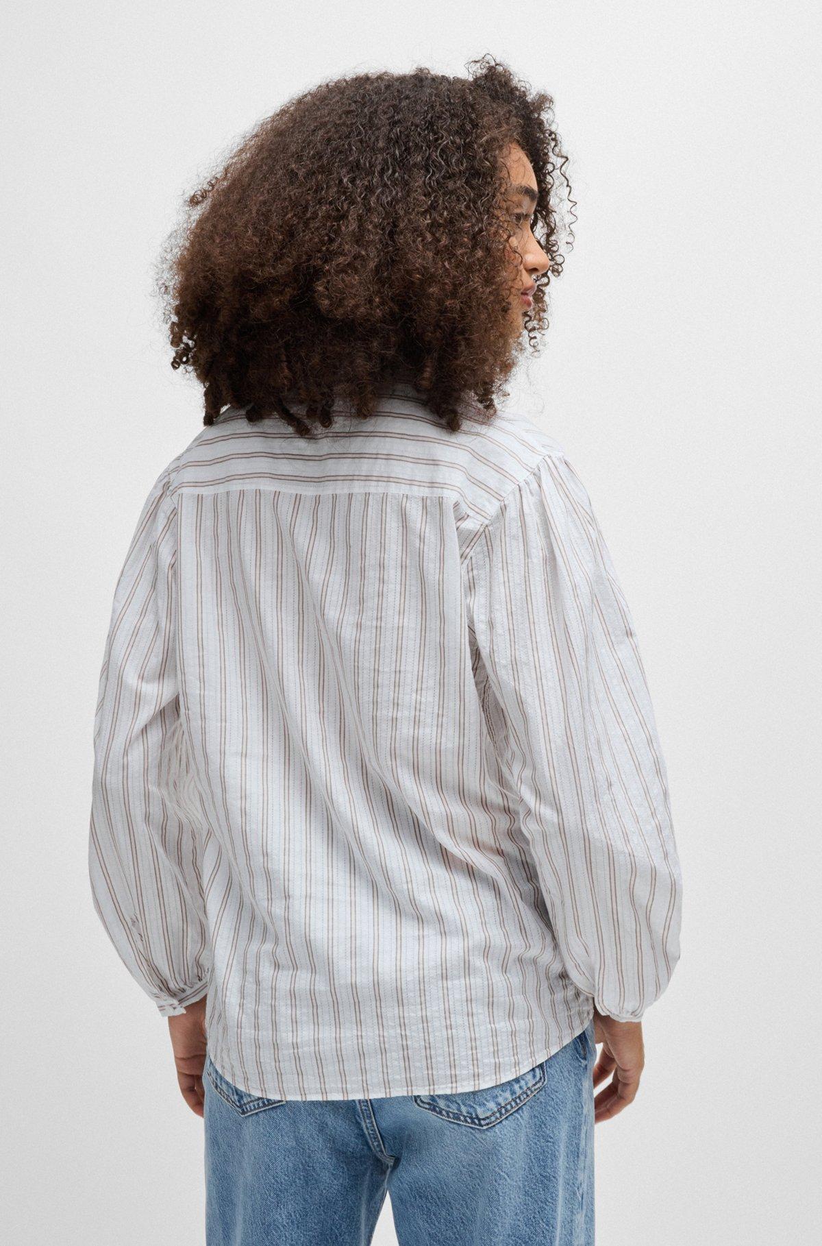 A regular-fit blouse by BOSS Womenswear. This collarless design is crafted in lightweight striped cotton poplin with feminine gatherings at the sleeves.