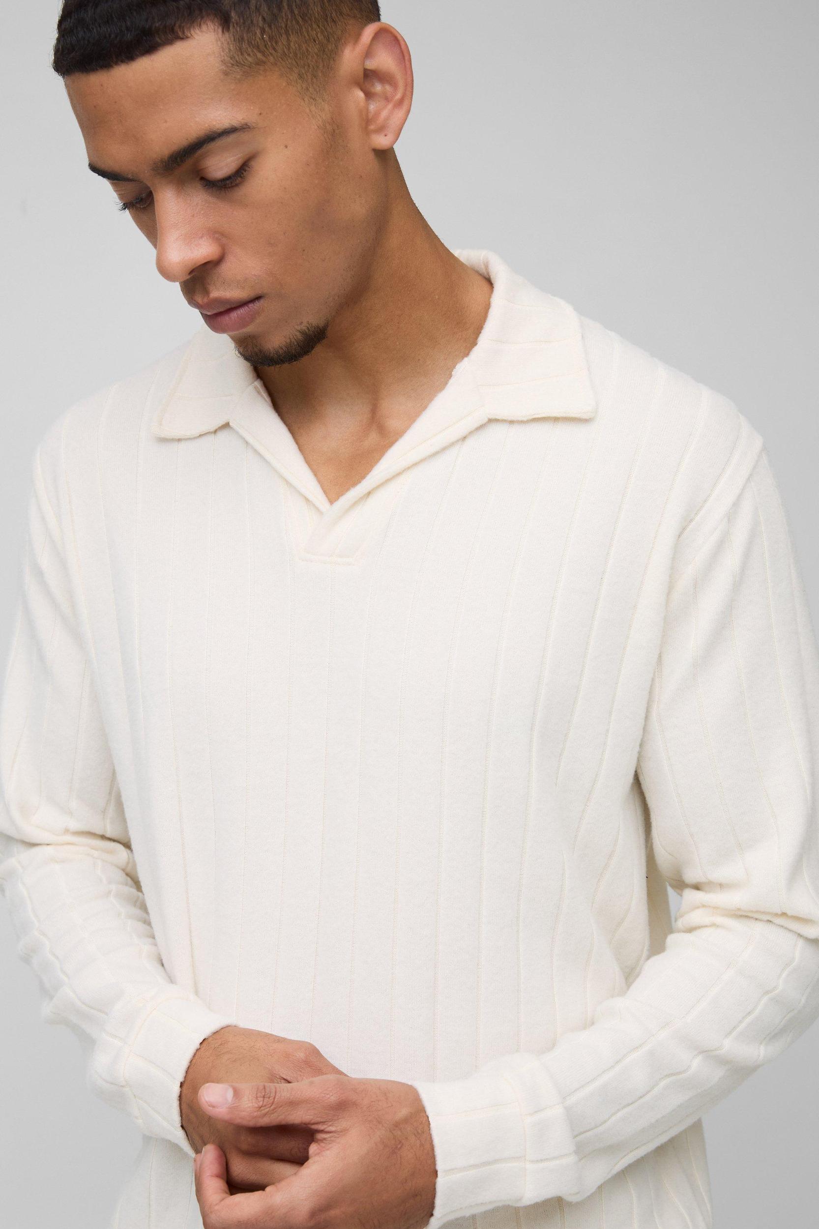 Mens Cream Brushed Wide Rib Revere Long Sleeve Polo - We all know about t-shirts and vests, light layers which have stood the test of time. T-shirts are a seasonless staple which gives your wardrobe a solid foundation to build off. Whether youre about a plain tee, printed, striped or long-sleeve or youre flexing something oversized for a comfortably casual look, make sure your outfits have the foundations they need with our range of tees and vests. Combine a plain white tee with denim and trainers for a versatile everyday outfit or pair with cropped trousers to secure minimalistic vibes.