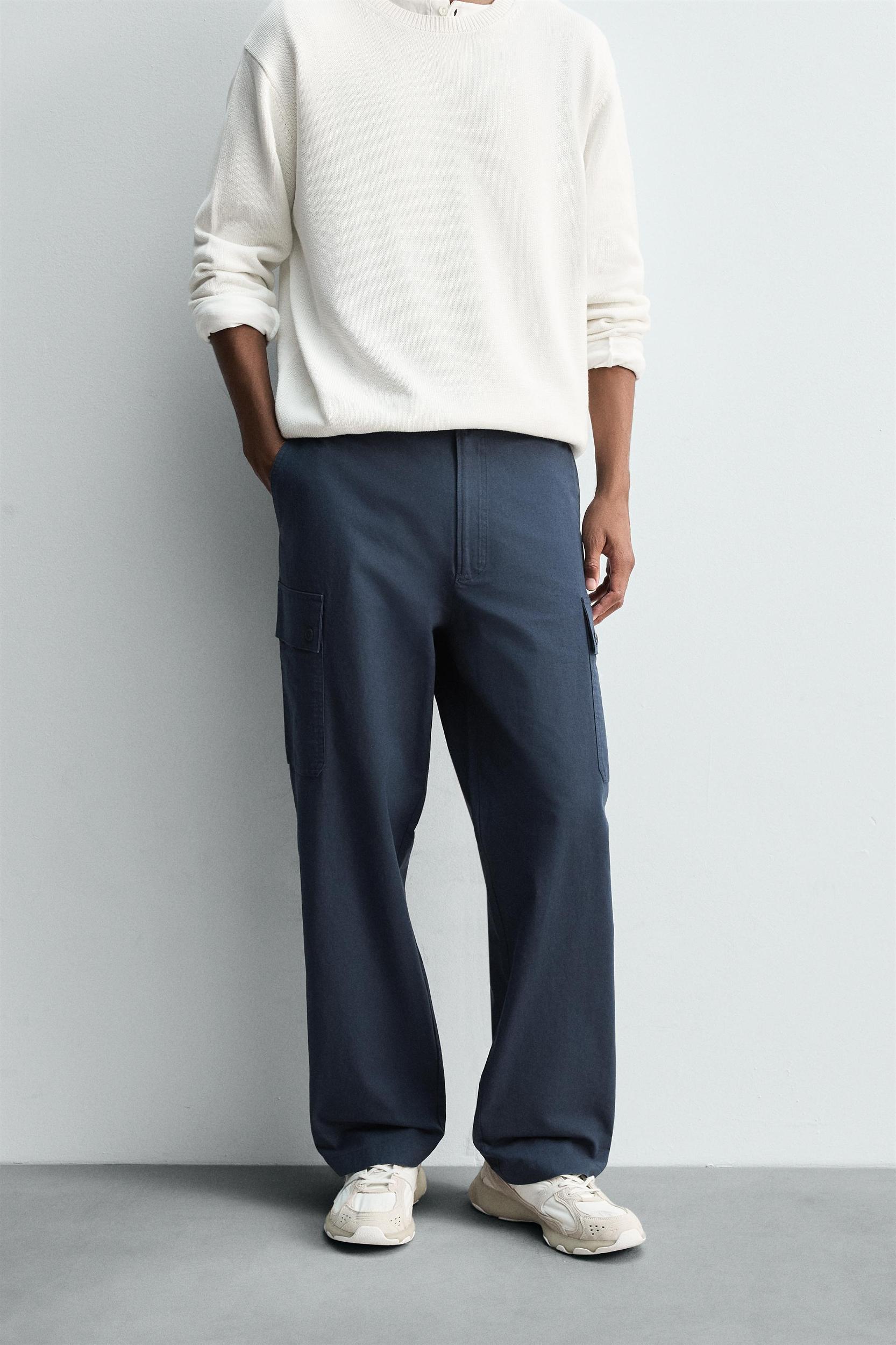 Regular fit pants made of lightweight cotton fabric. Front pockets and welt back pocket detail. Patch pockets with flaps on legs. Front zip and button closure.