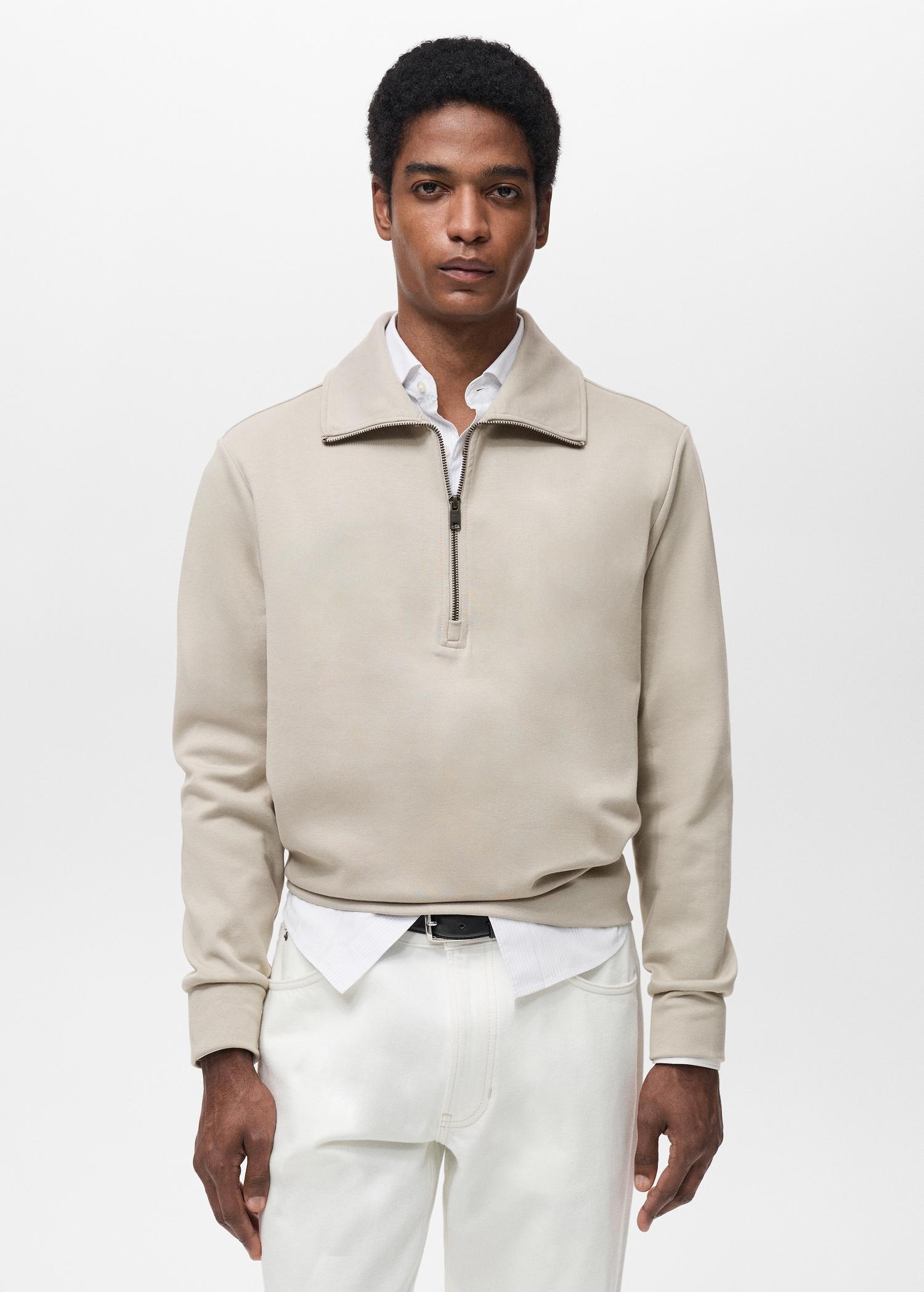ESSENTIALS: Made to last. The brown color is an online exclusive. Cotton blend fabric. Regular fit. Funnel neck with zip fastening. Long sleeve with elastic cuffs. Elastic hem. The model is 190 cm tall and wears a size M. Back length 28.54 in