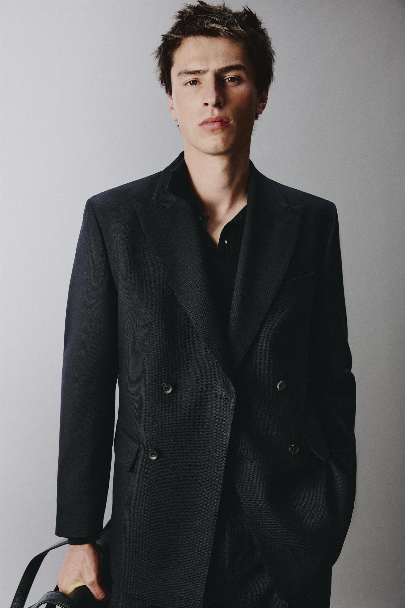 Regular fit blazer. Pointed lapel collar and long sleeves with buttoned cuffs. Welt pockets at chest and flap pockets at hip. Interior pocket. Back vents. Double breasted front button closure.
