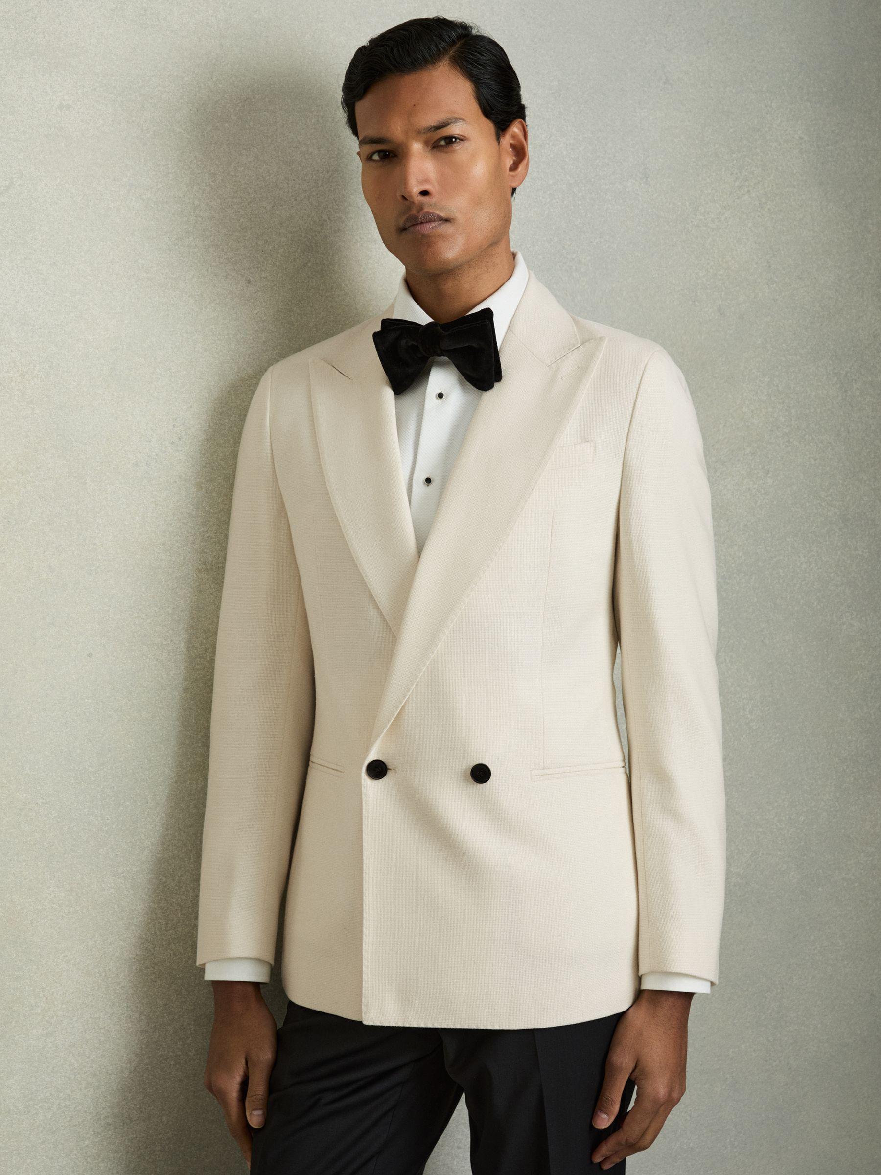 With its refined low break and two-button fastening, the Knight double-breasted blazer exudes a sophisticated, formal aesthetic. Crafted from a luxurious wool-blend with a subtle textured finish, it is tailored to a sharp slim fit, complemented by peak lapels and a double vent at the reverse for both ease of movement and timeless elegance. Wool-blend fabric. Textured finish. Slim fit. Two-button front with low break. Peak lapels. Double vent at reverse. The model is wearing a size 38. Description: Measurements of model: 6ft2” / 189cm.