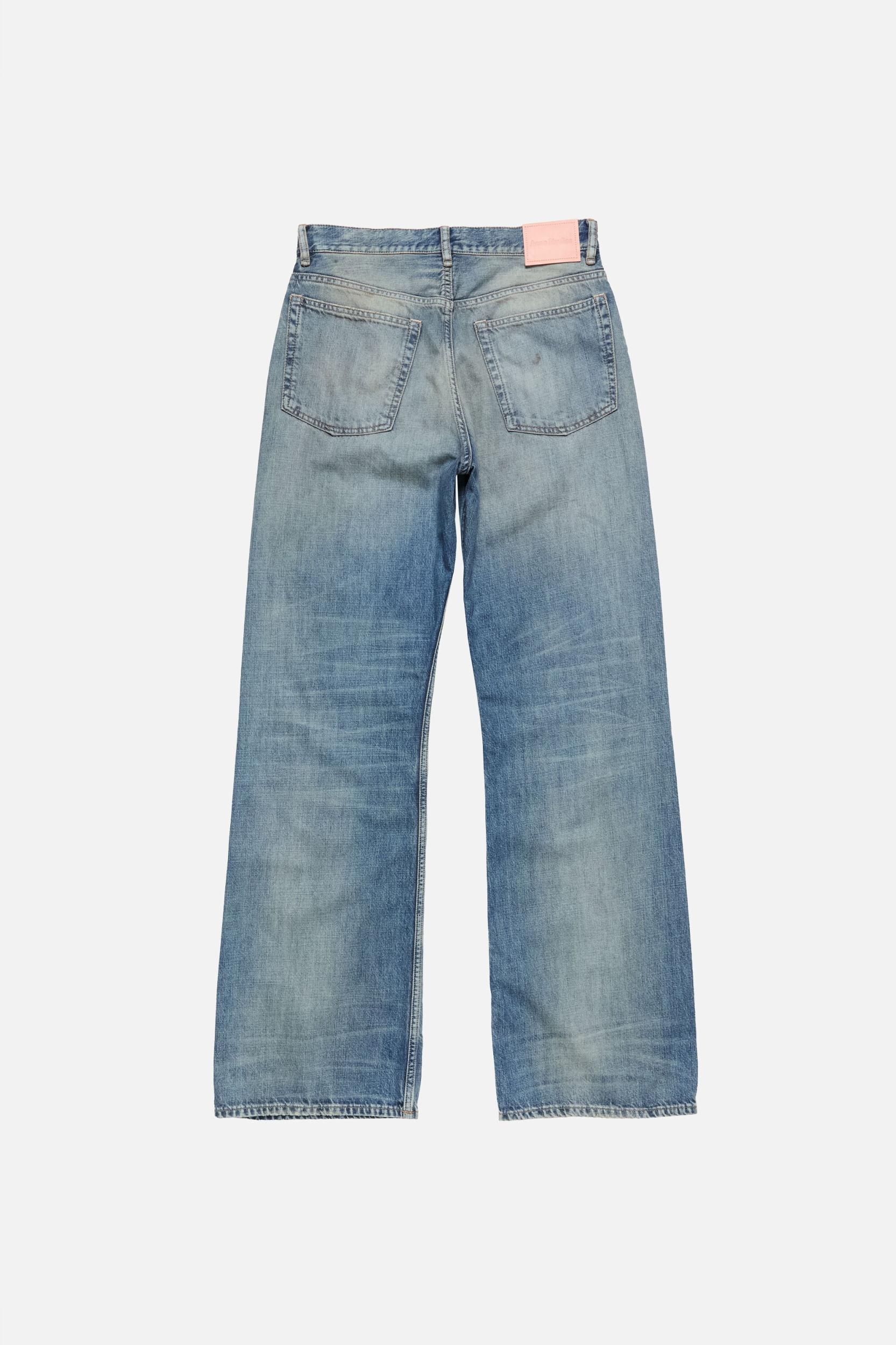 Jeans crafted from indigo blue non-stretch denim with an evident weave and a pale vintage wash , finished with hand distressing for an authentic worn-in effect. 2021 jeans are cut to a regular fit with a mid-rise waist, and wide straight leg with a slight flare from the knee. Acne Studios 2021F Daybreak