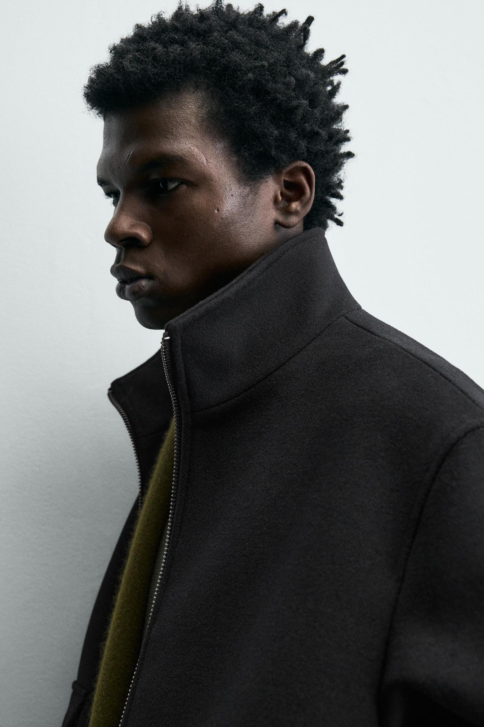 Regular fit jacket made from a wool and 10% cashmere fabric. High collar and long sleeves. Flap patch pockets at hip and interior pocket detail. Ribbed trims. Front zip closure.