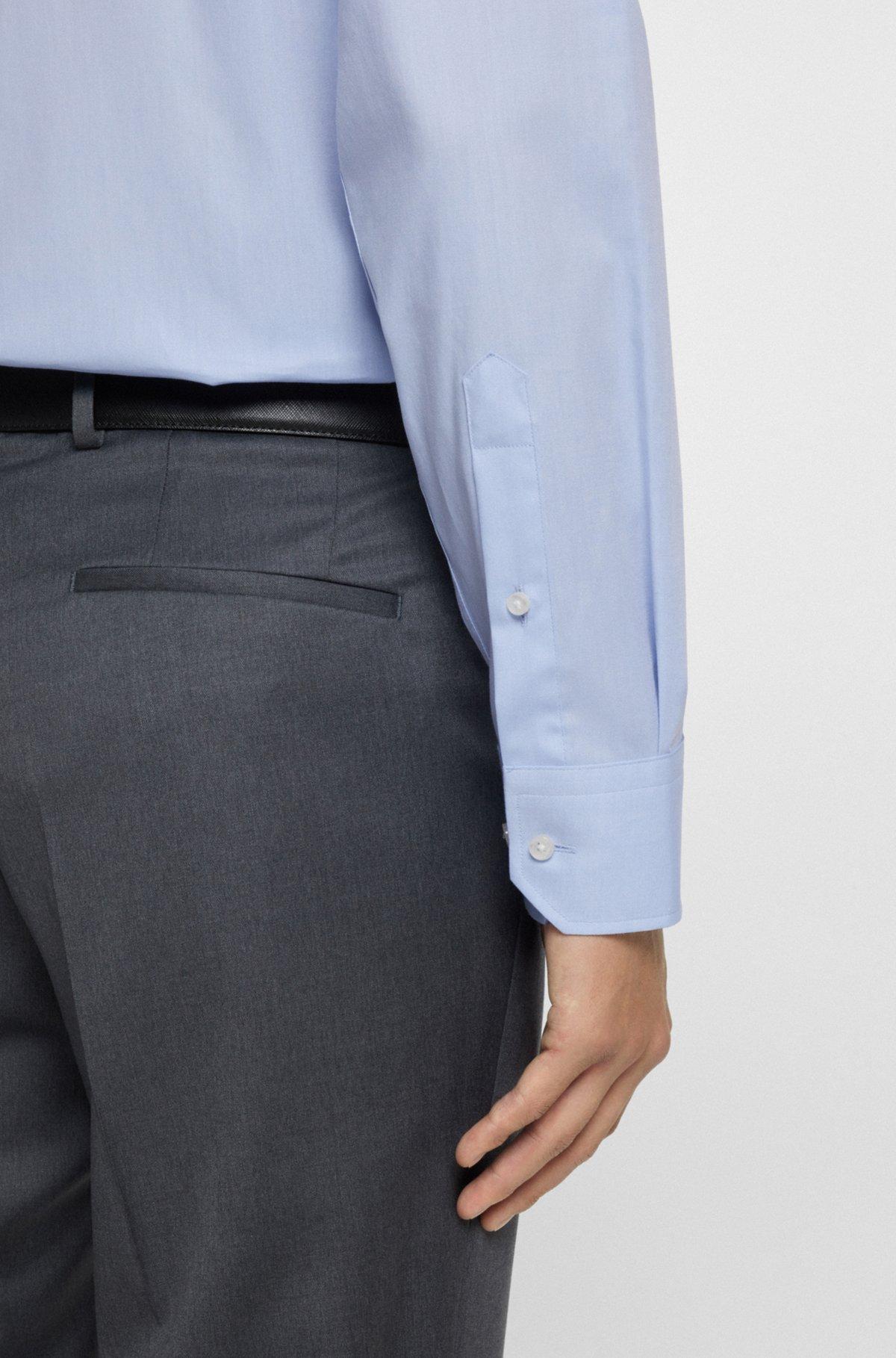 A refined business shirt by BOSS Menswear. Trimmed with a signature stripe inside the spread collar, this regular-fit shirt is crafted in soft cotton blended with stretch and woven with a twill structure. A contrast button at the base of the placket completes this elegant piece.